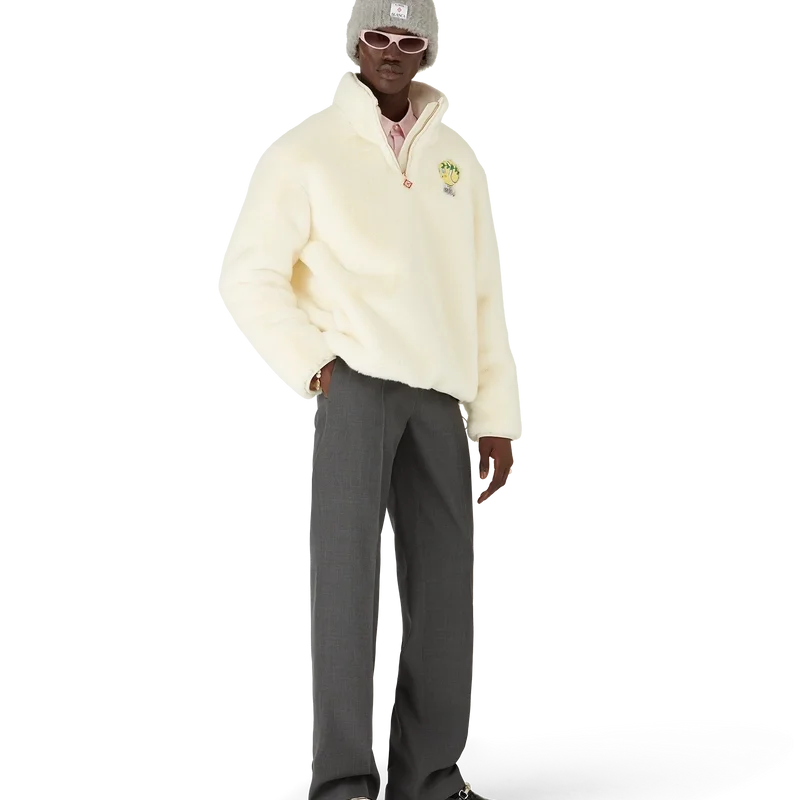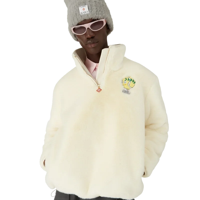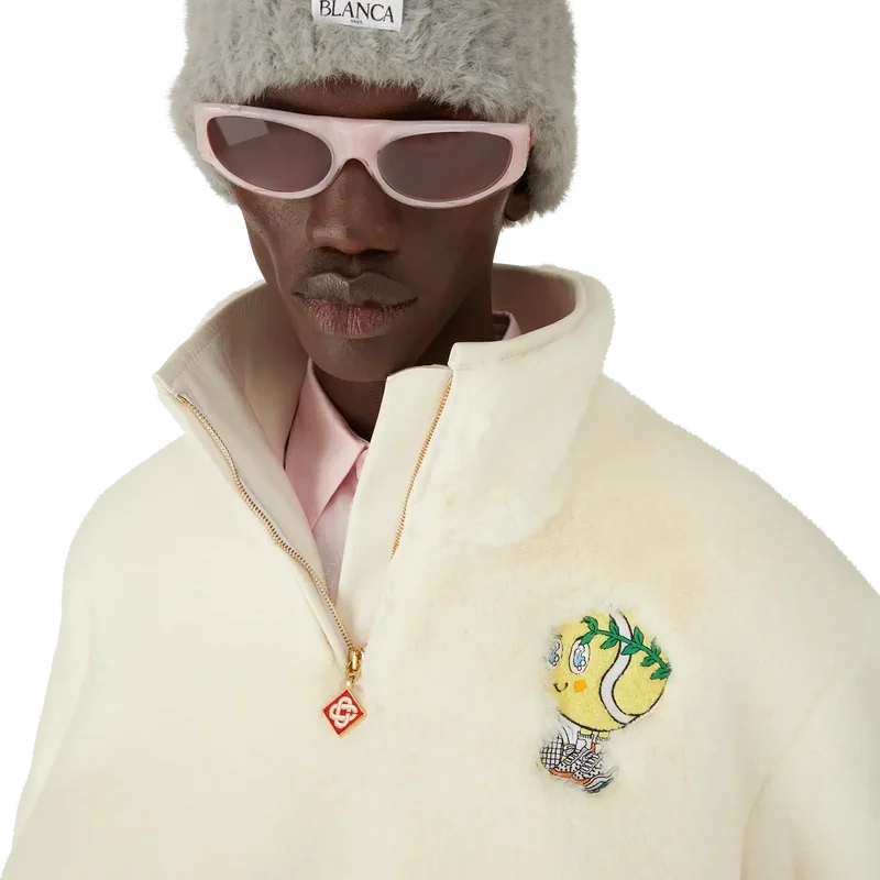 Het Tennis Mascot Quarter Zip Faux Fur Jacket is een ontwerp met lange mouwen en een seizoensgebonden print van de Kawaii-tennisbal – dit personage is een belangrijk onderdeel van ons universum. Het bevat elementen zoals het laurierblad, de Atlantis-sneaker, het racket en de Kawaii-ogen. We hebben ervoor gekozen om dit personage als centrale print te gebruiken voor alle herenmodellen in de collectie. Afgewerkt met een ritssluiting met het kenmerkende diamantlogo van het huis op het ritslipje en een leren placket, een trechterkraag met leren voering en Casablanca-tape aan de manchetten en zoom.