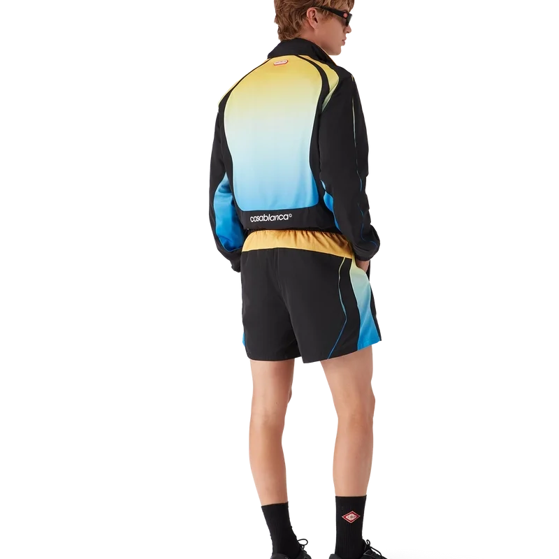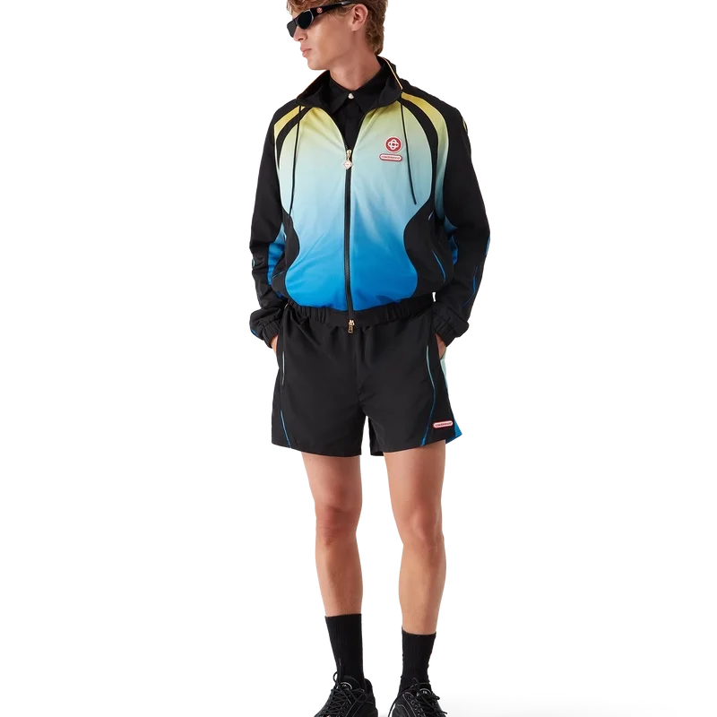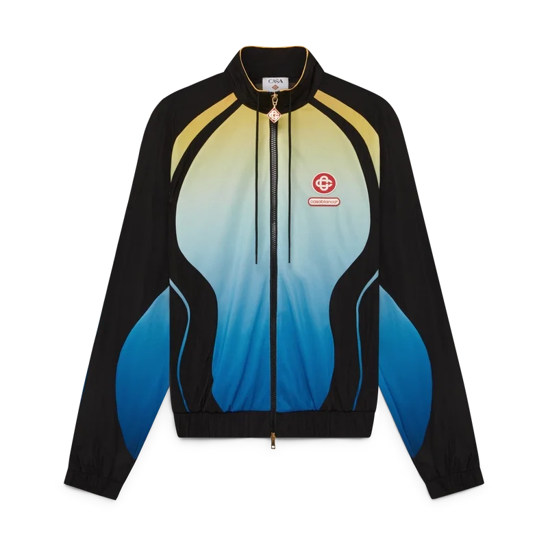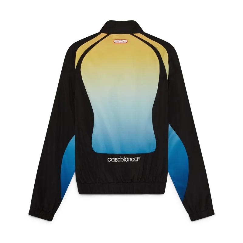 Het Gradient windjack is een sportief ontwerp met lange mouwen, voorzien van het kenmerkende in elkaar grijpende CC-logo van het huis en de Casablanca-logopatch, in onze traditie van het herinterpreteren van de krachtige natuurlijke kleurenpaletten van de natuur – Ons seizoensgebonden kleurverloop is geïnspireerd op de levendige en opvallende natuurlijke tinten van pijlgifkikkers. De gedurfde schakeringen van blauw naar geel staan in de natuur symbool voor een waarschuwing en worden met dezelfde opvallende intentie gebruikt in onze prints en sportkledingstijlen, gecombineerd met diepzwarte panelen in organische, vloeiende vormen die de kenmerkende patronen van deze dieren nabootsen.
