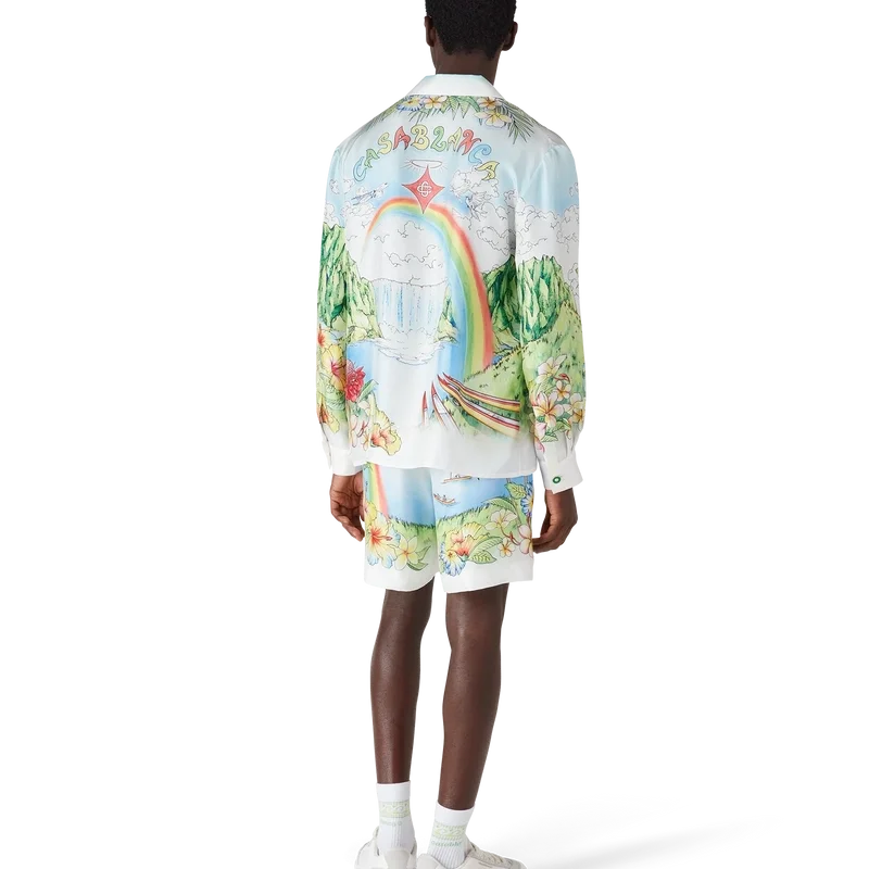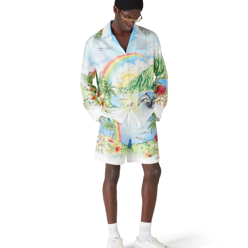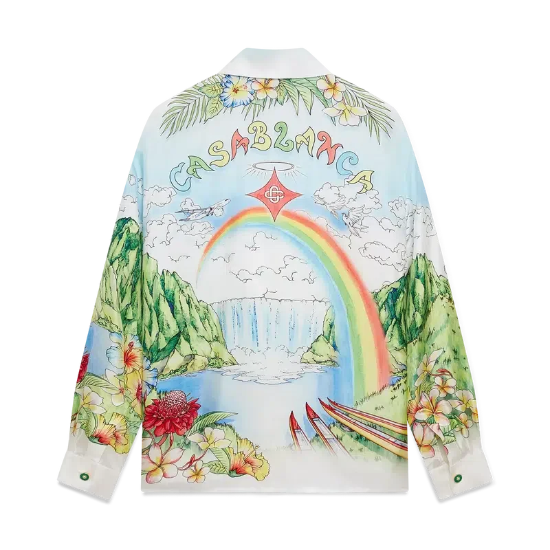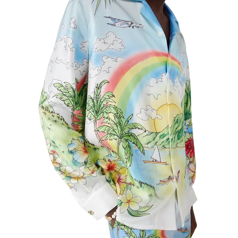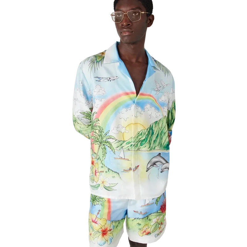 Het Aloha-overhemd met lange mouwen toont een levendige, geschilderde afbeelding van Kauai, Hawaii, met zijn bergachtige paradijs, watervallen, speelse dolfijnen, kano’s en een regenboog, en een overdreven weergave van de schoonheid van het landschap. Afgewerkt met een kraag, knoopsluiting, Cc-logo-knopen en de kenmerkende parelknop met gouden rand aan de manchetten, en verfijnde details die de luxe sport- en vrijetijdscodes van het merk weerspiegelen.