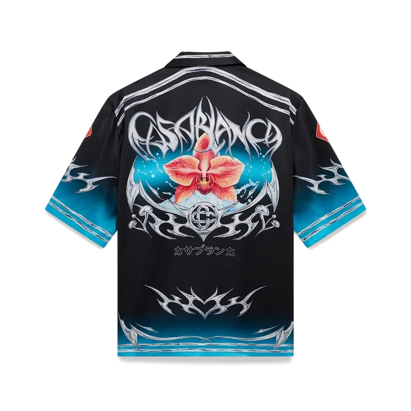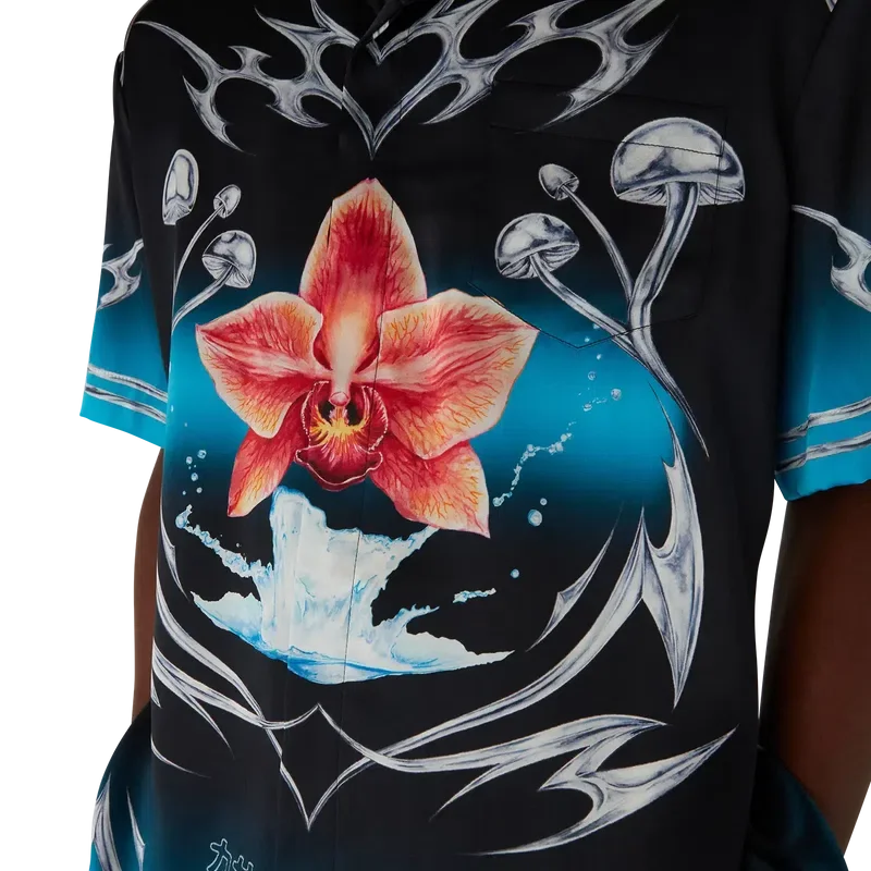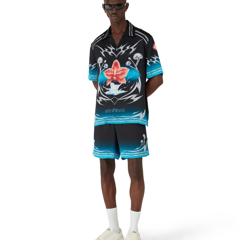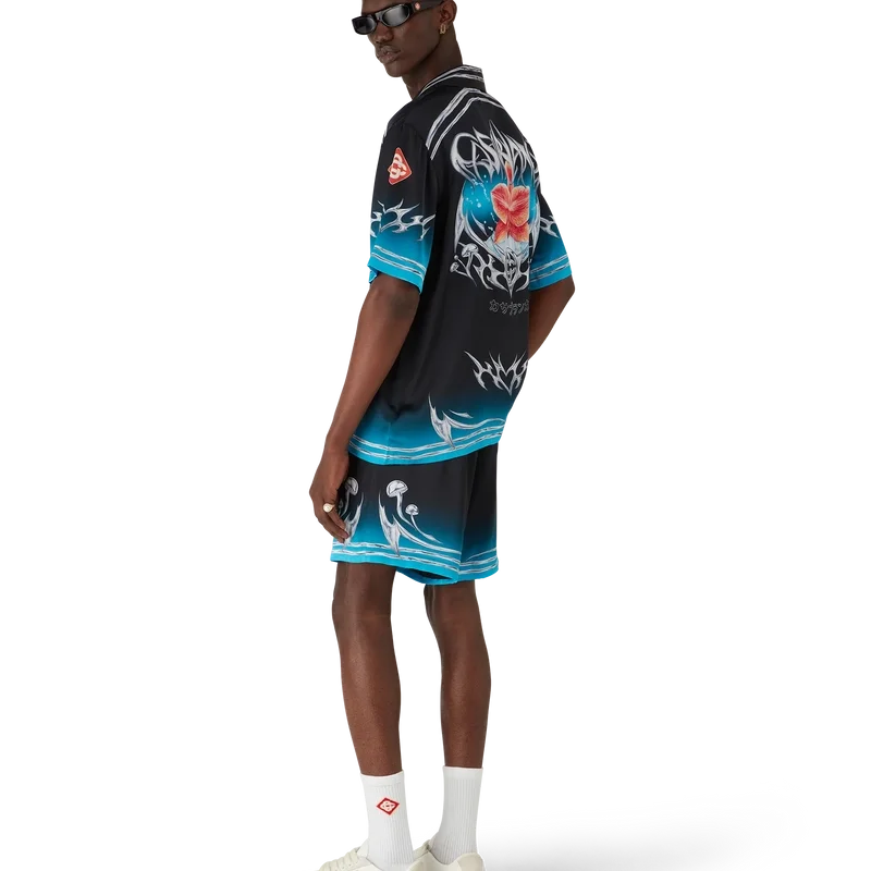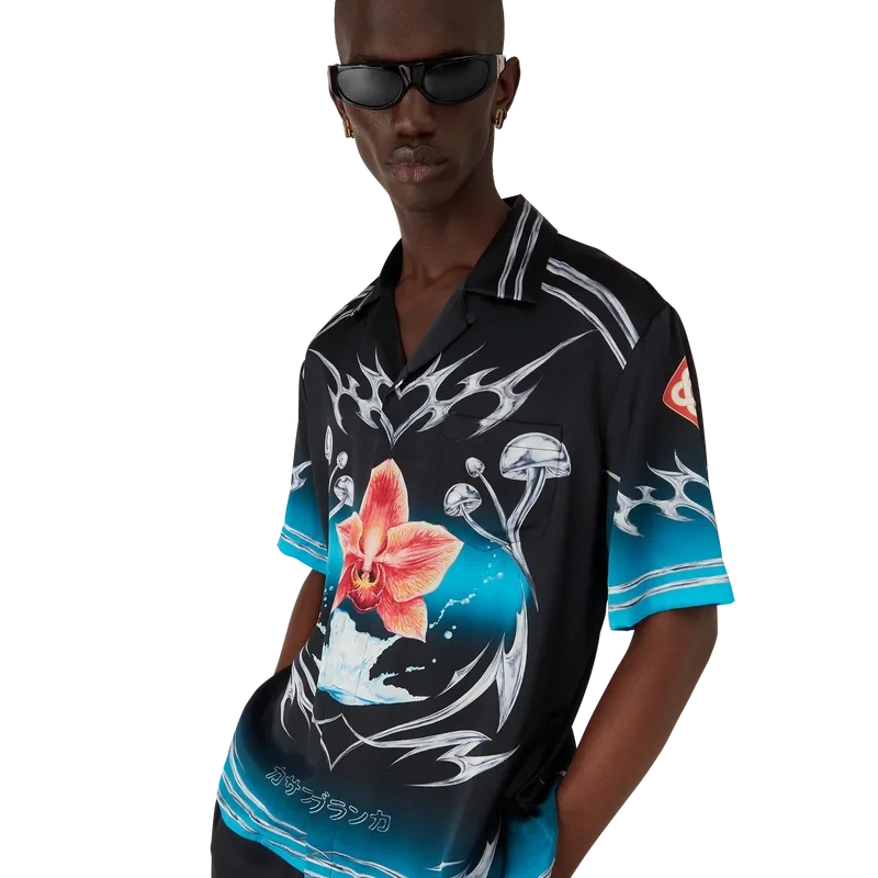Het Blades zijden satijnen overhemd met korte mouwen heeft een print met een ontwerp dat speelt met het contrast tussen twee tegengestelde gevoelens: de scherpte van het mes en het koude, zilveren chroom, in contrast met de warmte van de natuur, zoals de opvallende roze en rode tinten van een orchidee. De toevoeging van water geeft het ontwerp een fris, helder element. Afgewerkt met een Cubaanse kraag, een borstzak, een knoopsluiting en kenmerkende in elkaar grijpende Cc Corozo-knopen.