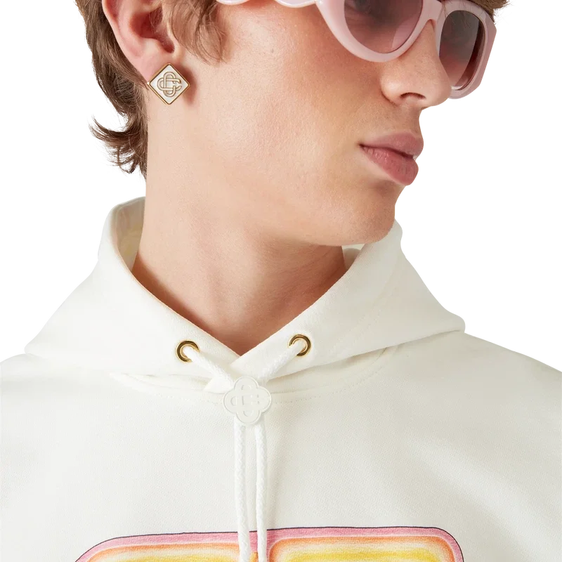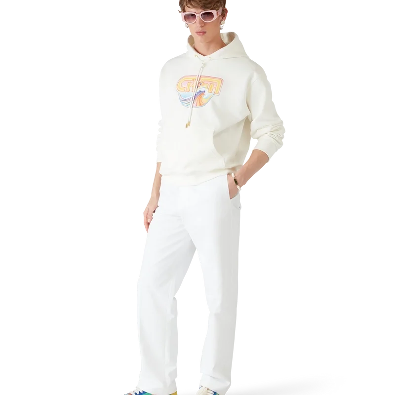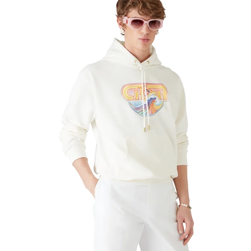 Het Casa Surf-sweatshirt met capuchon is een bedrukt ontwerp met lange mouwen, gemaakt van biologisch katoen en voorzien van seizoensgebonden kunstwerk geïnspireerd op vintage, door de zon verbleekte surfplanken uit de jaren ’70. Afgewerkt met een capuchon, een trekkoord met gouden uiteinden, een kangoeroezak en geribde manchetten en zoom.