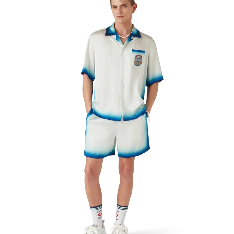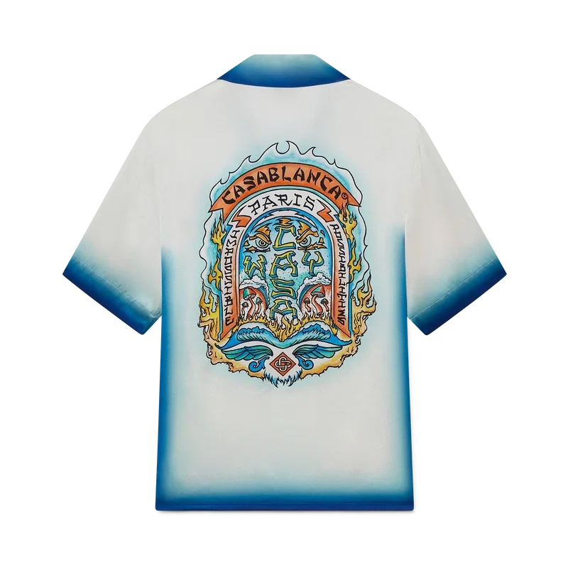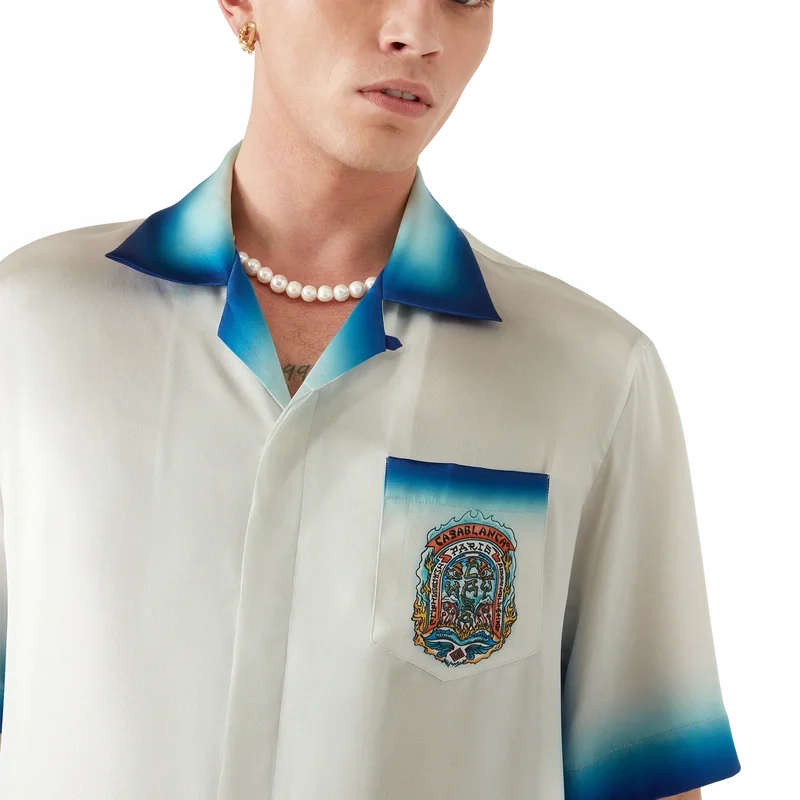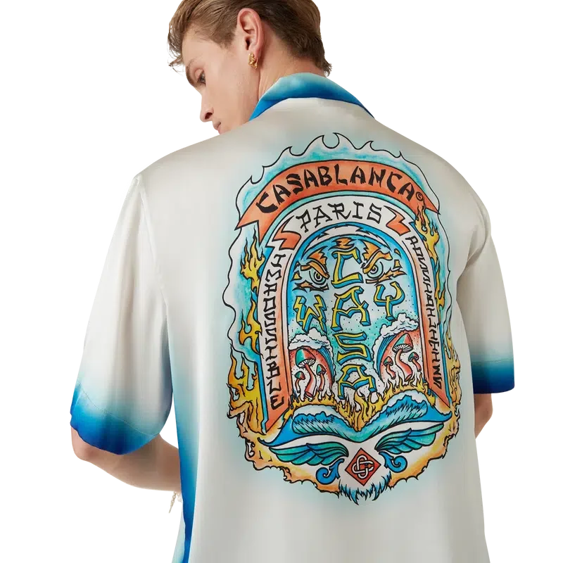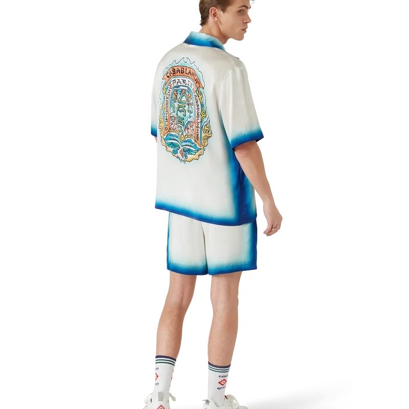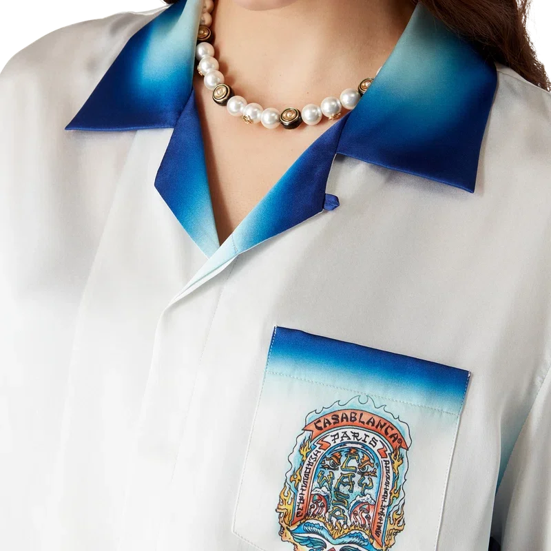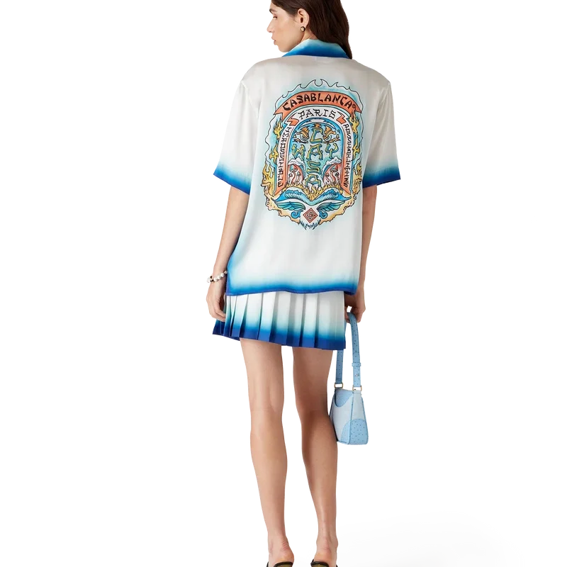 Het Casa Way Skate zijden overhemd is een ontwerp met korte mouwen, vervaardigd uit bedrukte zijden satijn met de Casa Way Skate-illustraties van dit seizoen, geïnspireerd op klassieke Californische skate-insignes uit de jaren 70 met een vervagend kader. Afgewerkt met een Cubaanse kraag, een borstzak, een verborgen knoopsluiting met in elkaar grijpende Cc Corozo-knopen en randdetails op de zak, kraag, manchetten en zoom.