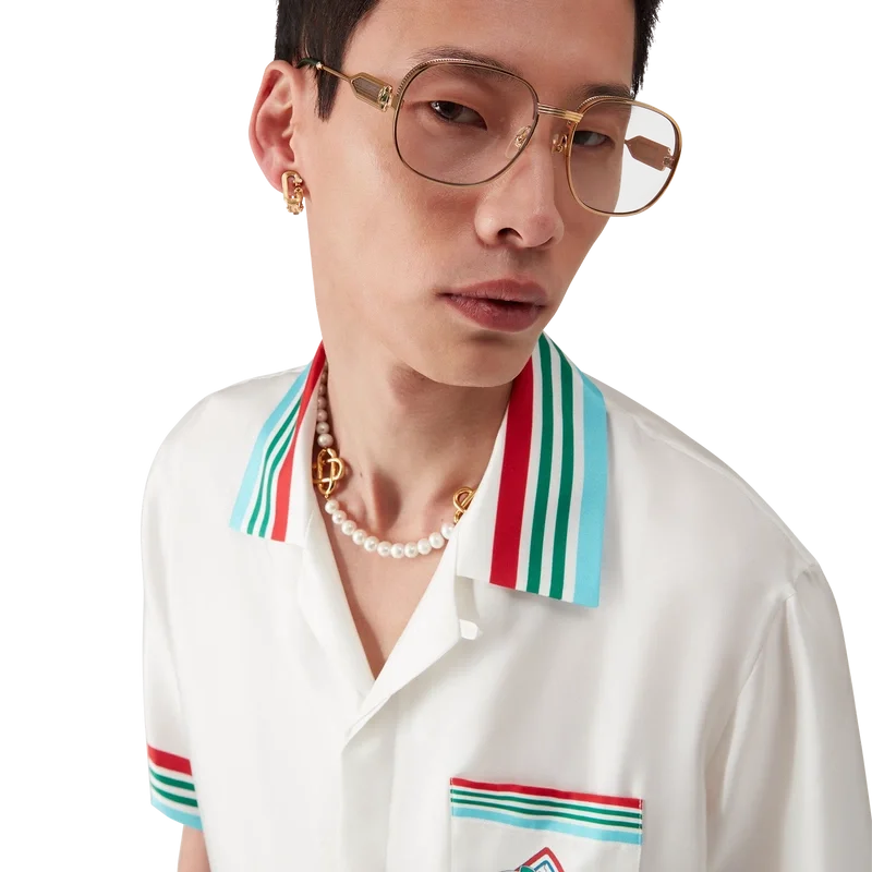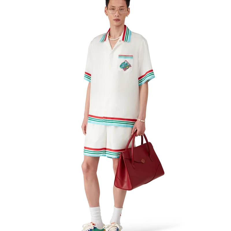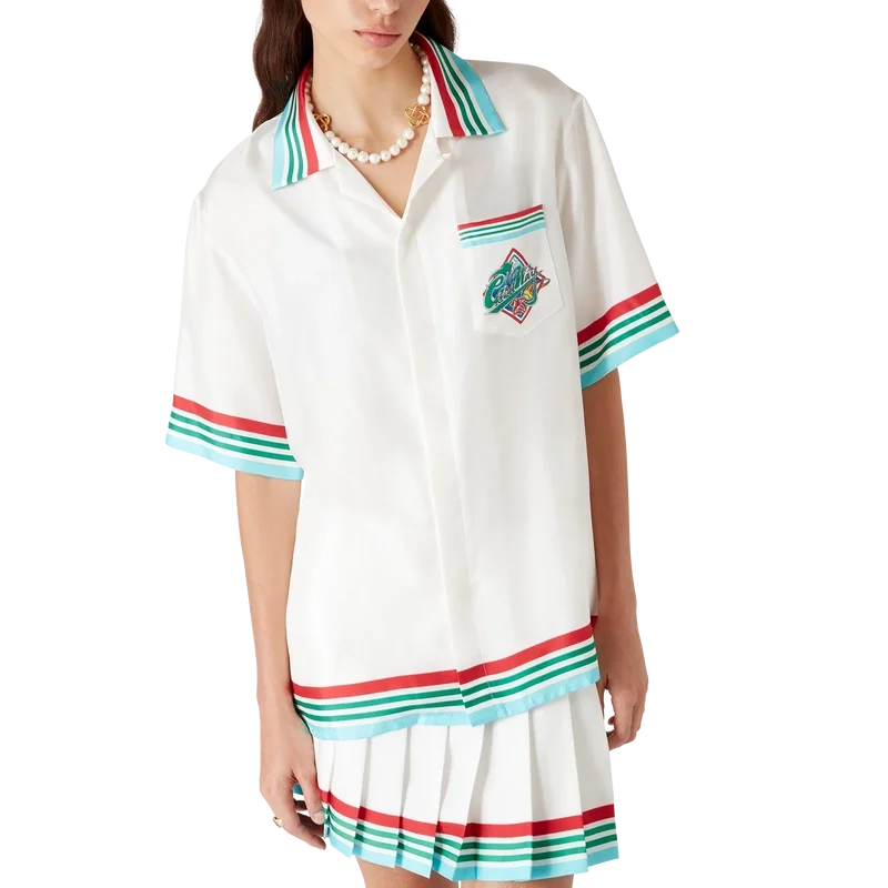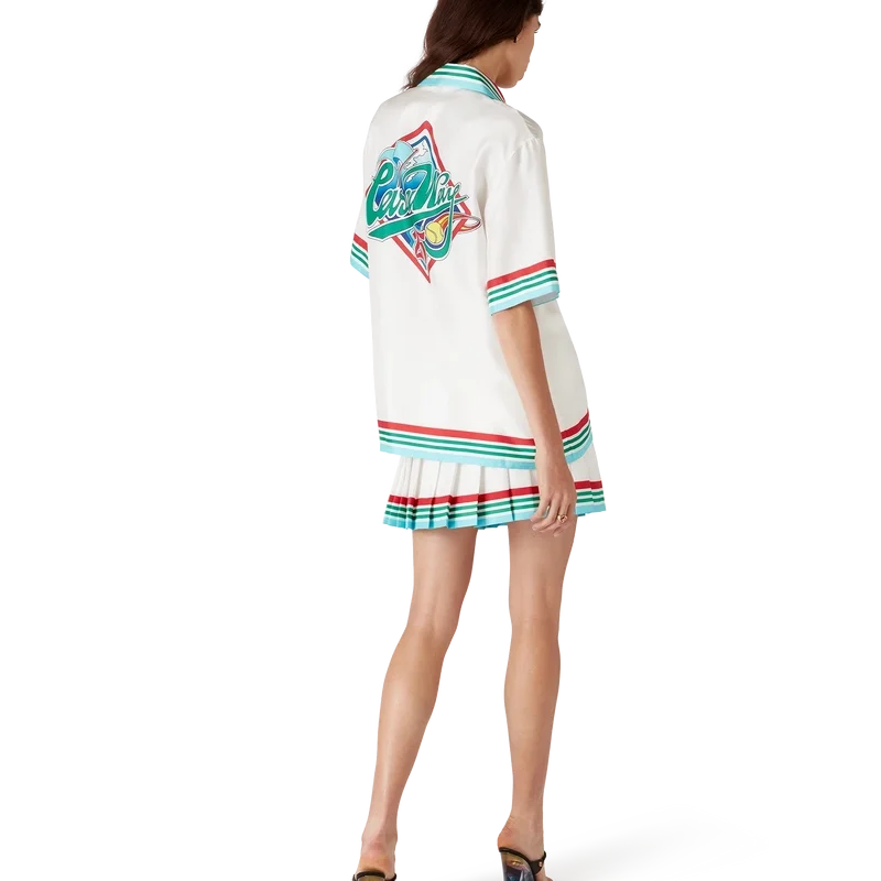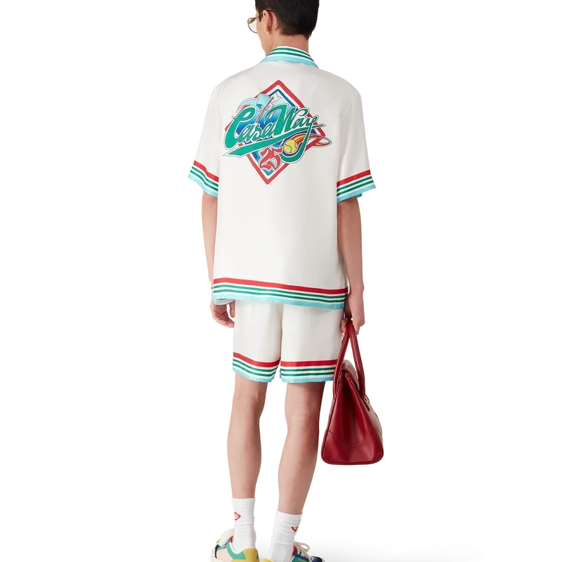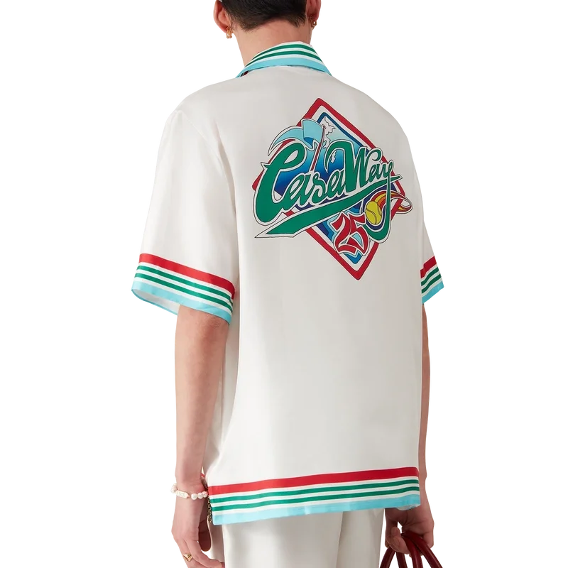 Het Casa Way World Series zijden overhemd is een bedrukt ontwerp met korte mouwen met de kunstwerken van dit seizoen, een herinterpretatie van klassieke, typisch Amerikaanse honkbalinsignes voor Casa Way Tennis, vervaardigd van zijden twill.