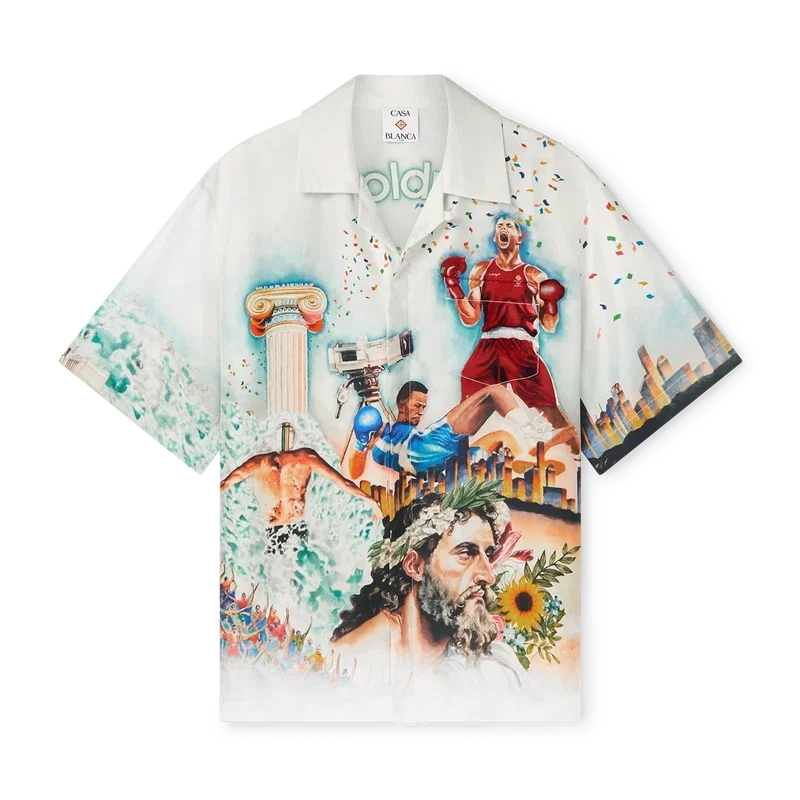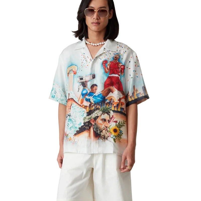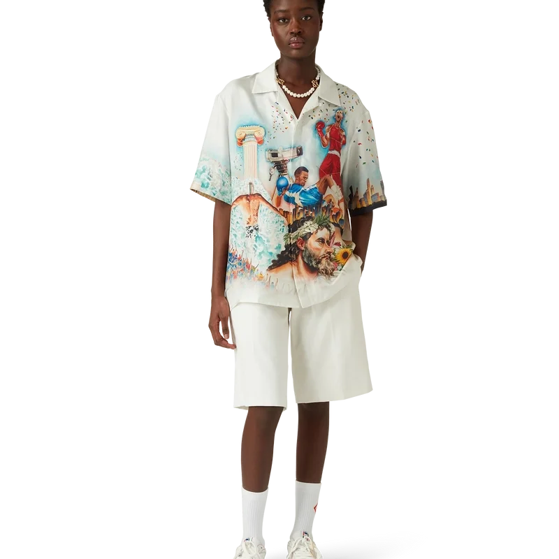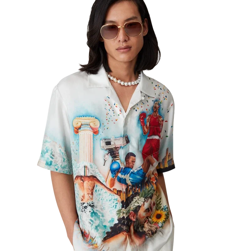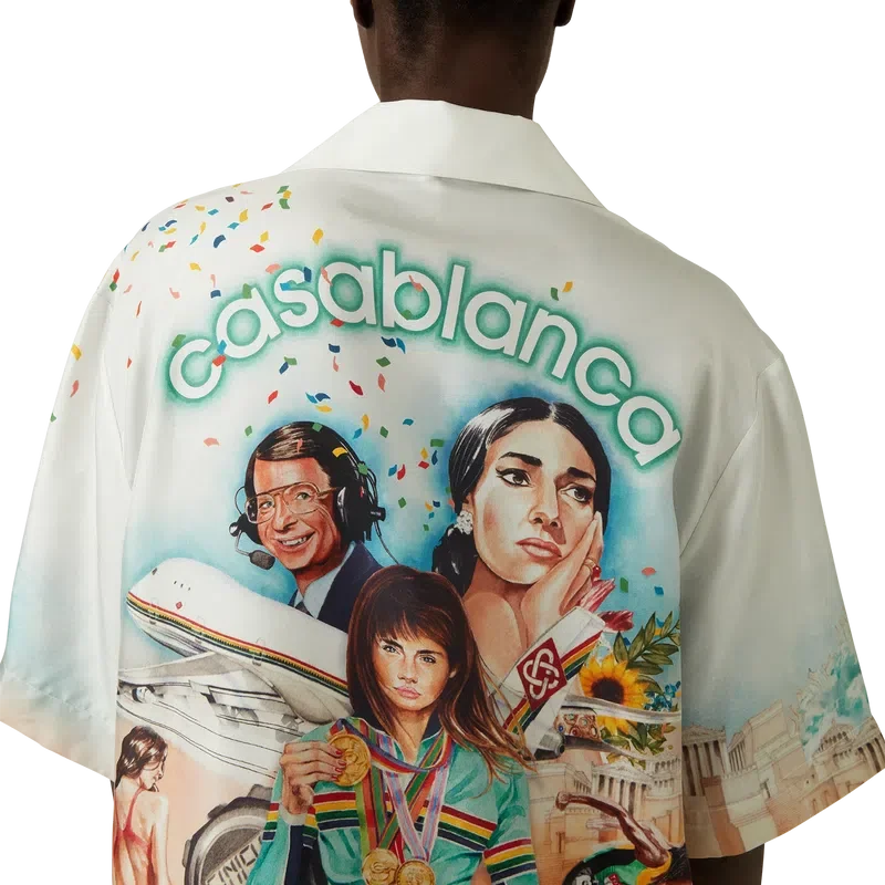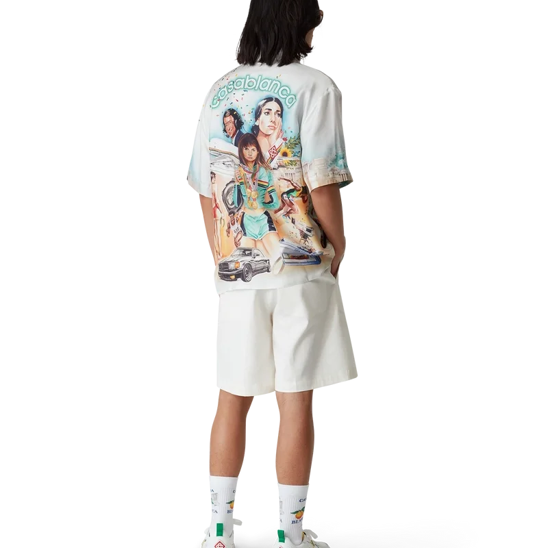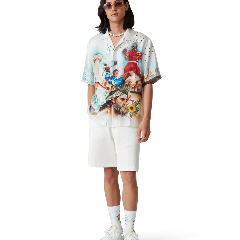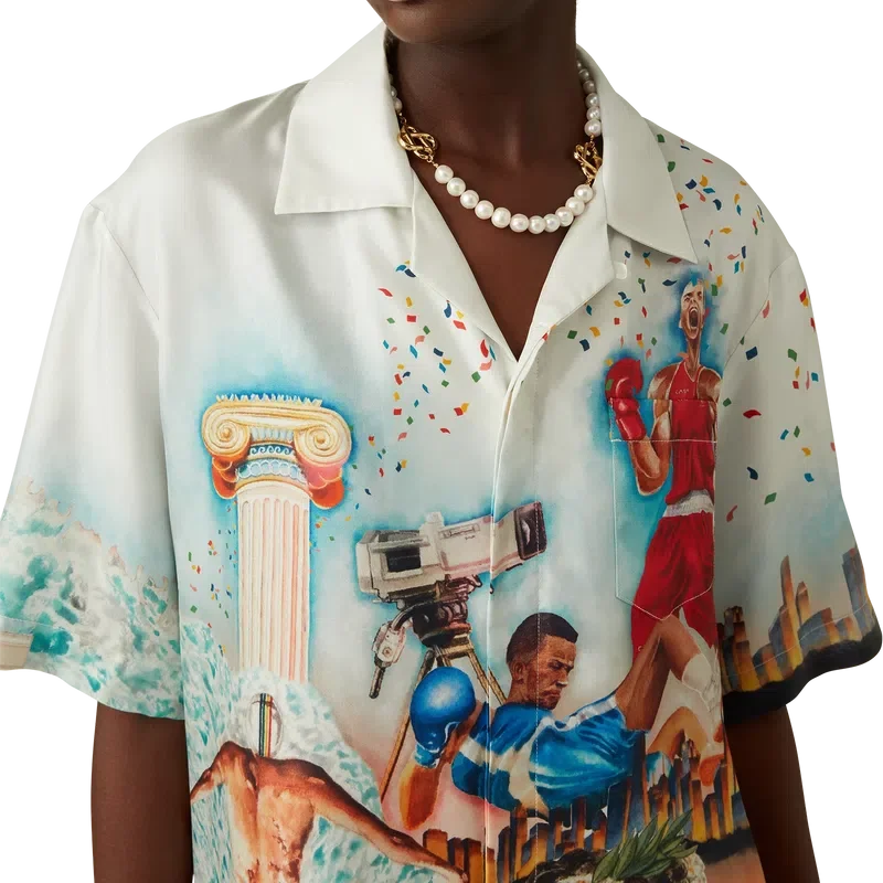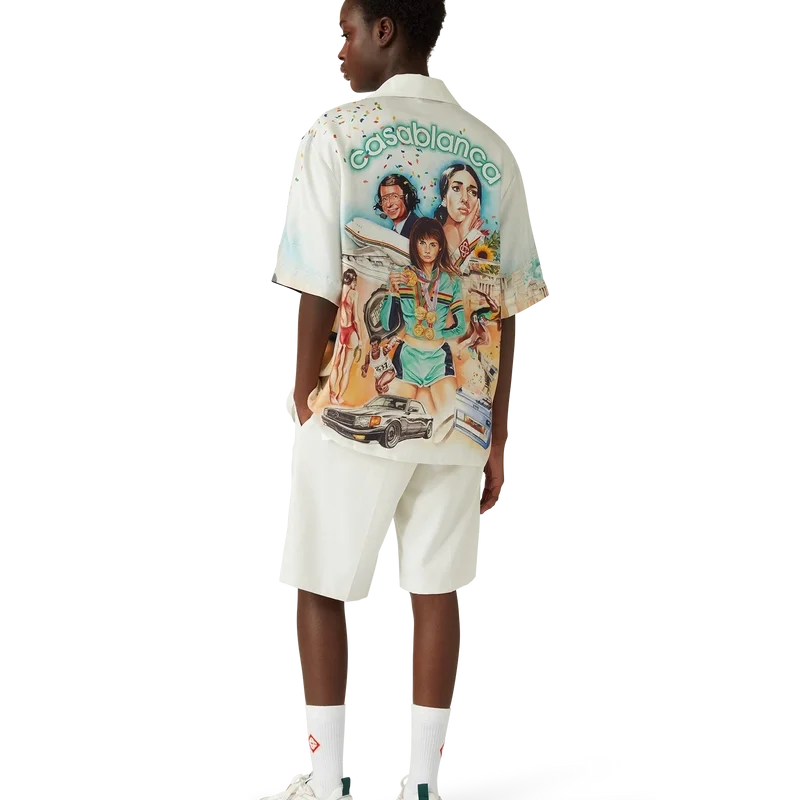 Het Celebration Du Sport zijden overhemd is een ontwerp met korte mouwen en een all-over print, vervaardigd uit een zijden twill-stof met seizoensgebonden kunstwerken geïnspireerd op het spel van het huis met een klassieke filmposterlay-out met onze eigen personages in die wereld. Afgewerkt met kenmerkende in elkaar grijpende Cc-logo Corozo-knopen, een verborgen knoopsluiting, een borstzakje en een Cubaanse kraag.