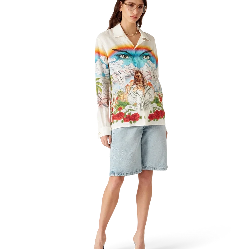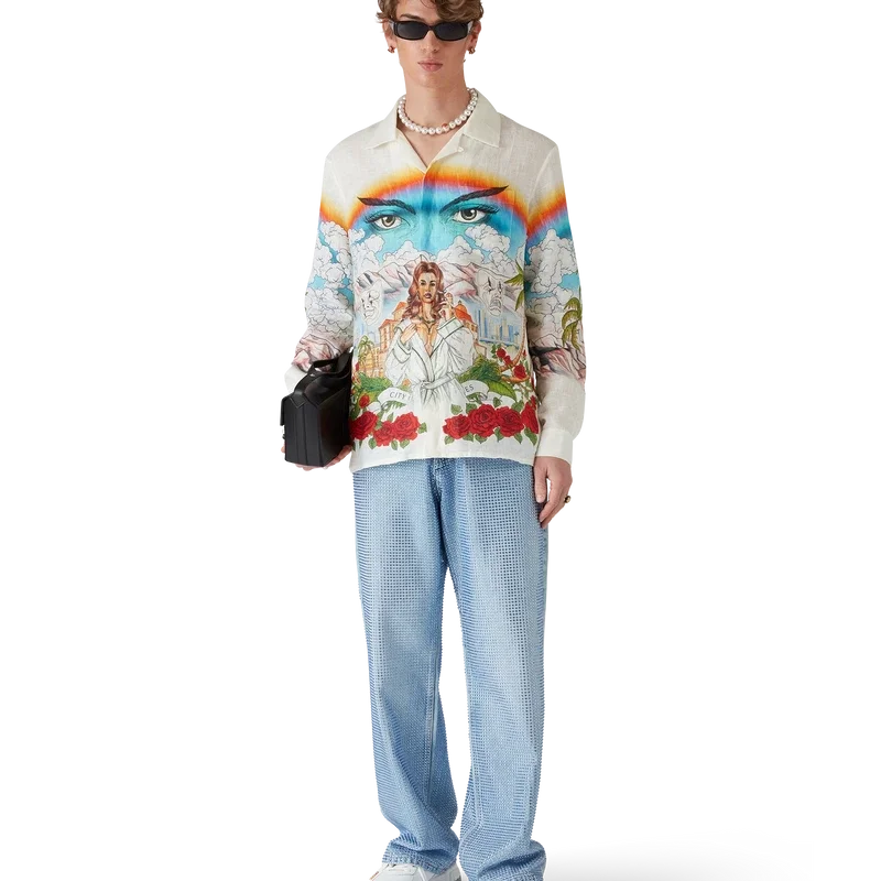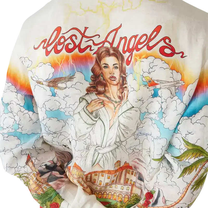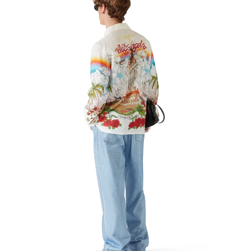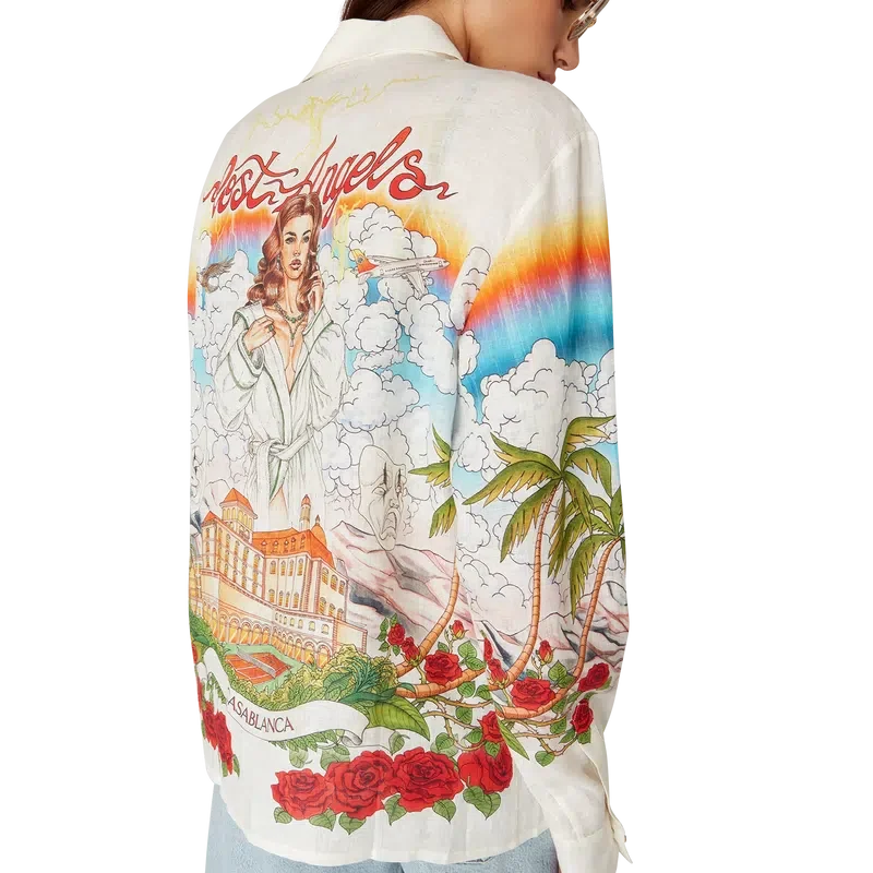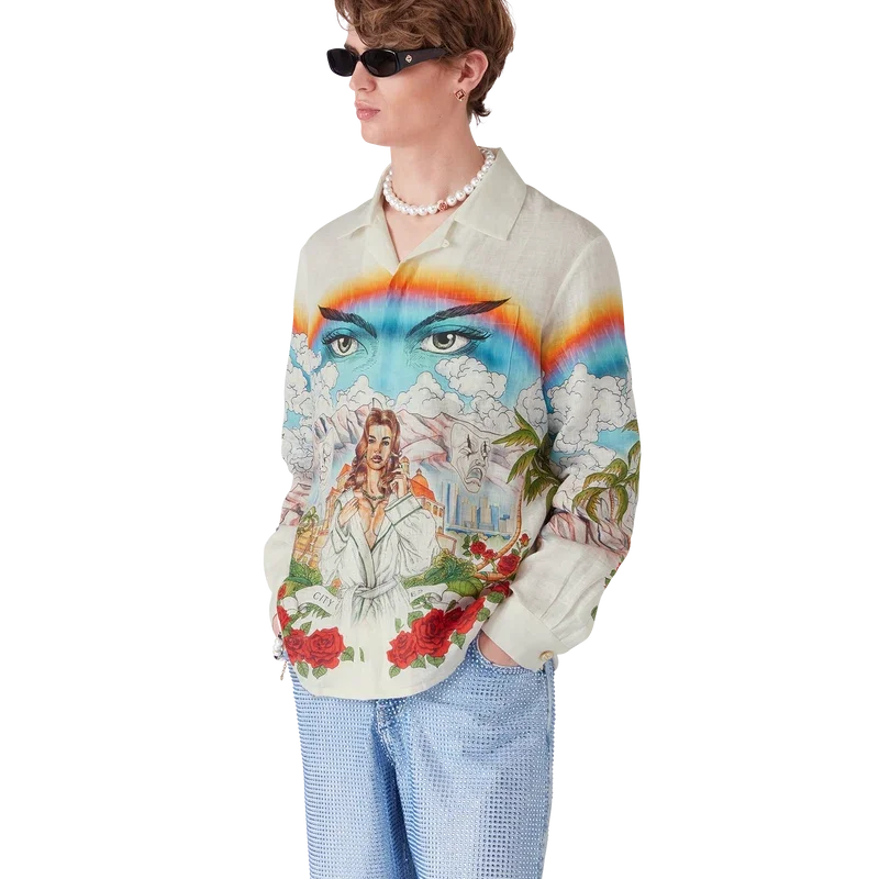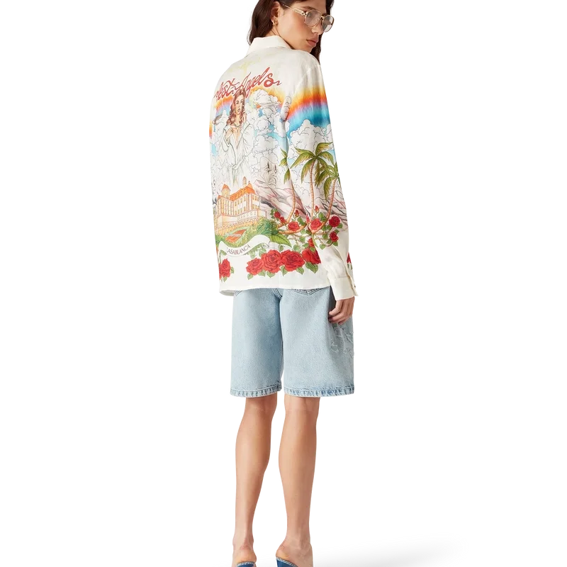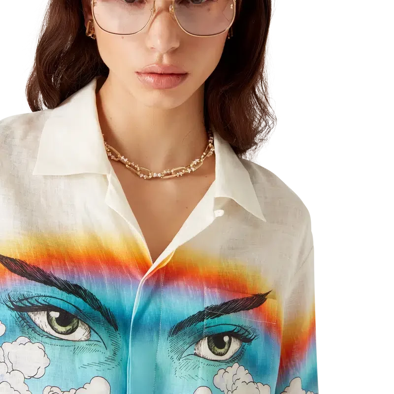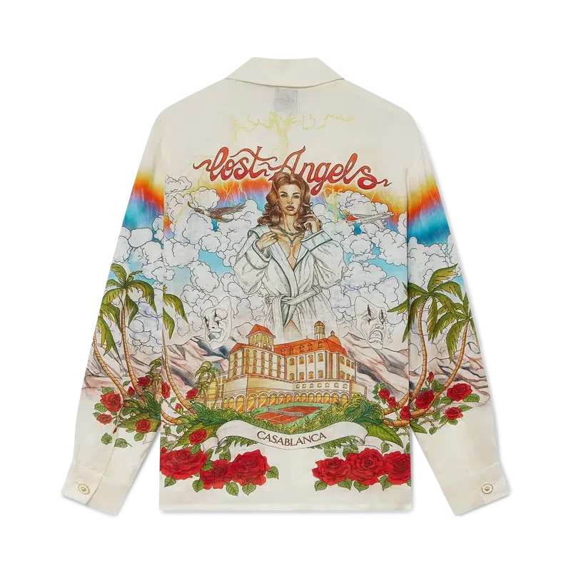 Het Chateau linnen overhemd is een bedrukt ontwerp met lange mouwen, voorzien van een print die verwijst naar het dramatische verhaal van een jonge, ambitieuze actrice die verblijft in het beroemde Chateau Marmont Hotel in Los Angeles. Afgewerkt met een verborgen knoopsluiting, in elkaar grijpende CC-knopen van corozo, een Cubaanse kraag en een geëmailleerde knoop met gouden rand op elke manchet.