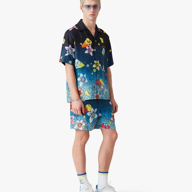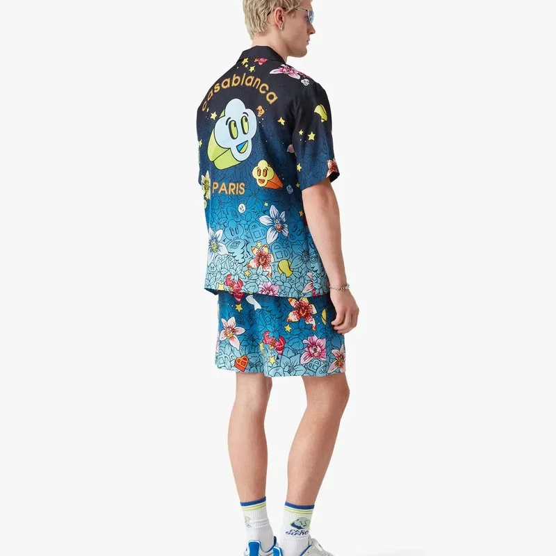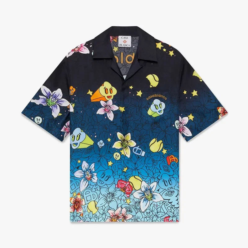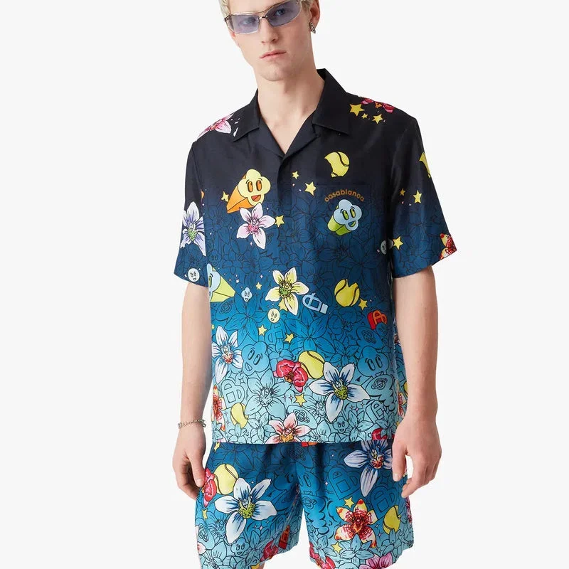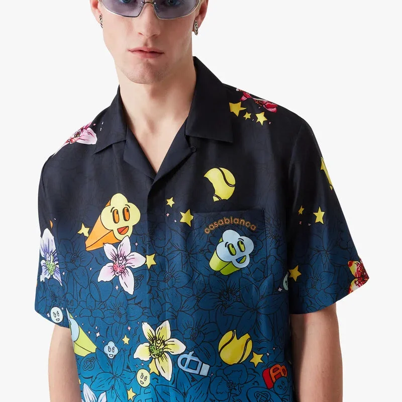 Het Collage D’icones Graphiques zijden overhemd met korte mouwen heeft een all-over print met kunstwerken die de iconografie en ontwerpelementen voor het nieuwe seizoen weergeven, waaronder interpretaties van het logo, de Cc Smile en de orchideebloem. Afgewerkt met een Cubaanse kraag, knoopsluiting, Corozo-knopen met het in elkaar grijpende Cc-logo, een borstzakje en het Casablanca-logo van het huis.