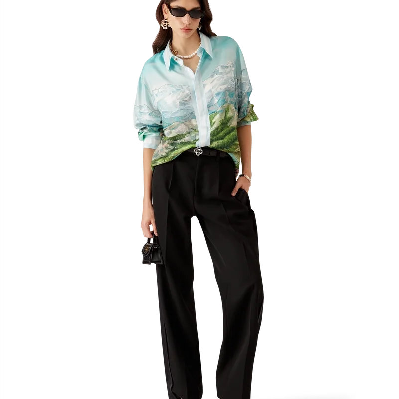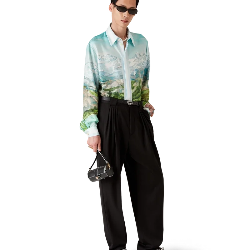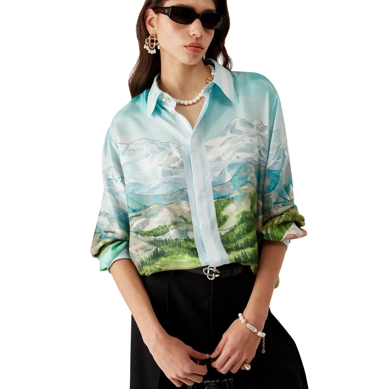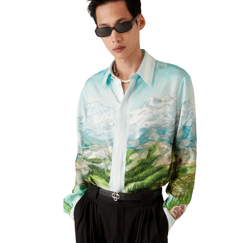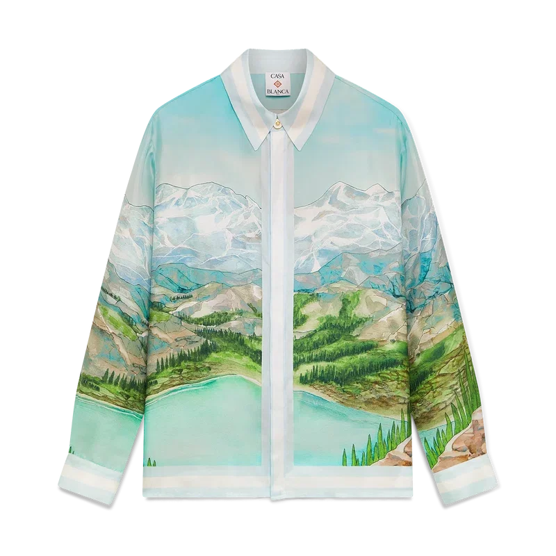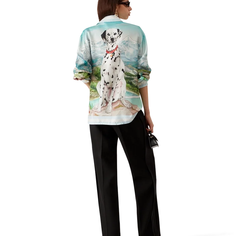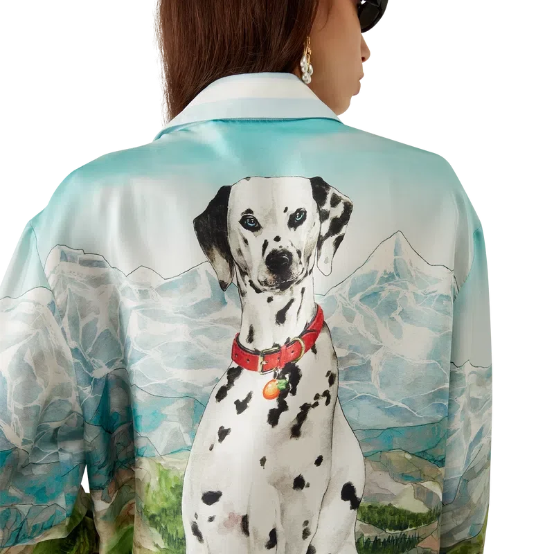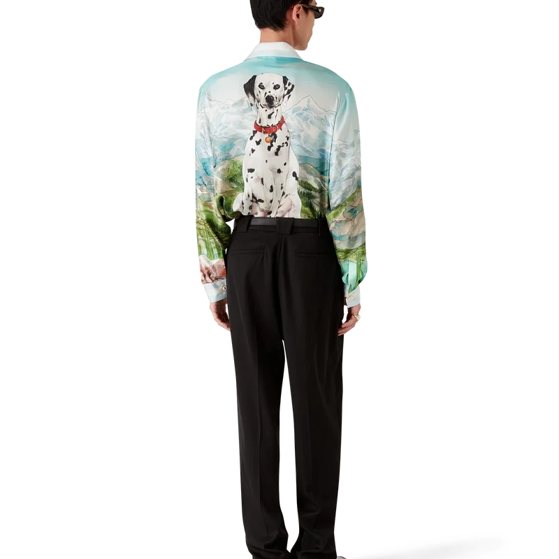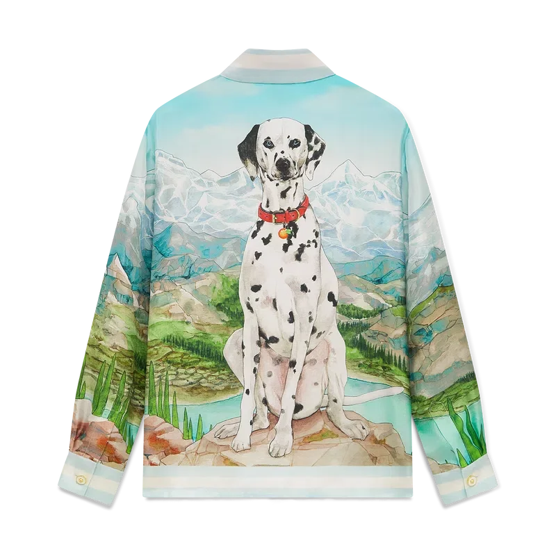 Het Dalmatian a La Montagne zijden overhemd met lange mouwen heeft een all-over print en is vervaardigd van zijden twill met het kenmerkende kunstwerk van het huis, dat een landschap met besneeuwde bergen, meren en een dalmatiër weergeeft.