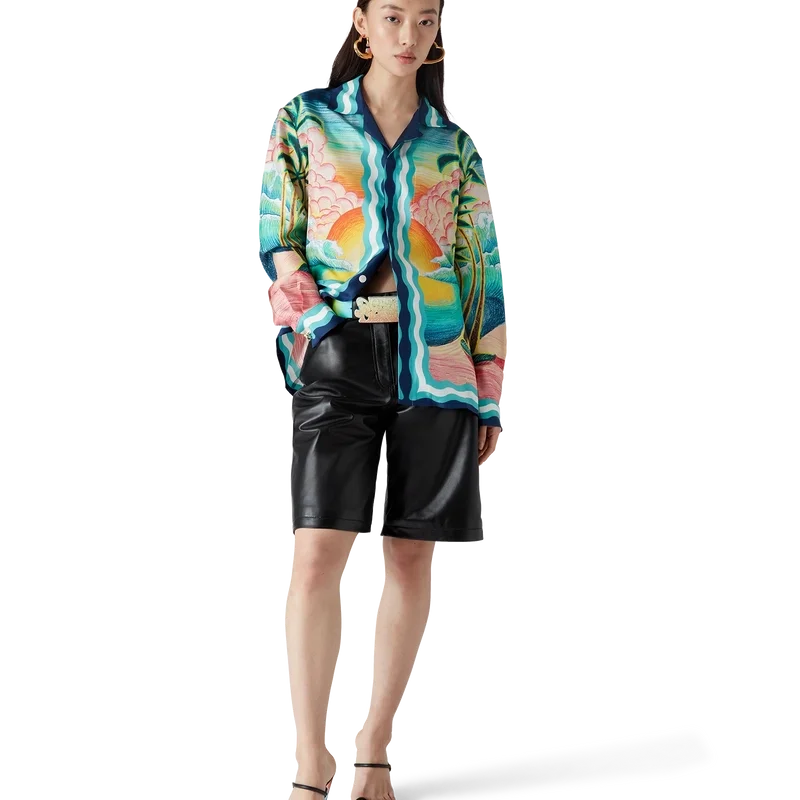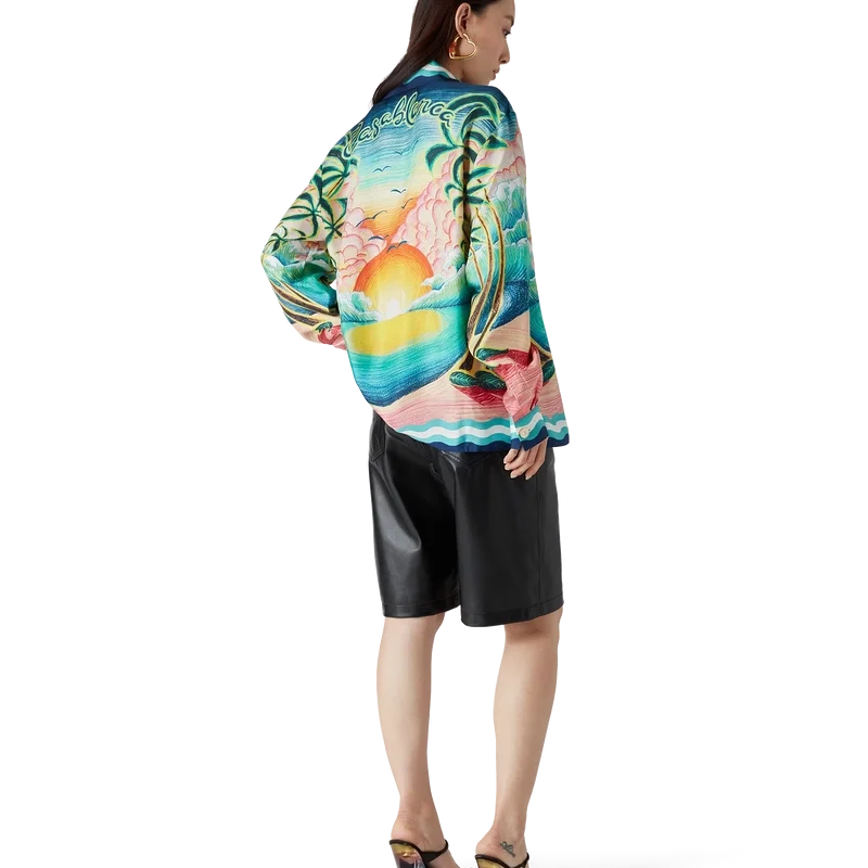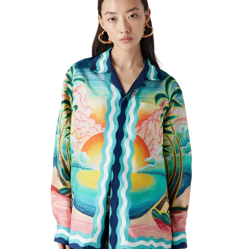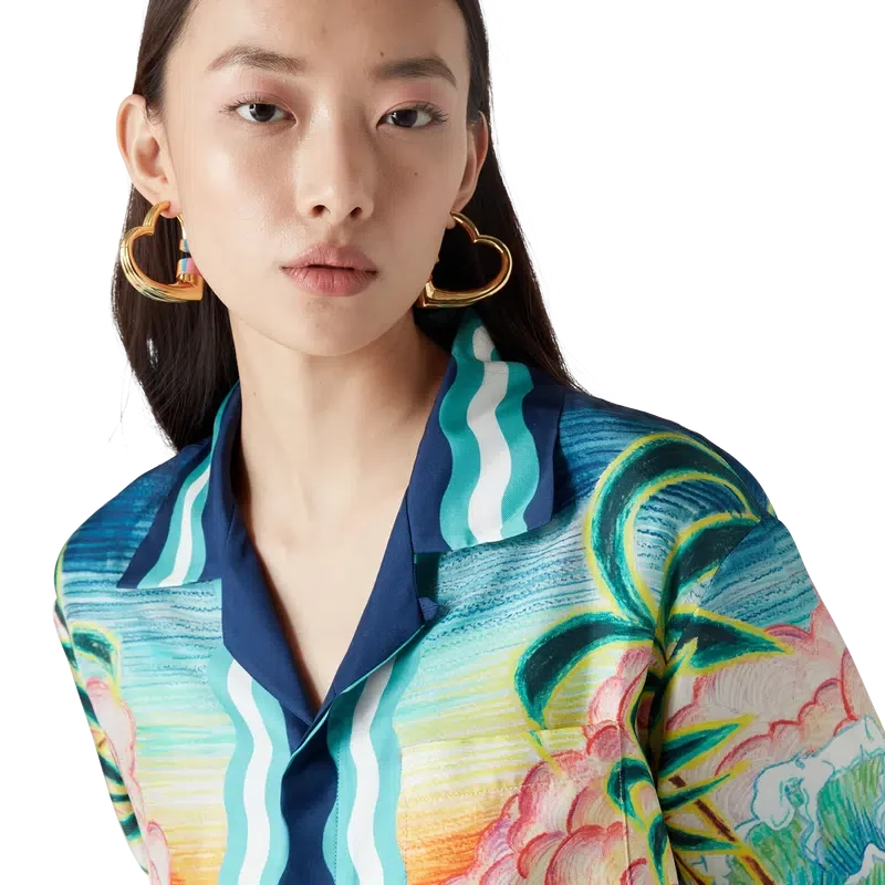 Het Danse De La Mer zijden overhemd is een ontwerp met lange mouwen en een all-over print met handgeschilderde scènes die speciaal voor de collectie zijn gemaakt en vervaardigd uit zijden stof. Afgewerkt met knoopsluiting, in elkaar grijpende Cc-logo Corozo-knopen, kenmerkende geëmailleerde knopen met gouden rand en op de Memphis Wave geïnspireerde streepdetails op de zoom, manchetten, kraag en knoopsluiting.