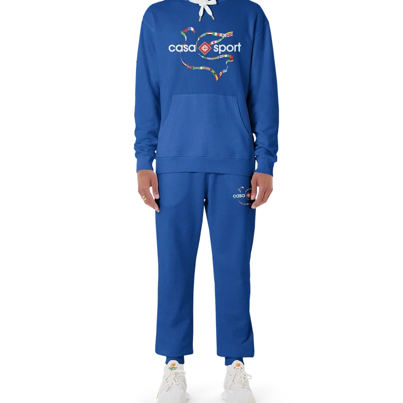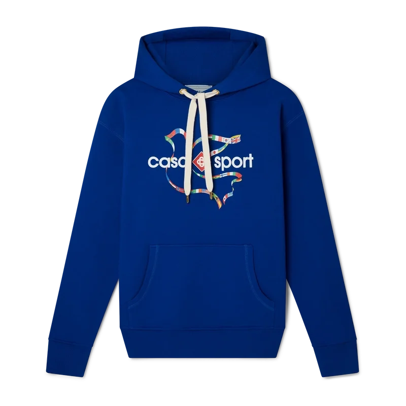 Het Drapeau De Collombes hoodie van biologisch katoen met zeefdruk is voorzien van seizoensgebonden artwork waarin de kenmerkende Casa Sport-iconografie van het huis is verwerkt. Afgewerkt met een klassieke ronde hals, lange mouwen en een Casablanca Paris-merklabel, ontworpen voor een relaxte pasvorm.