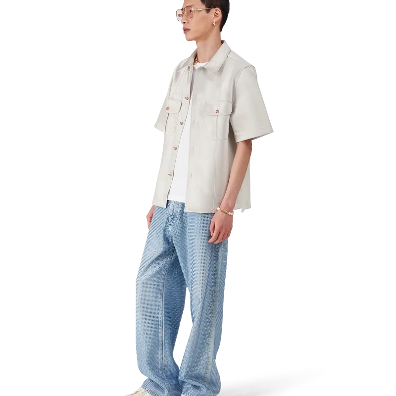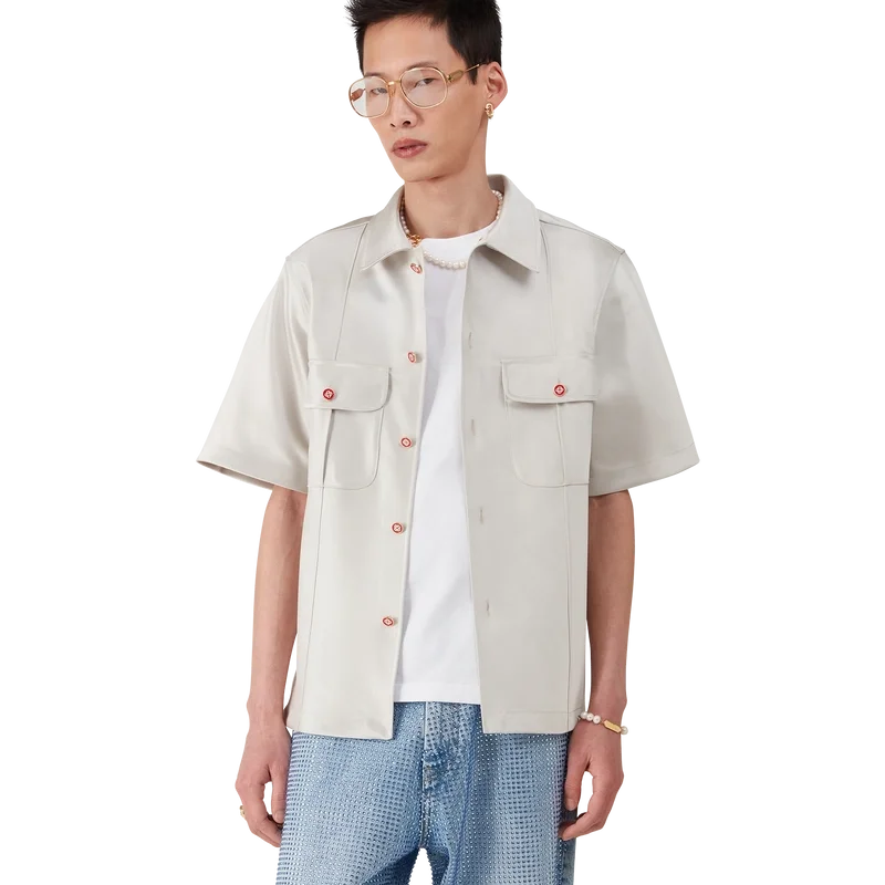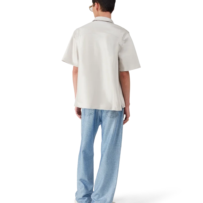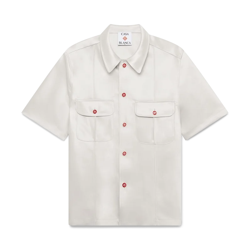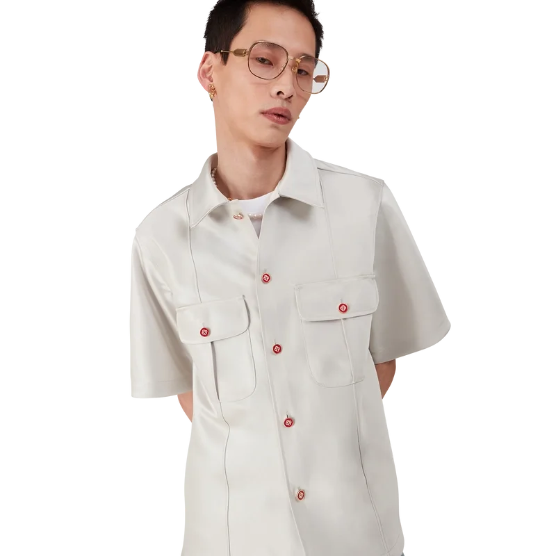 Het Duchesse satijnen overhemd is een ontwerp met korte mouwen, vervaardigd uit Duchesse satijn. Afgewerkt met knoopsluiting, rode Cc platte emaille knopen, een puntkraag, plooien aan de voor- en achterkant, 2 cm zijsplitten en opgestikte borstzakken met klep en knoopsluiting.