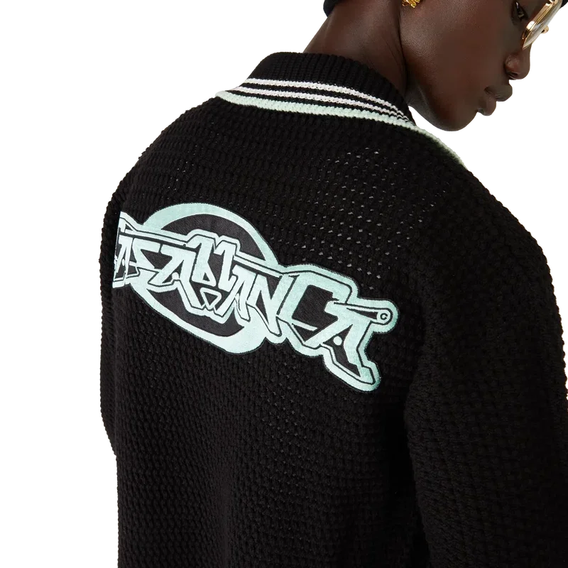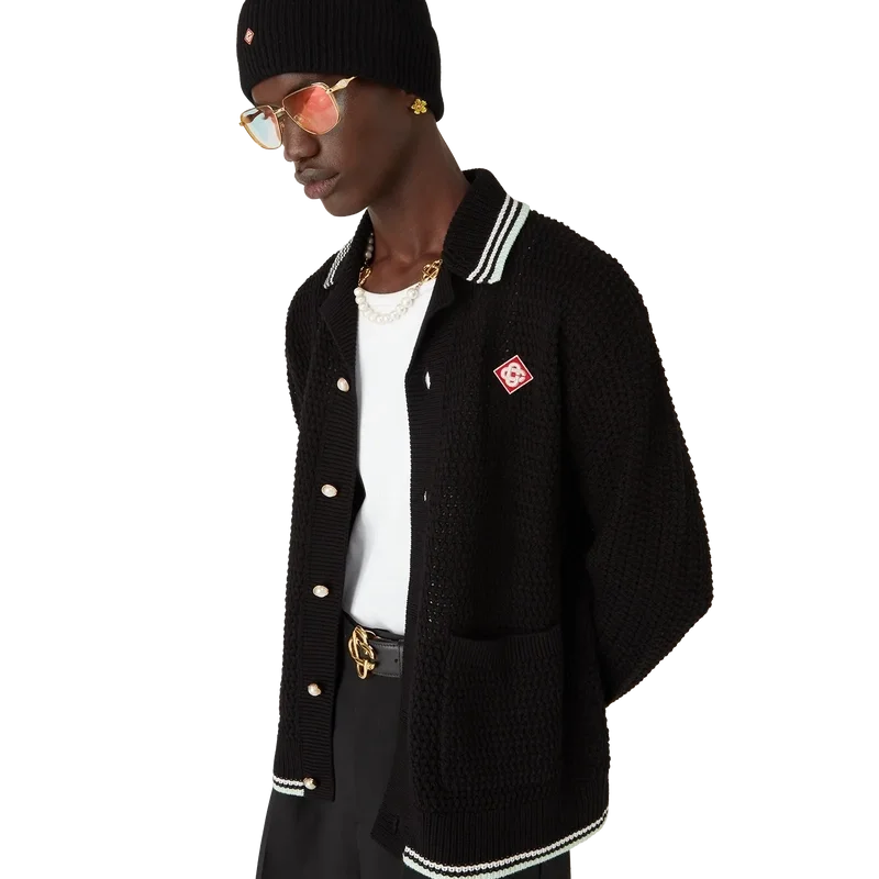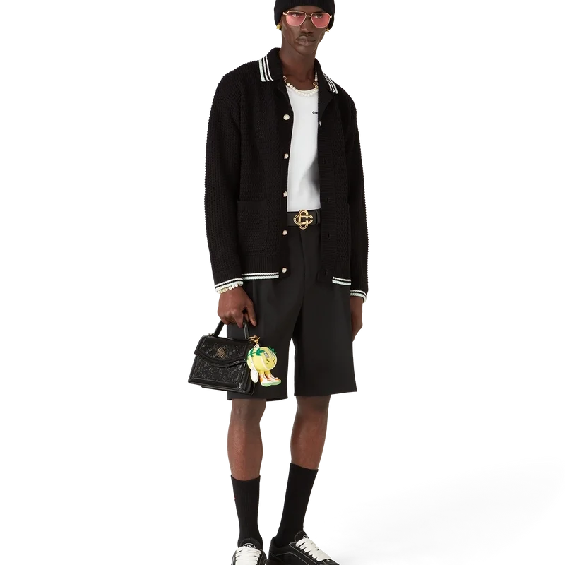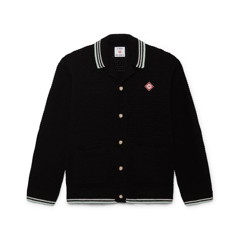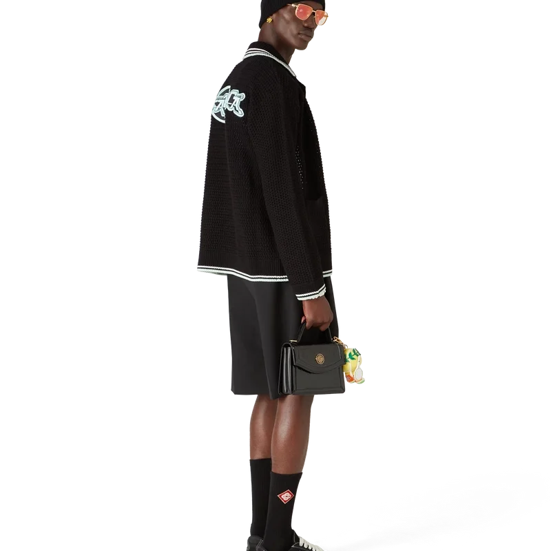 Het geborduurde katoenen gehaakte overhemd met lange mouwen is een klassiek ontwerp met het kenmerkende diamantlogo van het huis, dat aansluit bij het reis- en vakantiethema van de capsulecollectie. Afgewerkt met een geribde kraag, manchetten, zoom en knopenlijst, opgestikte zakken aan de voorkant, knoopsluiting, kenmerkende parelknopen met gouden rand en zwarte, mintgroene en witte streepjes aan de randen van de manchetten, zoom en kraag.