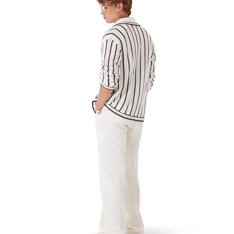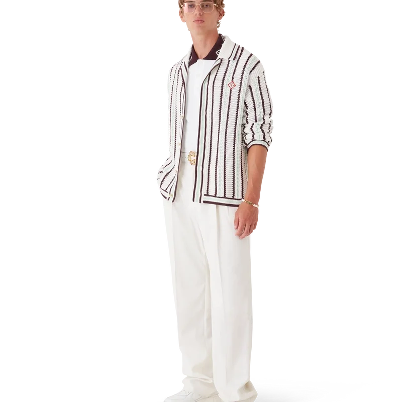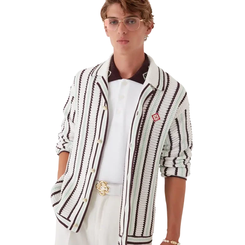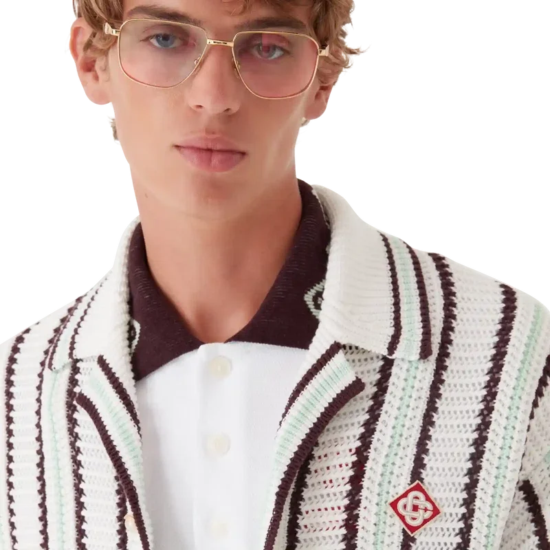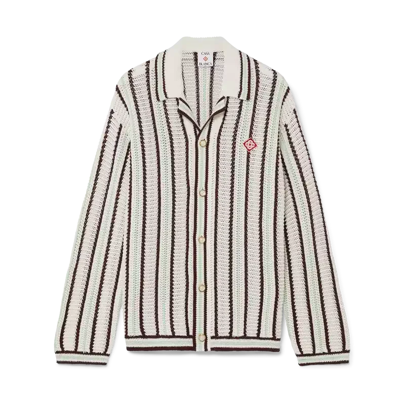 Het gestreepte katoenen gehaakte overhemd is een ontwerp met lange mouwen, vervaardigd uit een katoenmix gehaakte stof met het kenmerkende diamantlogo van het huis. Afgewerkt met een geribde kraag, manchetten, zoom en sluiting, kenmerkende parelknopen met gouden rand en knoopsluiting aan de voorkant.