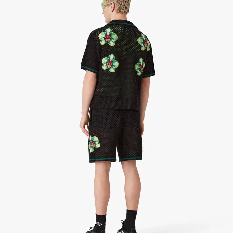 Het Glitch Orchid geborduurde haakoverhemd met korte mouwen heeft een verfijnd ontwerp met kunstwerk dat de contrasterende ontwerpfilosofie weergeeft van het samengaan van natuur en mens, in harmonie met elkaar, door de natuurlijke schoonheid van de orchideebloem te tonen. Afgewerkt met geribde zoom, knoopsluiting, Cubaanse kraag, knoopsluiting en kenmerkende gouden parelknopen.