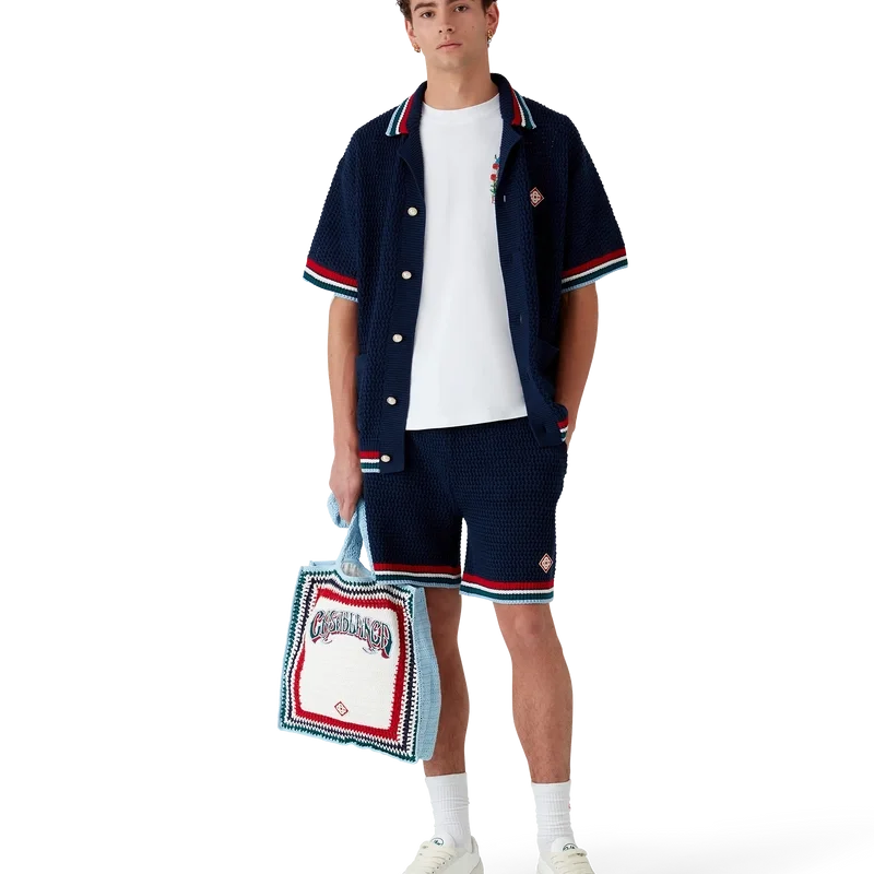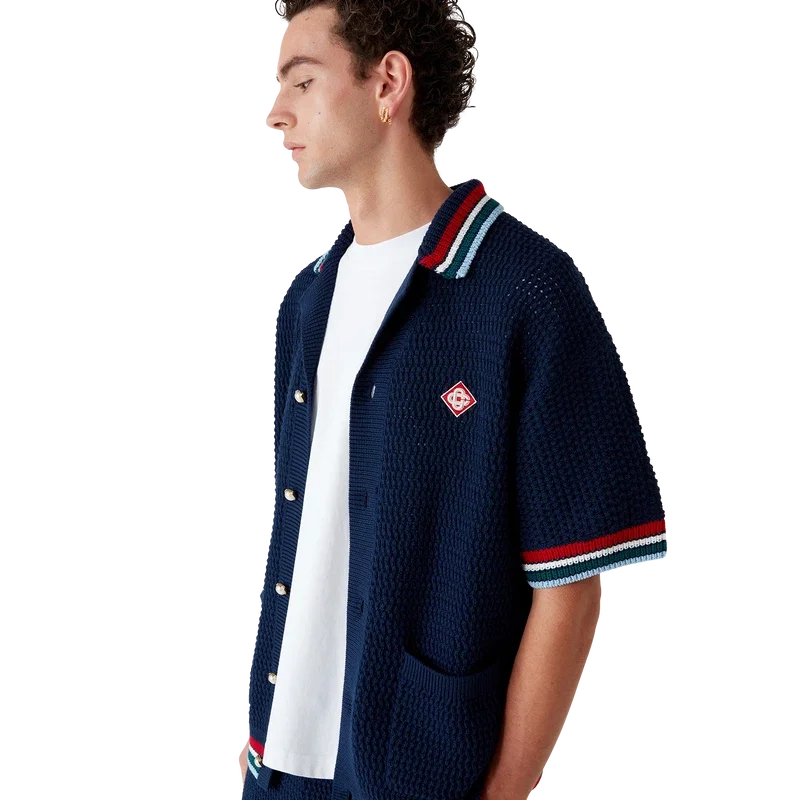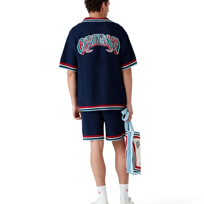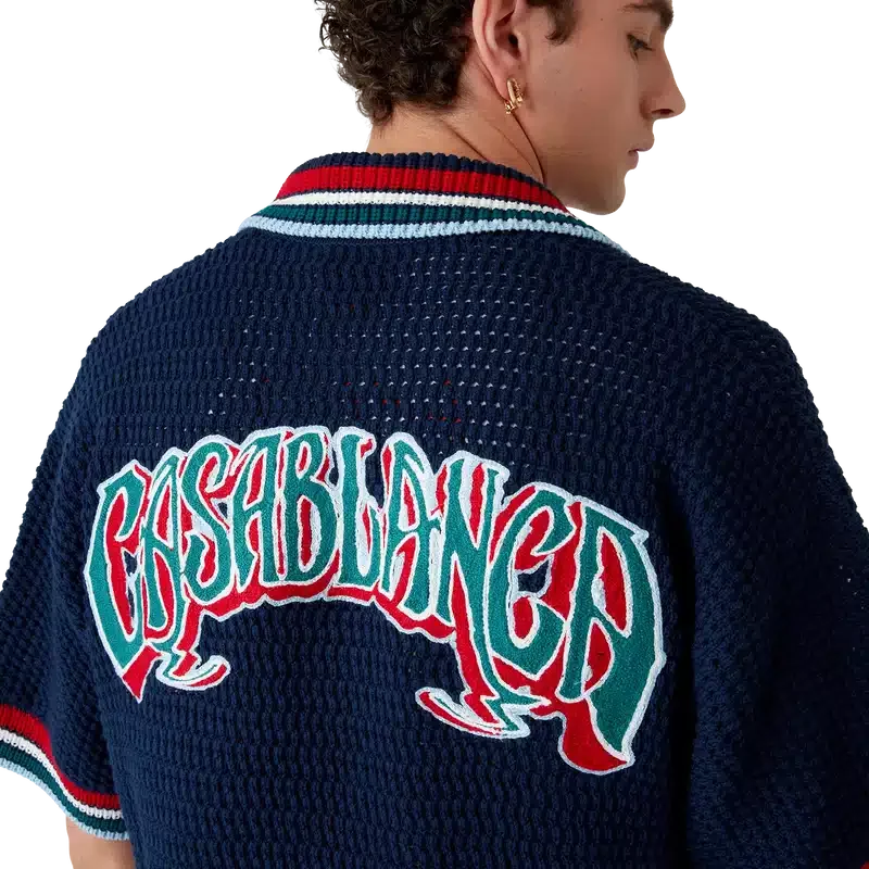 Het Gothic Crochet Overhemd is een gebreid ontwerp met korte mouwen, vervaardigd van gehaakte katoenen stof en voorzien van het kenmerkende diamantlogo van het huis. Afgewerkt met kenmerkende gouden parelknopen, opgestikte zakken aan de voorkant en gestreepte randen aan de kraag, manchetten en zoom.