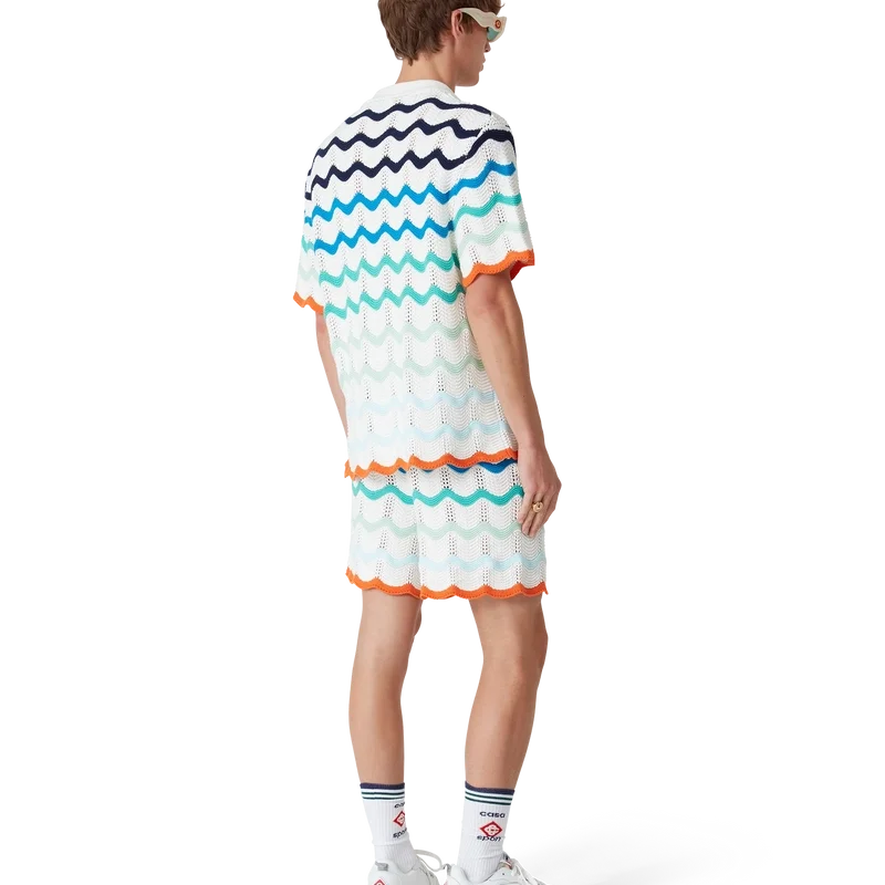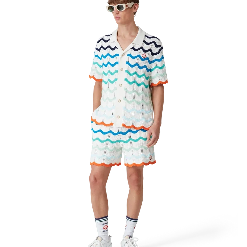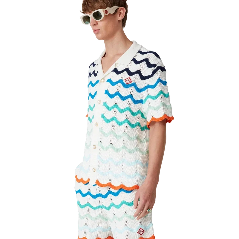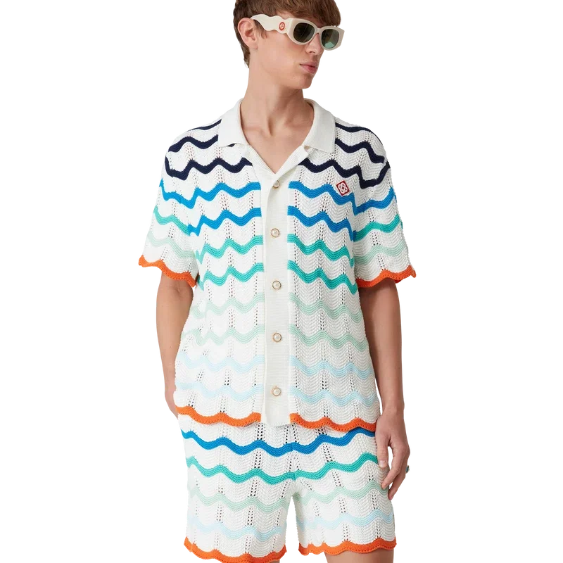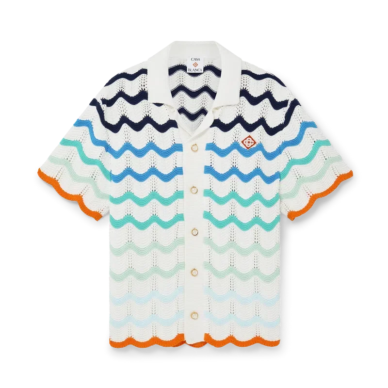 Het Gradient Wave Crochet Overhemd is een ontwerp met korte mouwen, vervaardigd uit katoen met een Gradient Wave-haakpatroon. Het overhemd is voorzien van het op de Memphis Wave geïnspireerde ontwerpelement van het huis in kleurverlopen, wat aansluit bij het reis- en vakantiethema van de capsulecollectie. Afgewerkt met knoopsluiting aan de voorkant, kenmerkende gouden parelknopen met rand, geribde kraag en knoopsluiting, en contrasterende randdetails op de manchetten en zoom.
