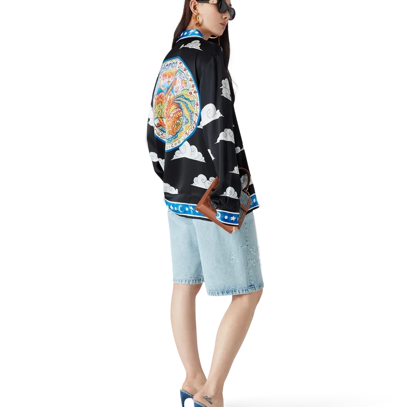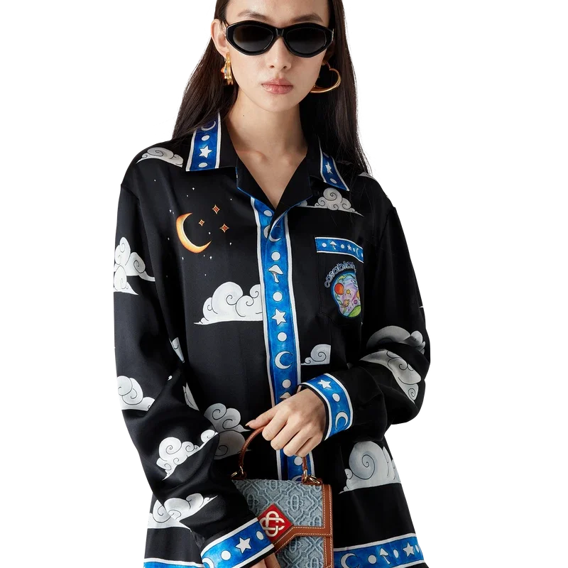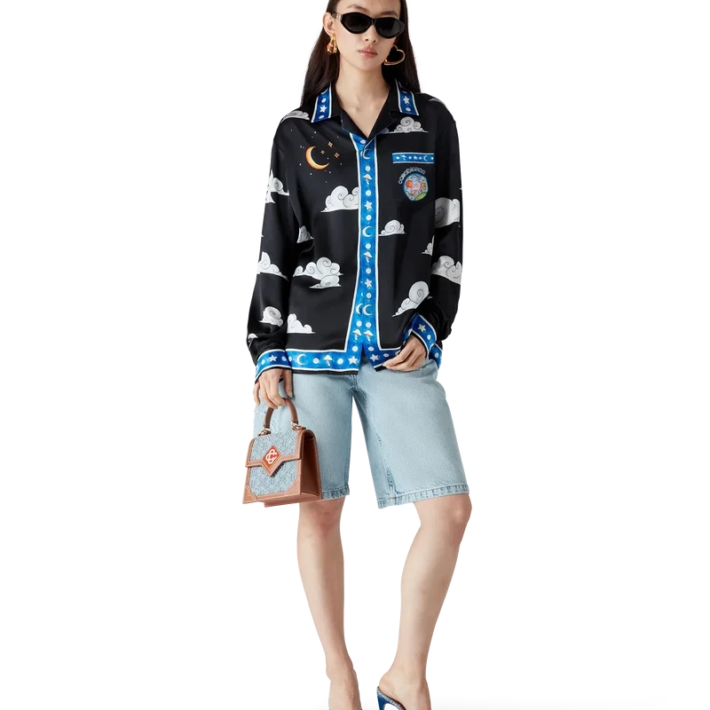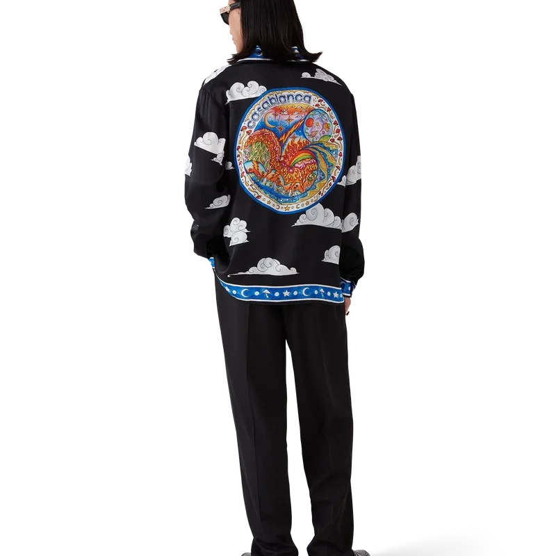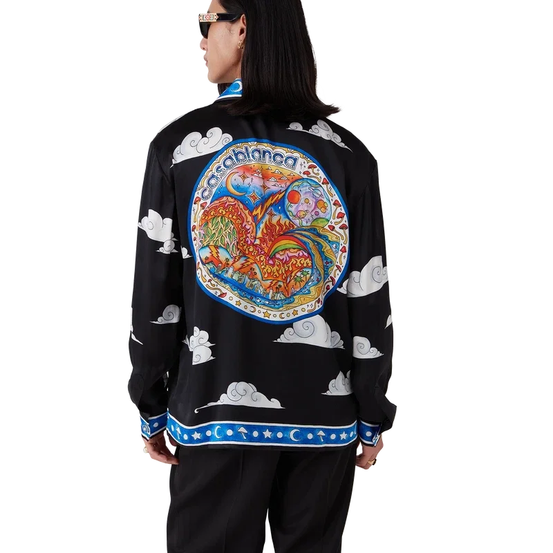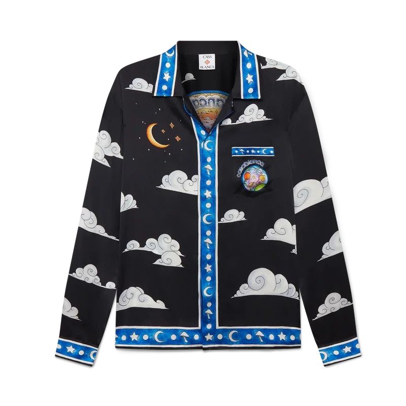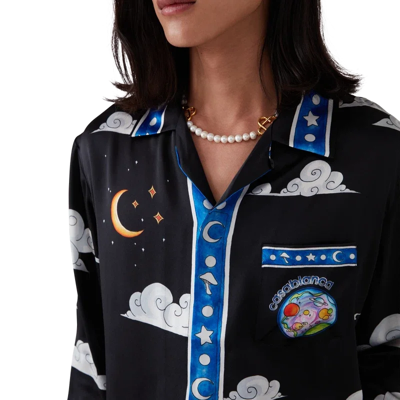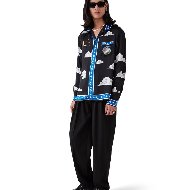 Het Four Elements zijden overhemd is een overhemd met lange mouwen en een all-over print, vervaardigd uit zijden satijn met een ontwerp dat alle elementen van La samenbrengt: de skyline, het strand, vuur, vegetatie en astronomie. Afgewerkt met een Cubaanse kraag, een borstzak, een verborgen knoopsluiting met in elkaar grijpende Cc-logo Corozo-knopen, een goudomrande geëmailleerde knoop op elke manchet en randdetails op de kraag, manchetten, knoopsluiting, zoom en zak.<!–