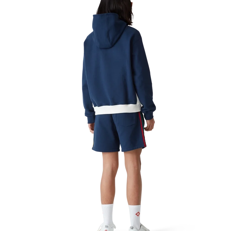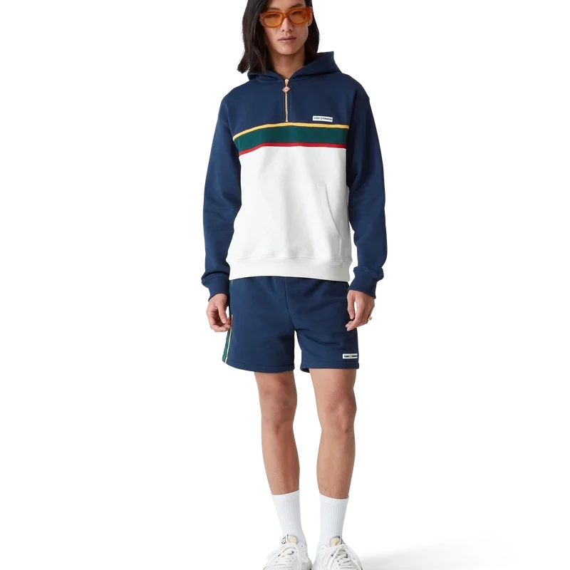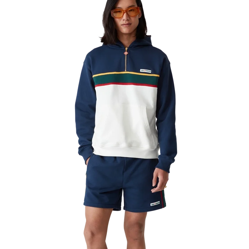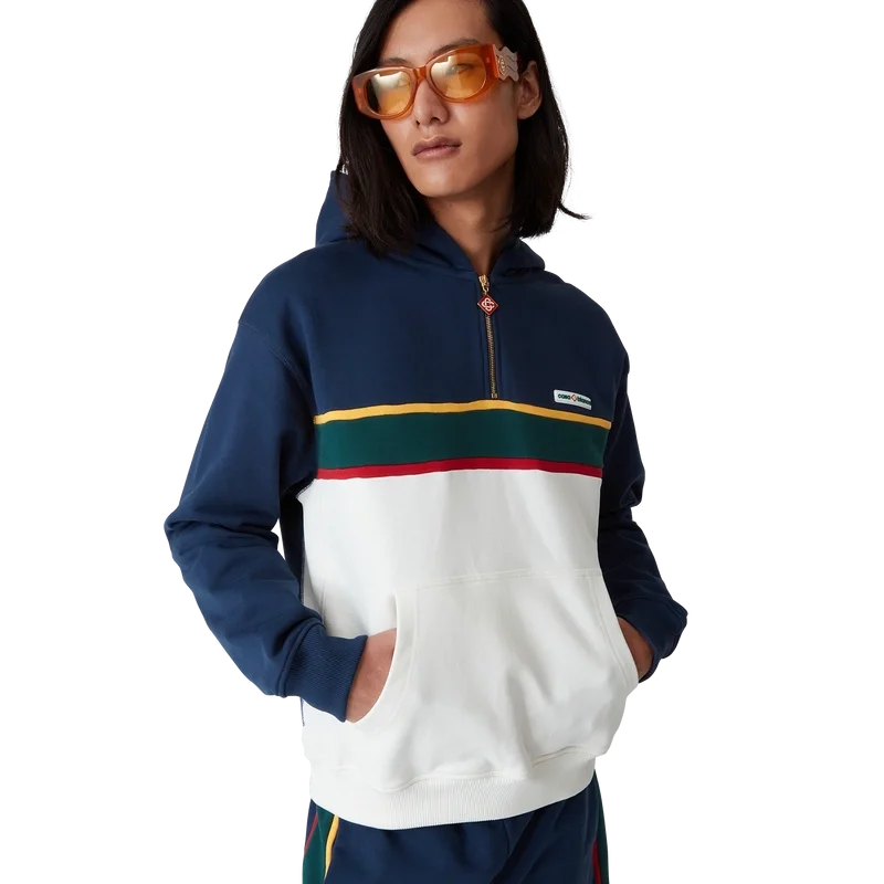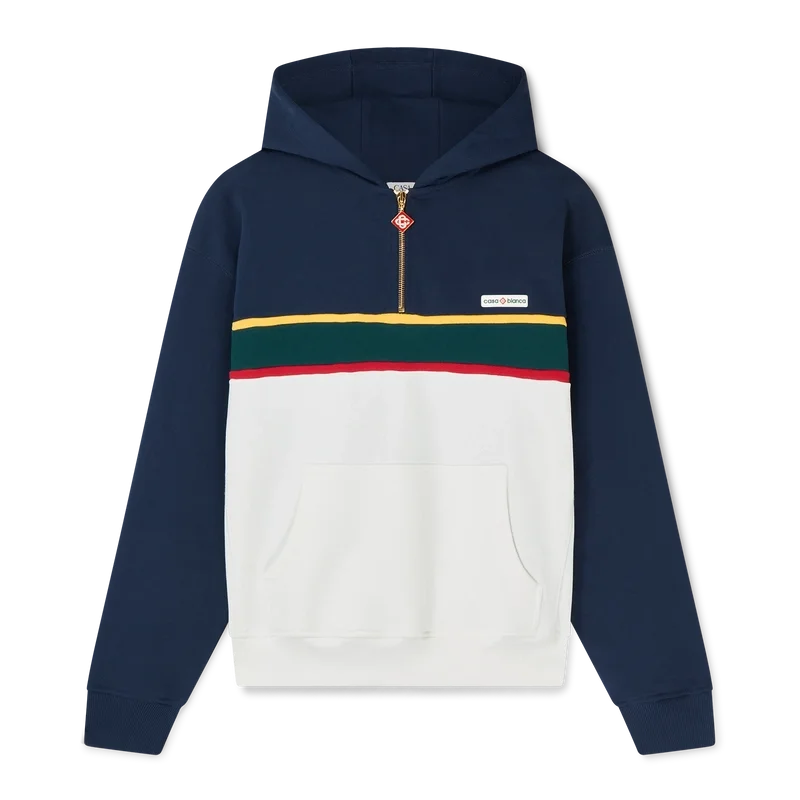 Het Colour-Block Quarter Zip Hooded Sweatshirt is een sportkledingontwerp met lange mouwen, vervaardigd uit biologisch katoen loopback-stof. Afgewerkt met een capuchon, een trekkoord met gouden uiteinden voor een stevige sluiting, contrasterende panelen, een kangoeroezak aan de voorkant en geribde manchetten en zoom.
