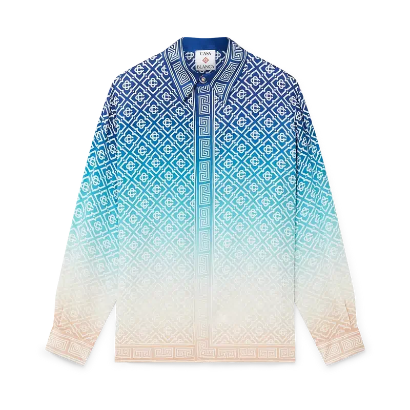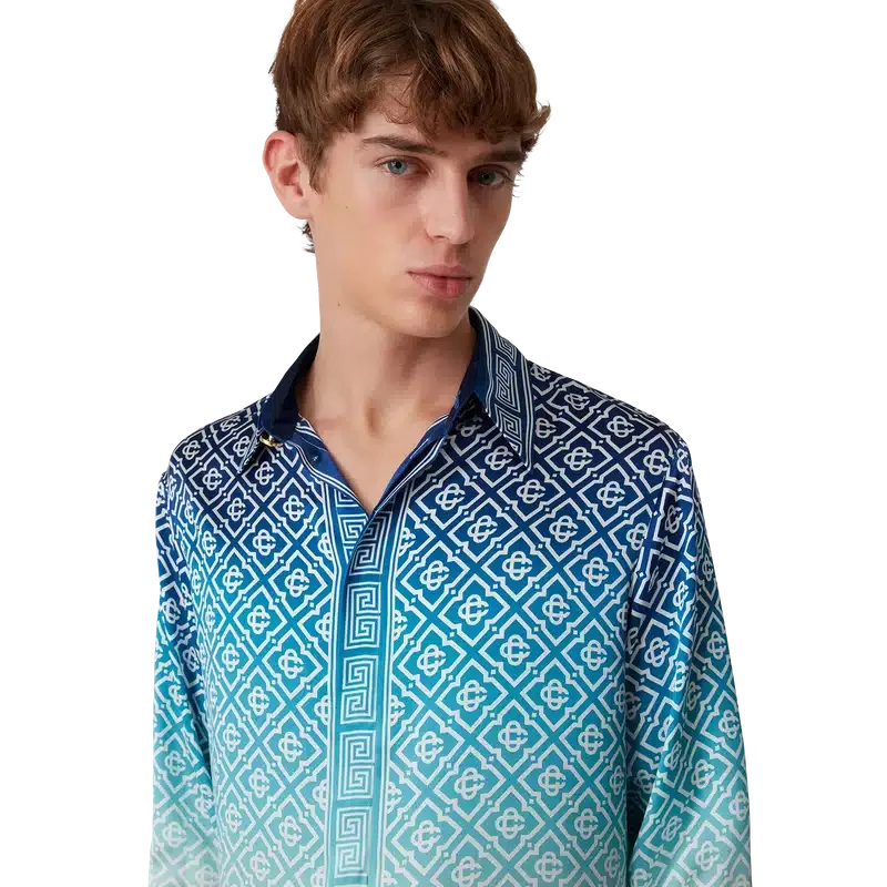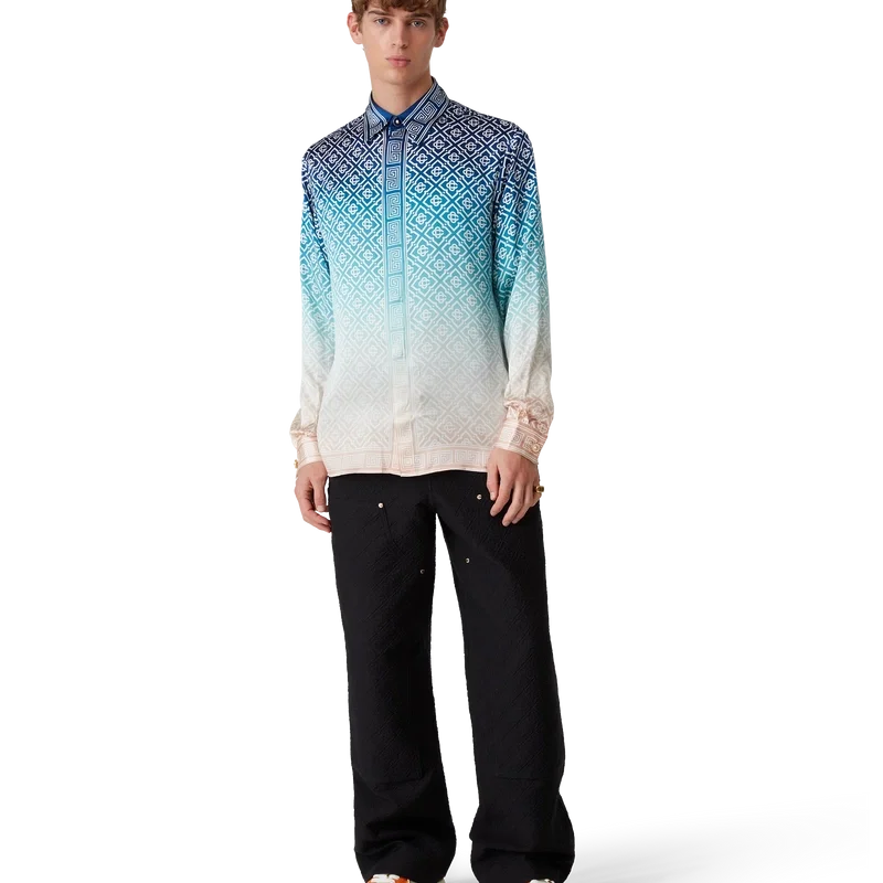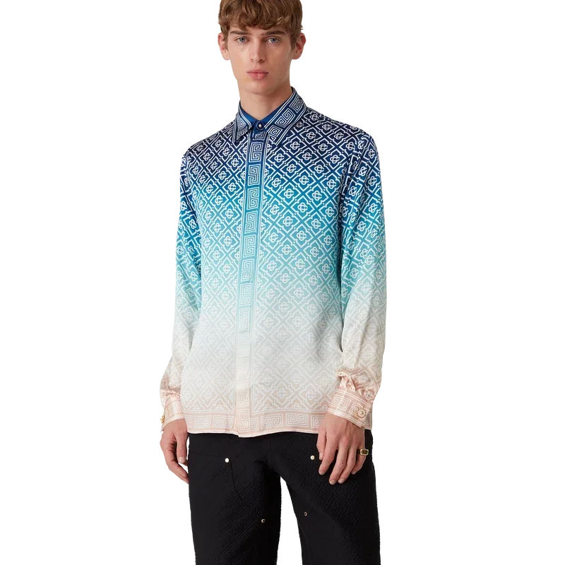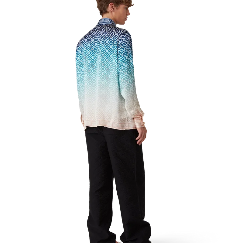 Het Jacquard-zijden overhemd met kleurverloop is een model met lange mouwen en een all-over print, vervaardigd van zijden satijn met een monogram in kleurverloop. Afgewerkt met een kraag, goudomrande geëmailleerde knopen op de mouwen en kraag, knoopsluiting aan de voorkant met in elkaar grijpende Corozo-knopen met CC-logo, en randdetails geïnspireerd op Griekse sleutels op de kraag, manchetten, knoopsluiting en zoom.