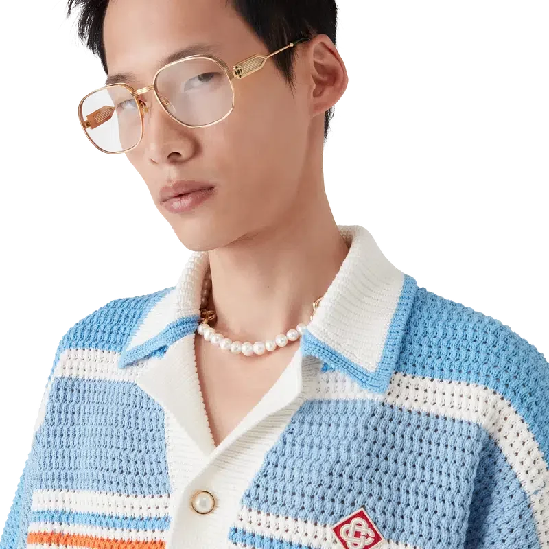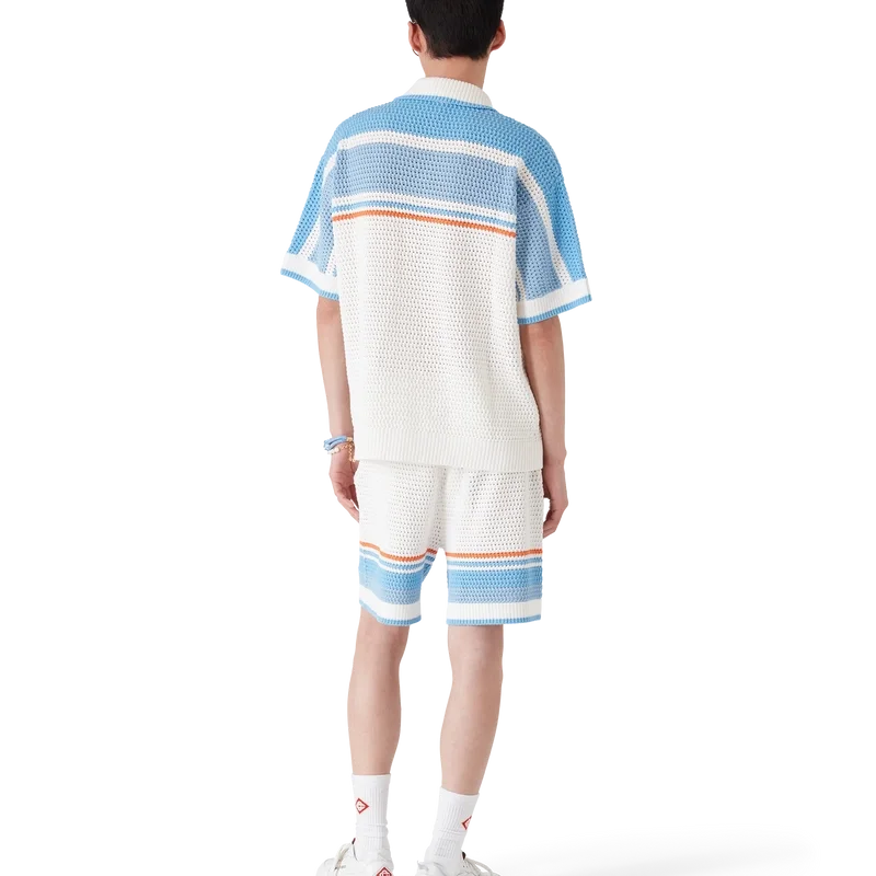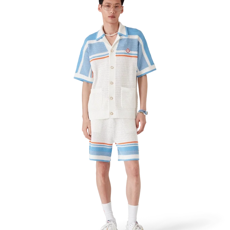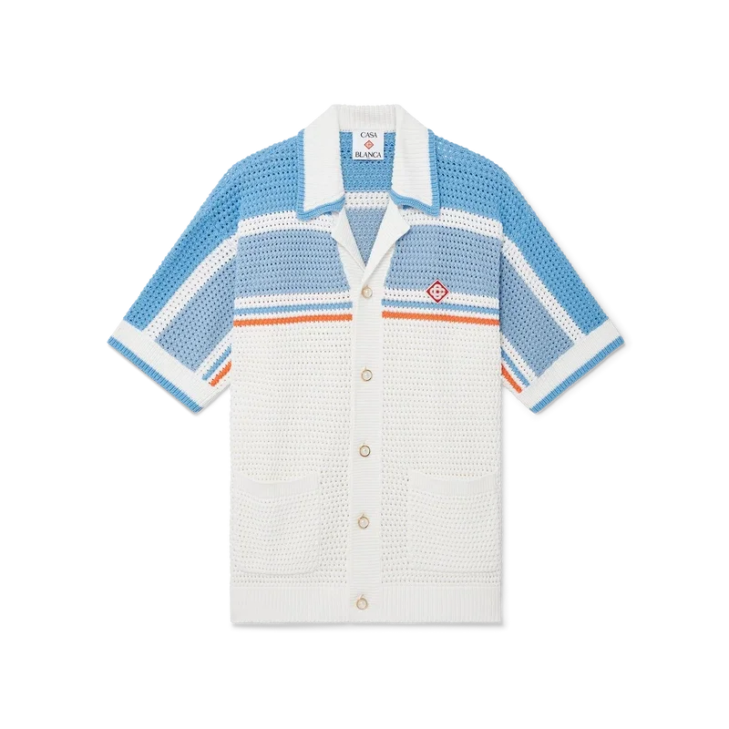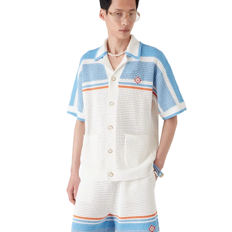 Het gehaakte tennistoefeningsoverhemd is een gebreid ontwerp met korte mouwen, vervaardigd van gehaakte katoenen stof in zachte, natuurlijke kleuren en voorzien van het kenmerkende diamantlogo van het huis. Afgewerkt met kenmerkende gouden parelknopen, streepdetails op de schouders en langs de mouwen, opgestikte zakken aan de voorkant en gestreepte randen aan de kraag en manchetten.