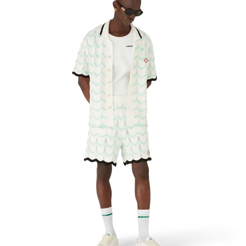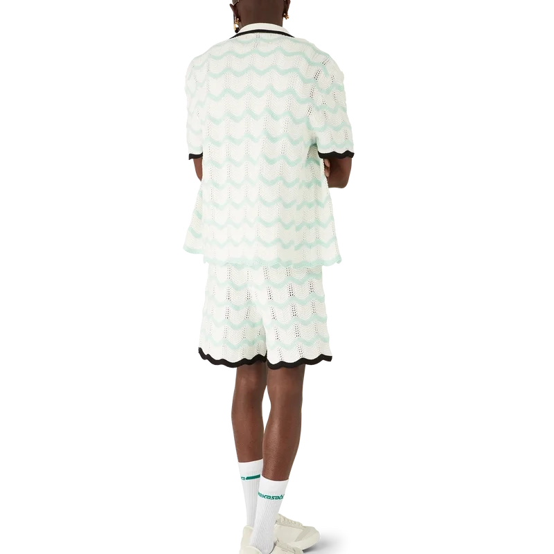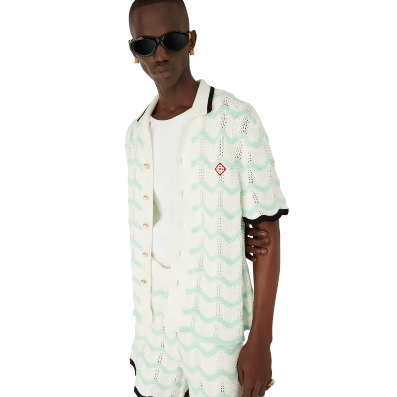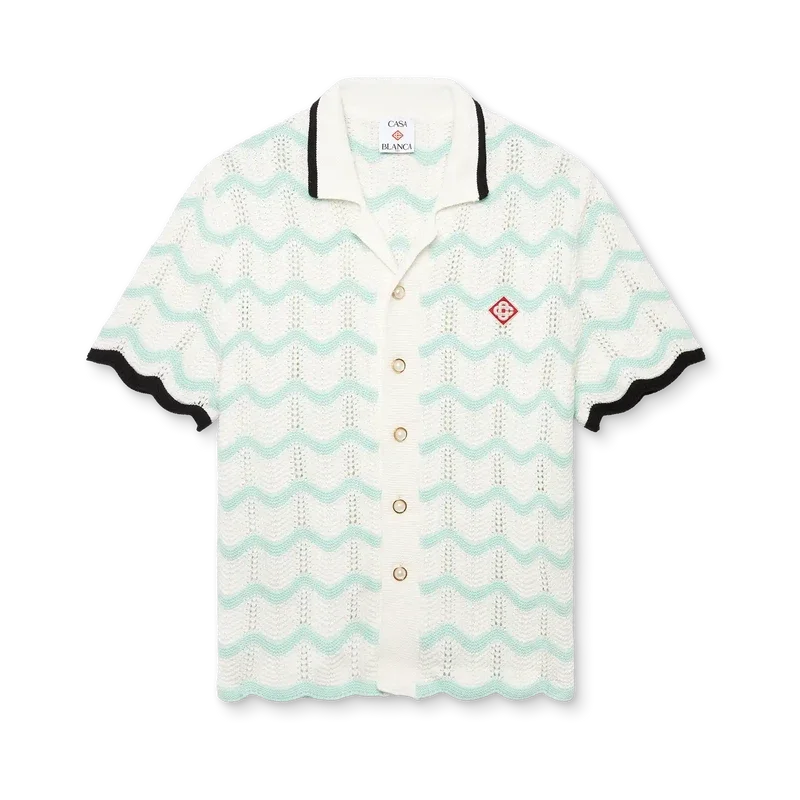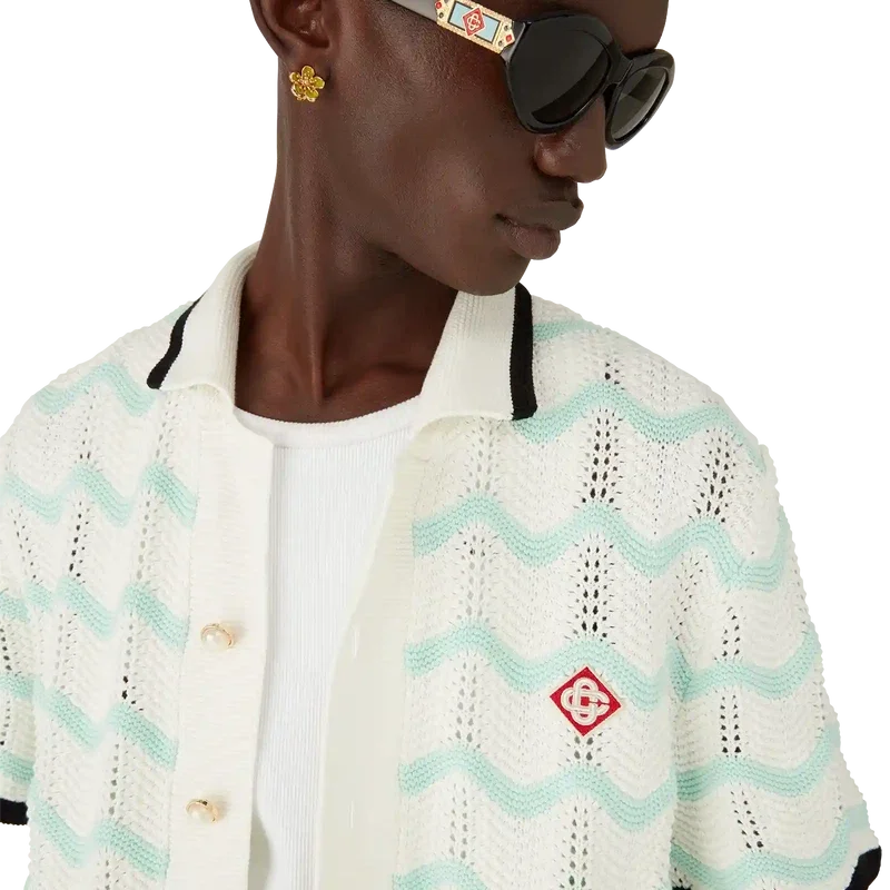 Het katoenen gehaakte short-sleeve overhemd met golfpatroon in kleurverloop is een gebreid ontwerp met het kenmerkende diamantlogo van het huis. Afgewerkt met een contrasterende zwarte geribde kraag, manchetten en knopenlijst, knoopsluiting, kenmerkende gouden parelknopen en golfranddetails op de manchetten en zoom.
