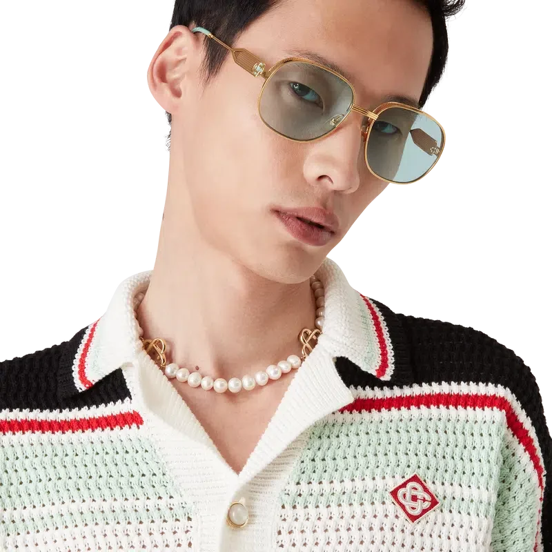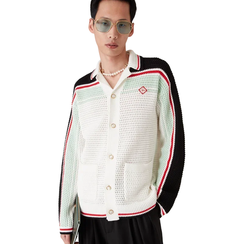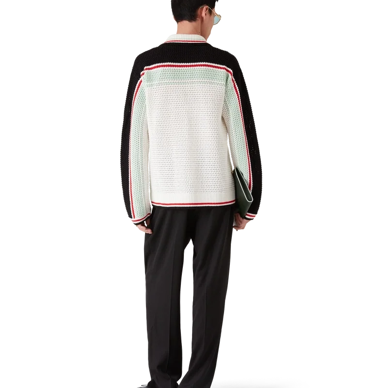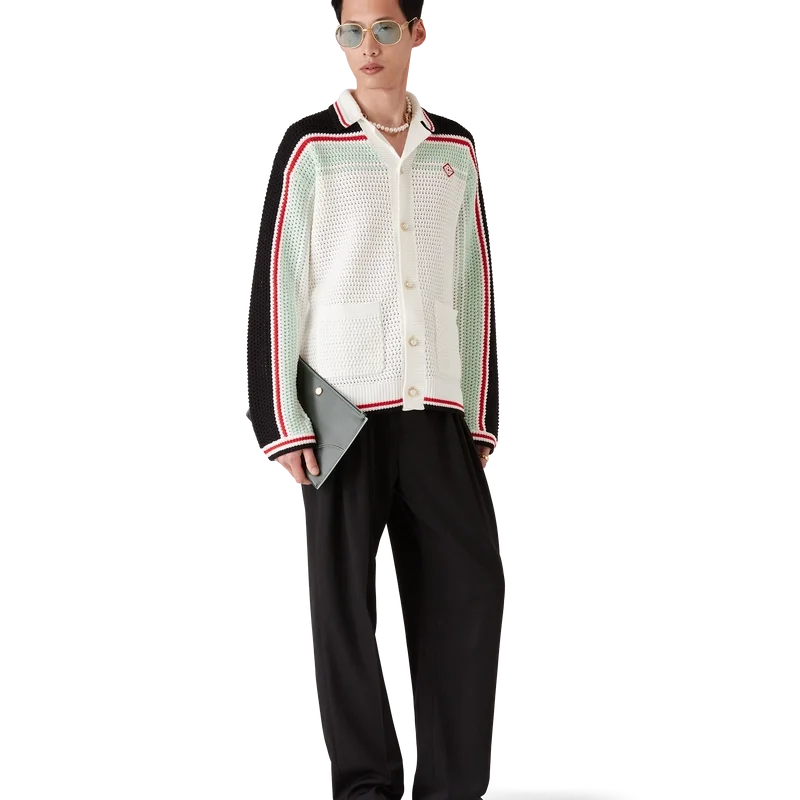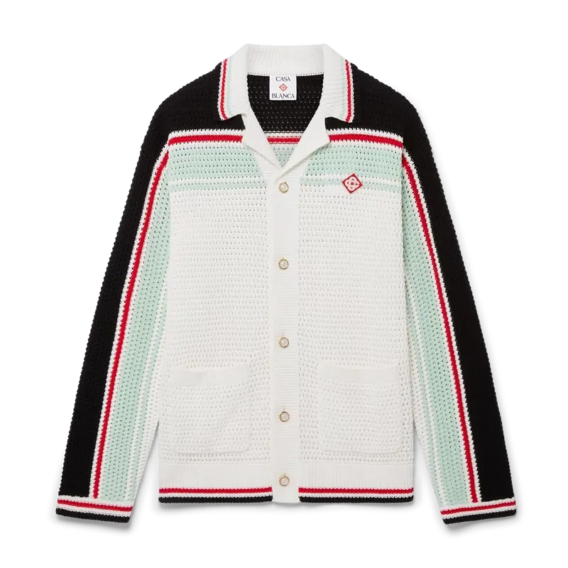 Het katoenen tennis-gehaakt jasje is een ontwerp met lange mouwen en textuur, vervaardigd uit gehaakt katoen met het kenmerkende diamantlogo van het huis, dat aansluit bij het reis- en vakantiethema van de capsulecollectie. Afgewerkt met een geribde kraag, manchetten, zoom en sluiting, opgestikte zakken aan de voorkant, knoopsluiting, kenmerkende gouden parelknopen met rand, en zwarte, rode, mintgroene en witte streepjes op de borst, rug en langs de mouwen, en gestreepte randen op de manchetten, zoom en kraag.