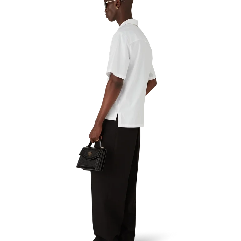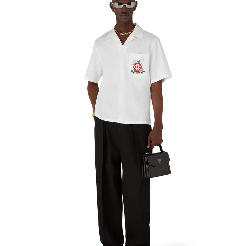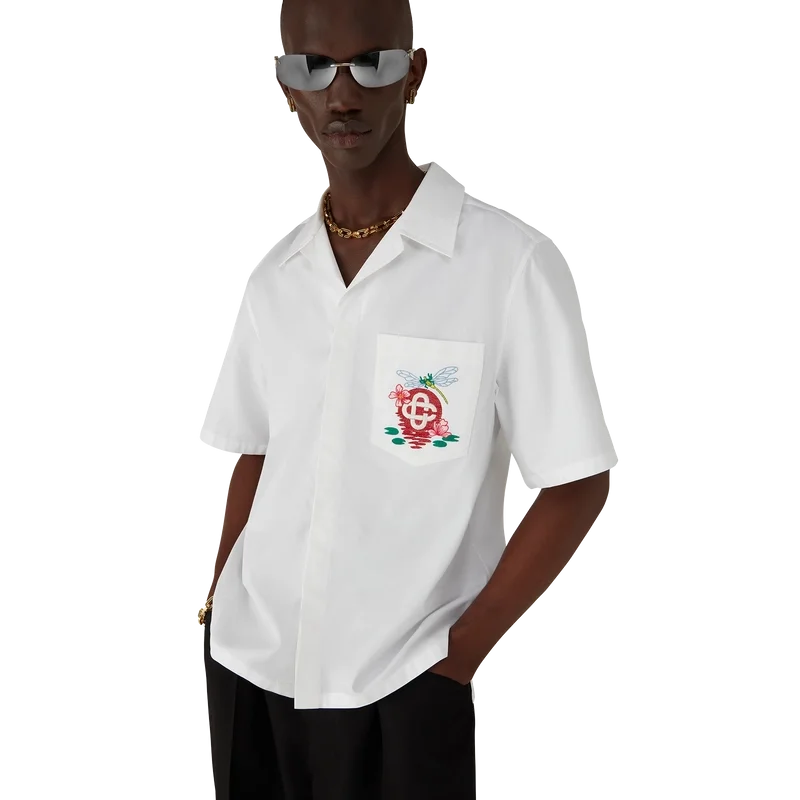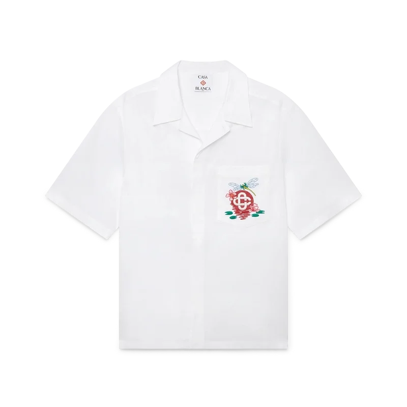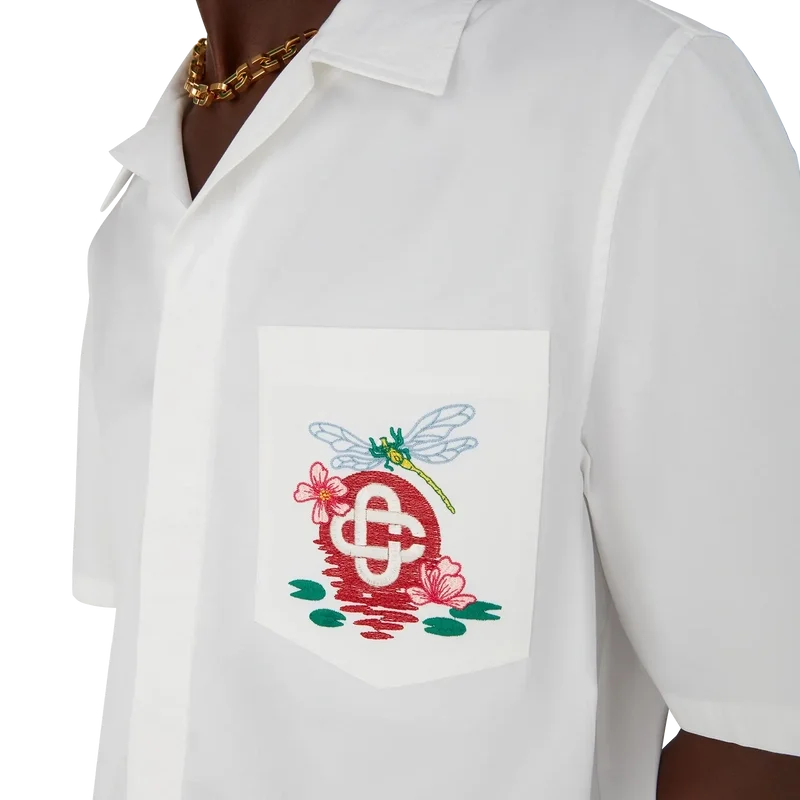 Het katoenen popeline geborduurde overhemd met korte mouwen is een klassiek ontwerp, vervaardigd uit katoen met seizoensgebonden kunstwerk waarin de libel centraal staat als belangrijk symbool, wat zorgt voor een zachter, lieflijker contrast, terwijl de lotusbloemen en de weerspiegeling van de zon op het water verwijzen naar Casablanca’s symboliek met de natuur. Afgewerkt met een Cubaanse kraag, knoopsluiting, een borstzak, kenmerkende Corozo-knopen met het in elkaar grijpende Cc-logo en een hoog-laag zoom.