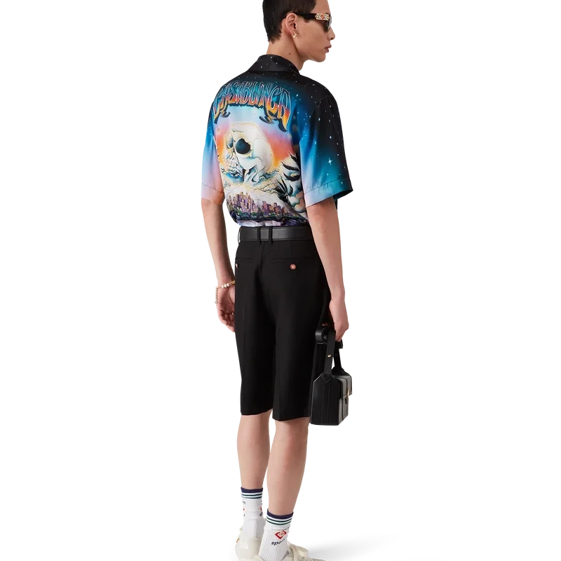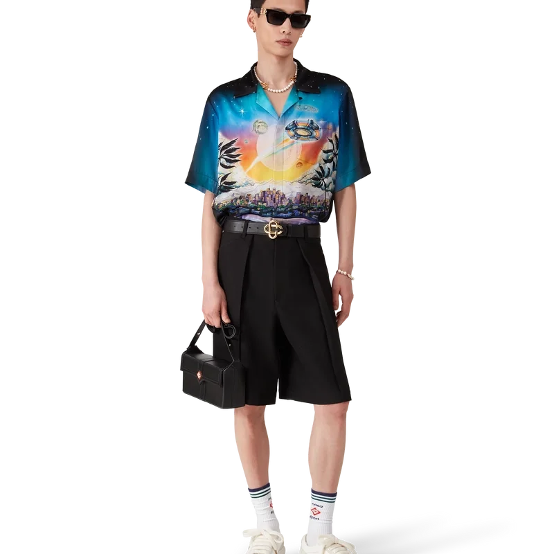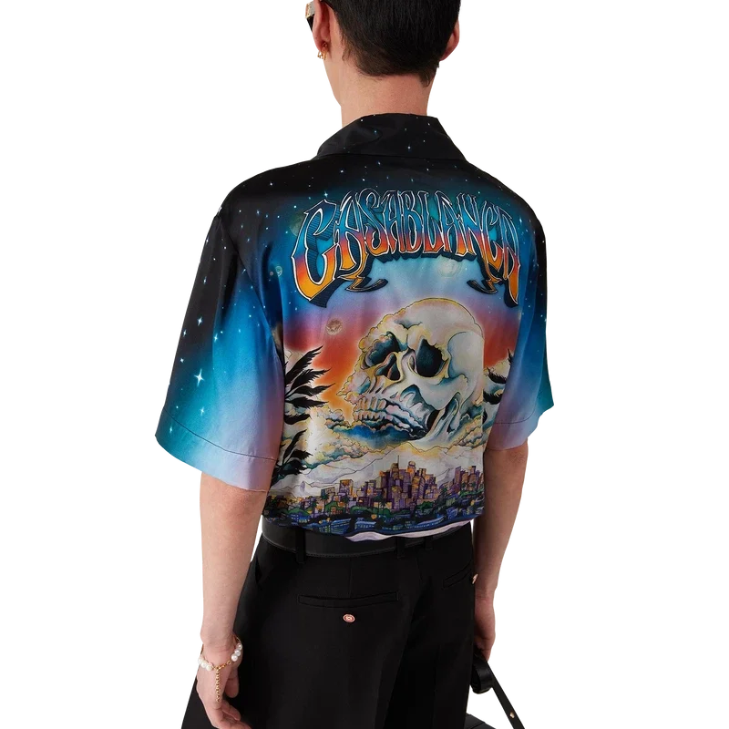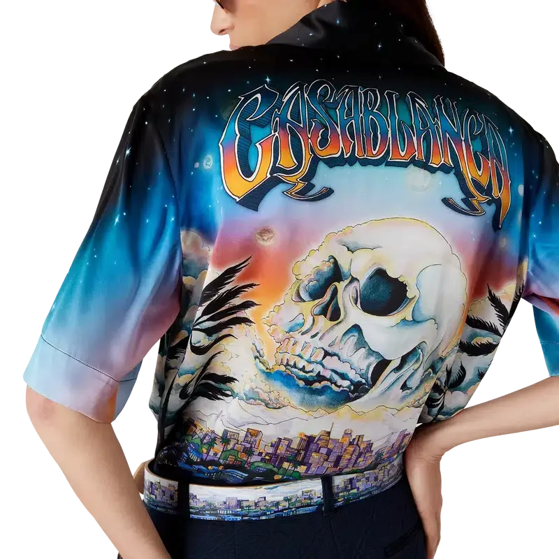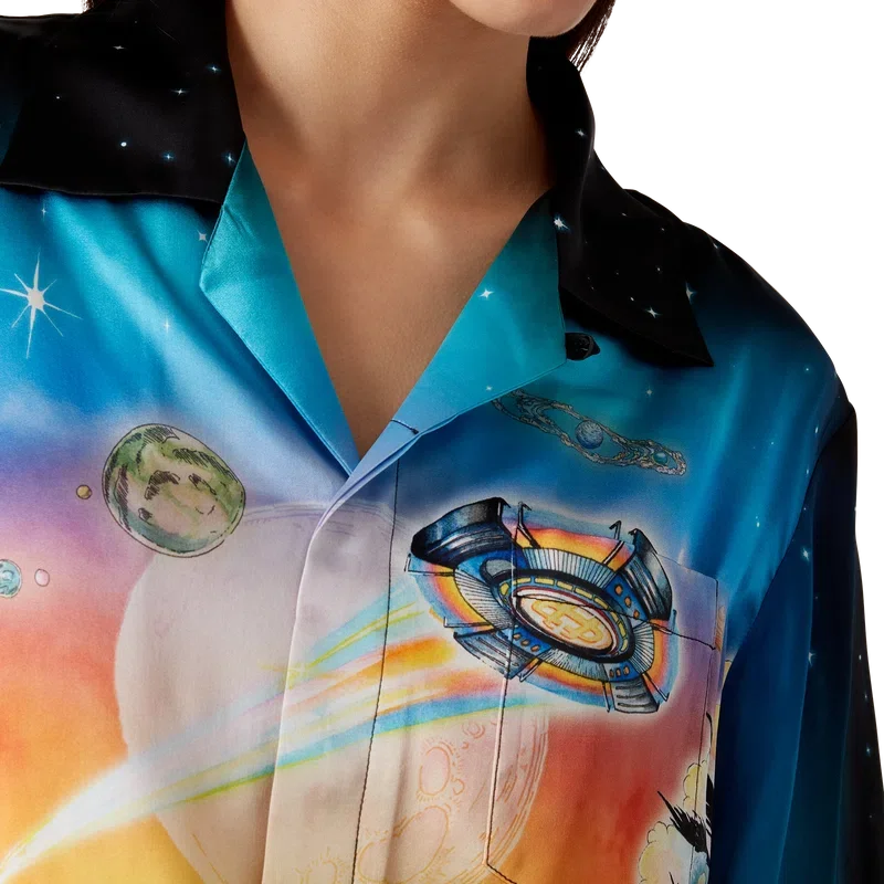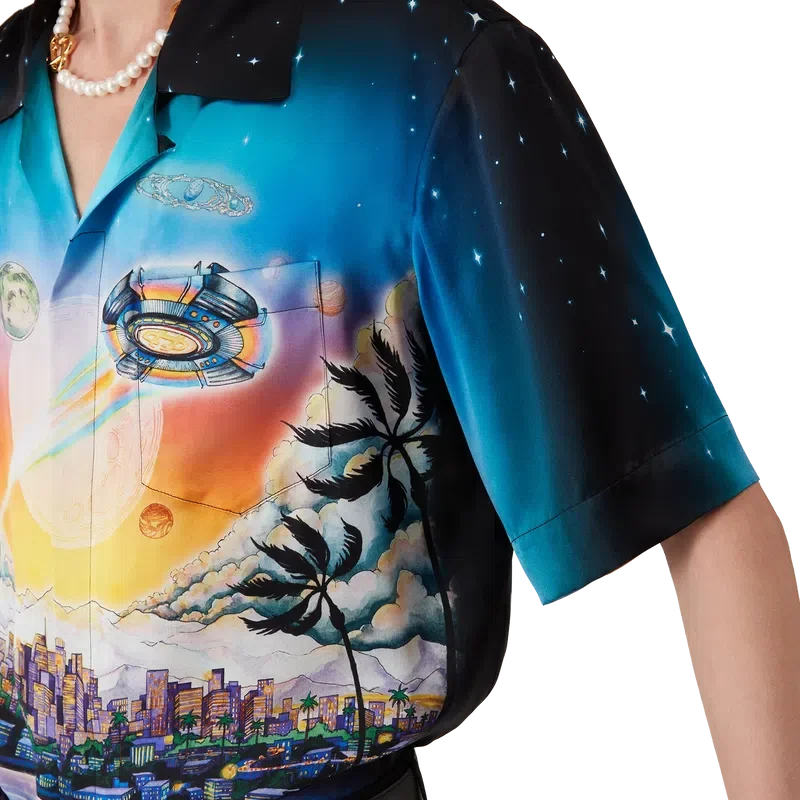 Het La Pramonition zijden overhemd is een ontwerp met korte mouwen, vervaardigd uit bedrukte zijden satijn met de kunst van dit seizoen, geïnspireerd door een griezelig visioen van de skyline van LA bij nacht, met UFO-elementen die verwijzen naar vintage sci-fi-inspiratie. Afgewerkt met een Cubaanse kraag, een borstzakje en een verborgen knoopsluiting met in elkaar grijpende CC Corozo-knopen.