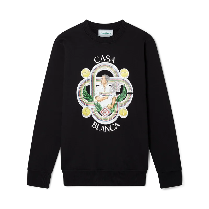 Het Le Joueur-sweatshirt van biologisch katoen met zeefdruk is uitgevoerd in zwart en voorzien van seizoensgebonden artwork waarin de kenmerkende tennisiconografie van het huis is verwerkt.