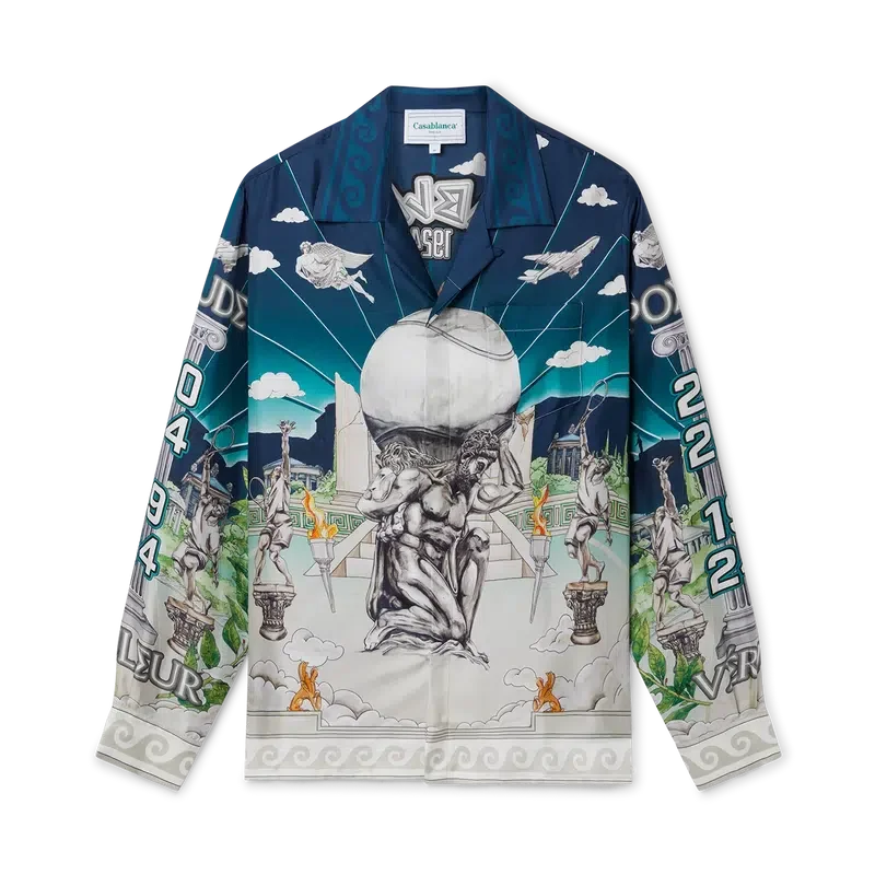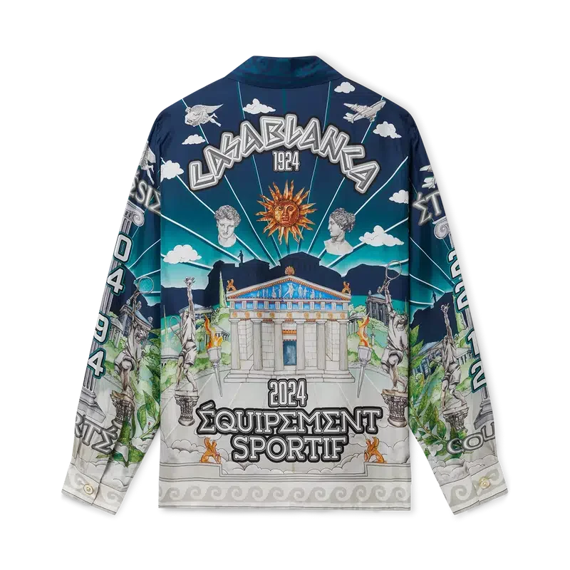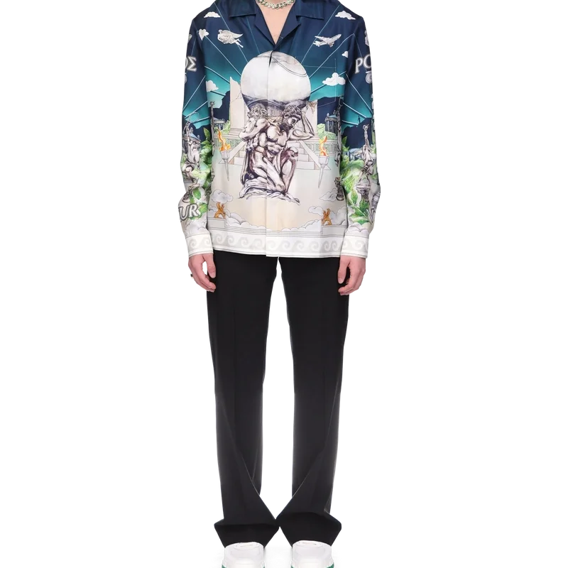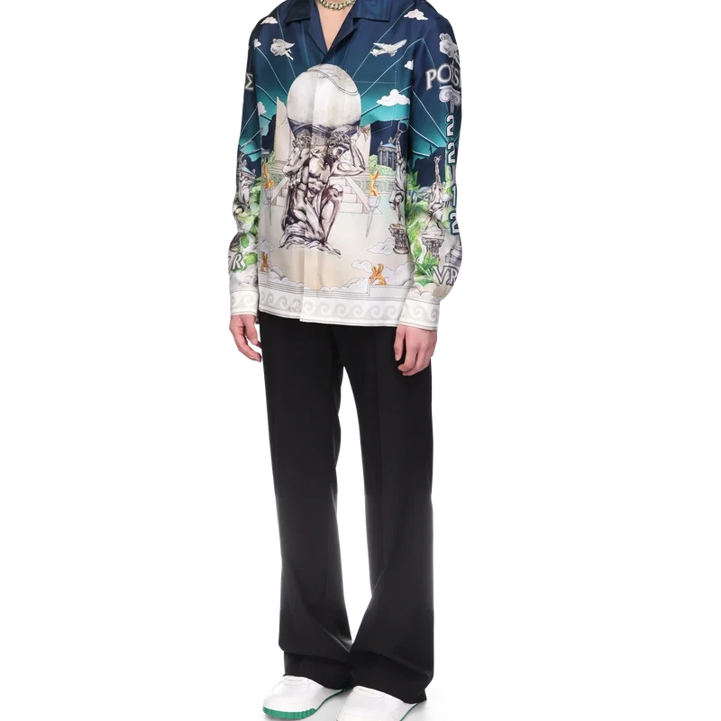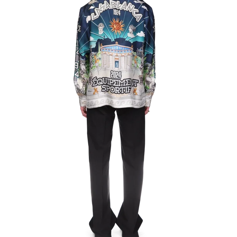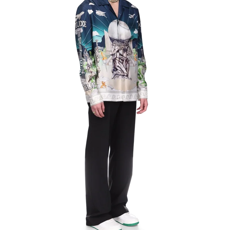 Het Le Temple Du Sport zijden overhemd is een ontwerp met lange mouwen en een all-over print en maakt deel uit van de exclusieve samenwerking met Jeff Hamilton – het is een interpretatie van onze tennisclub met een landschap en zwevende elementen – vervaardigd uit een zijden twill-stof. Afgewerkt met de kenmerkende parelknopen met gouden rand van het huis, knoopsluiting, een Cubaanse kraag en het op Griekse golven geïnspireerde randdetail van dit seizoen op de kraag, manchetten en zoom.
