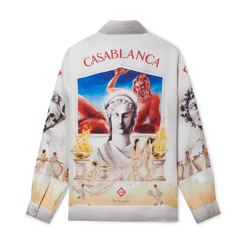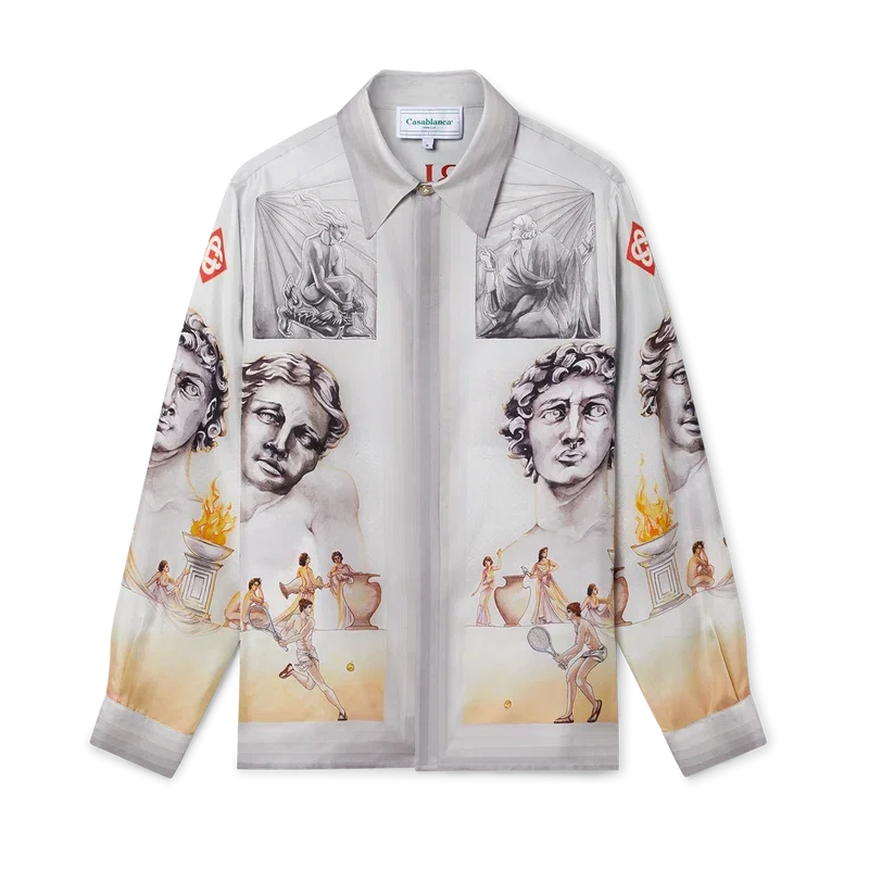Het Le Theatre zijden overhemd is een ontwerp met lange mouwen en een all-over print, vervaardigd uit een zijden twill-stof met de seizoensgebonden kunstwerken van het huis, geïnspireerd op vintage theaterposters, met afbeeldingen van oude Griekse beelden en tennis, in een nieuwe en frisse lay-out. Afgewerkt met de kenmerkende parelknopen met gouden rand van het huis, knoopsluiting, een Cubaanse kraag en details met kleurverloopstrepen op de manchetten, zoom, kraag en knoopsluiting.