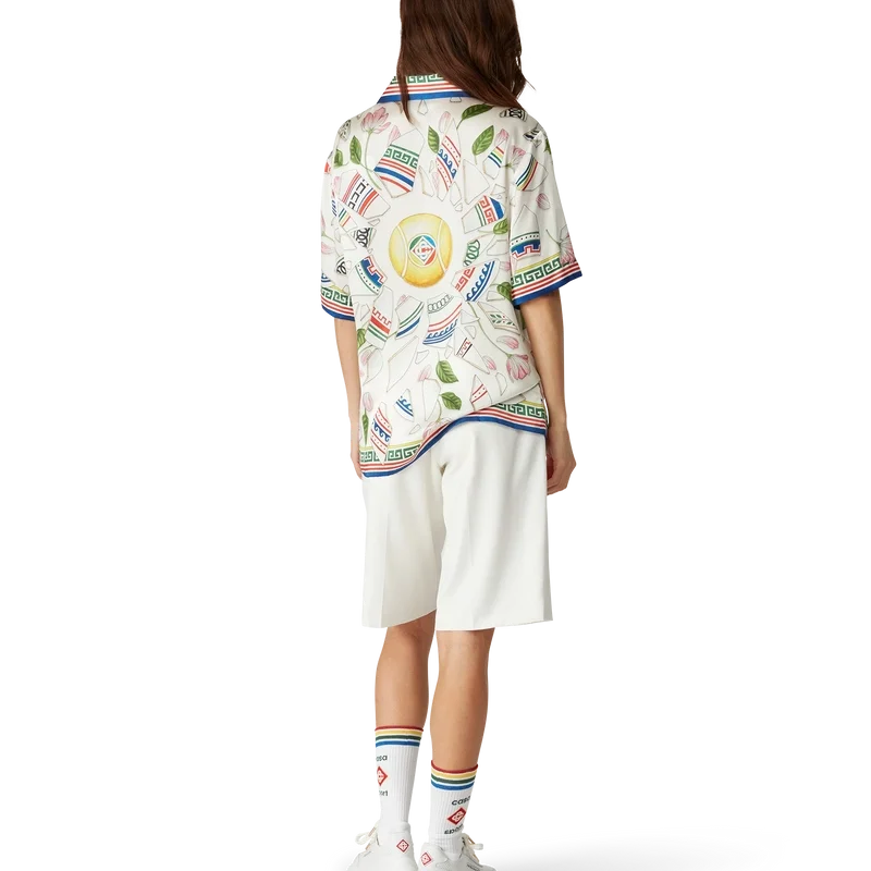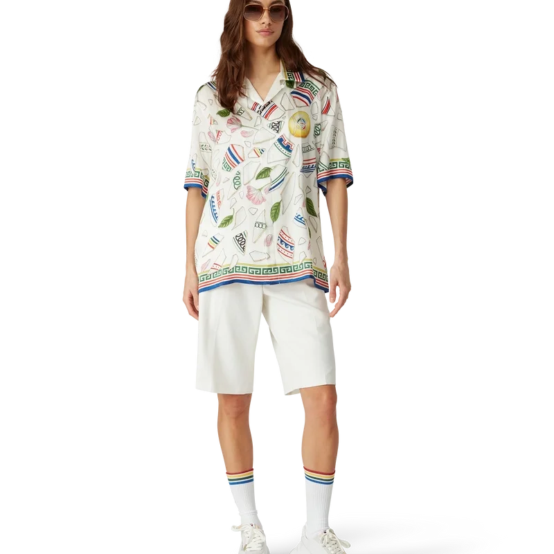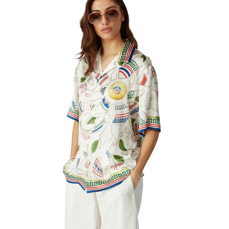 Het Le Vase Brise zijden overhemd is een ontwerp met korte mouwen en een all-over print, vervaardigd uit zijden satijn met de seizoensprint van het huis, geïnspireerd door de voortdurende studie van de klassieke schoonheid en hedendaagse allure van het oude Griekenland. Afgewerkt met kenmerkende Corozo-knopen met het in elkaar grijpende CC-logo, knoopsluiting, een Cubaanse kraag en op Griekse sleutels geïnspireerde details op de manchetten, kraag en zoom.