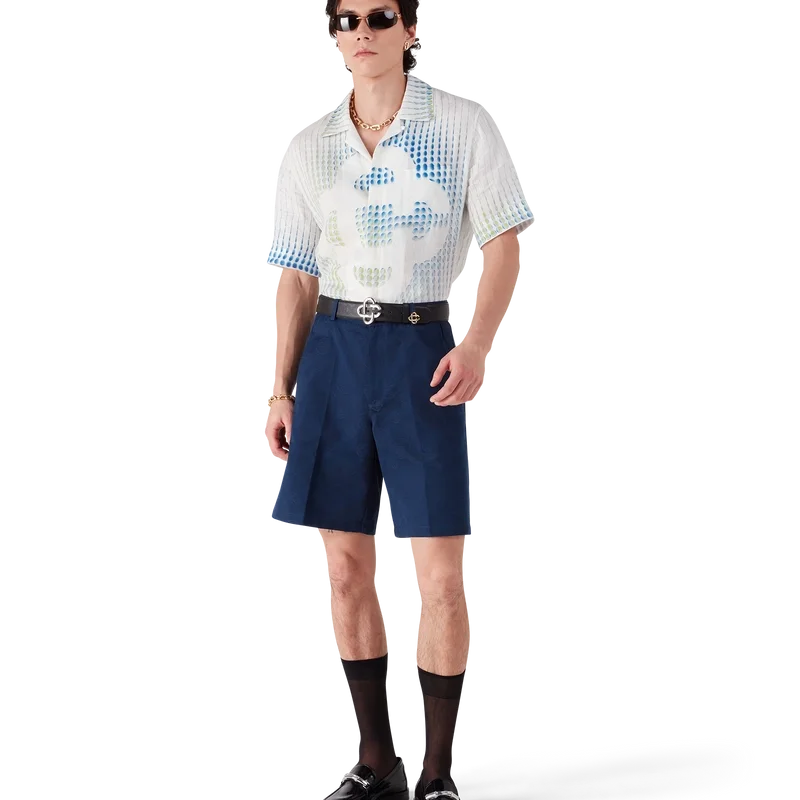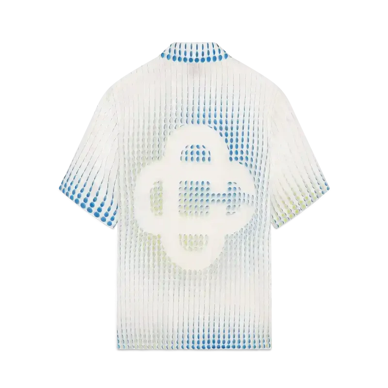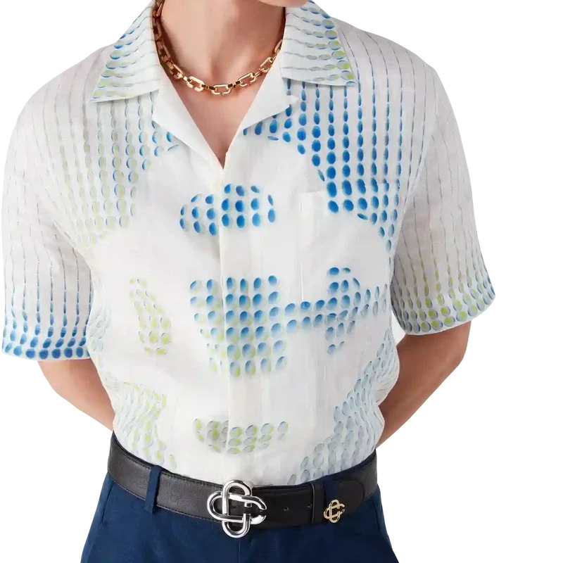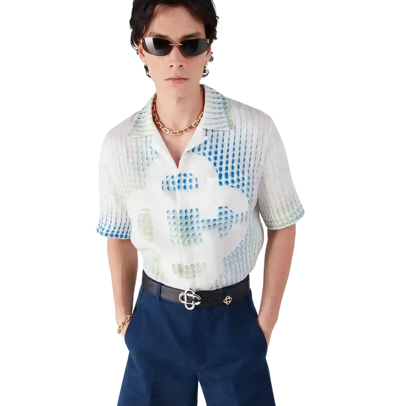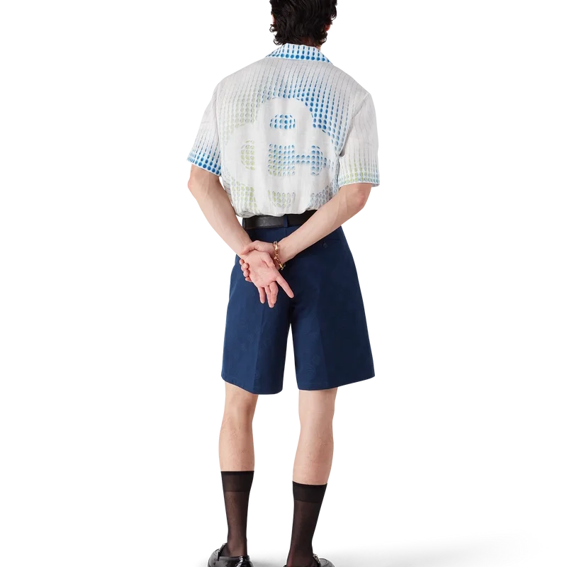 Het Dots-overhemd met korte mouwen is een verfijnd ontwerp met een print die is ontstaan uit de samenwerking van het huis met Martin Naumann. Naumann, bekend om zijn werk met kleurverlopen en textuureffecten, heeft het logo van het huis opnieuw vormgegeven door een experimentele lens, waardoor een samenspel ontstaat van halftoonafbeeldingen en glasachtige transparanties. Afgewerkt met een Cubaanse kraag, knoopsluiting en in elkaar grijpende Cc-logo-knopen van corozo.