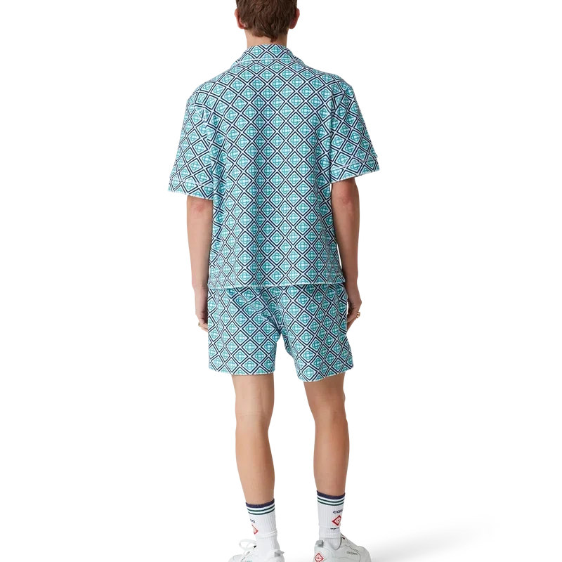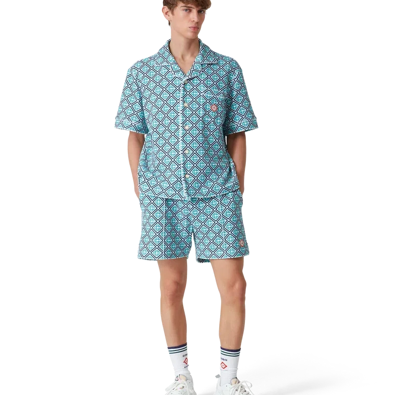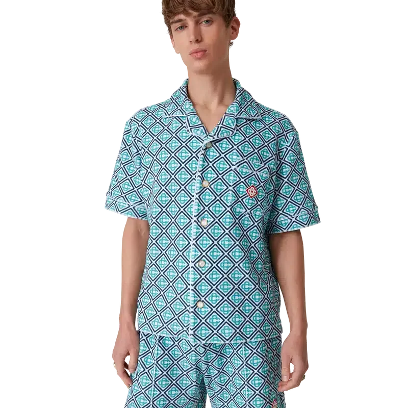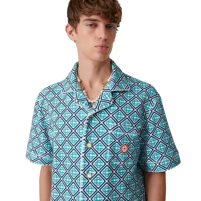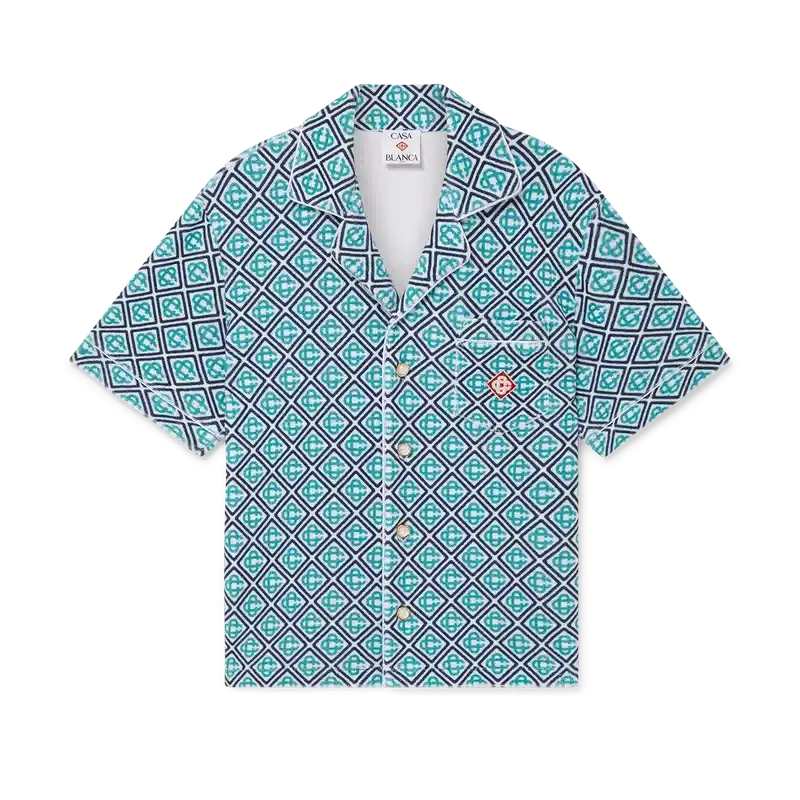 Het Monogram badstof overhemd is een ontwerp met korte mouwen, vervaardigd uit Monogram badstof met een Monogram in kleurverloop, wat een nieuwe draai geeft aan de kenmerkende Casablanca-print. Afgewerkt met een knoopsluiting, kenmerkende gouden parelknopen, een borstzak en biezen aan de kraag, de knoopsluiting, de manchetten en de zak.
