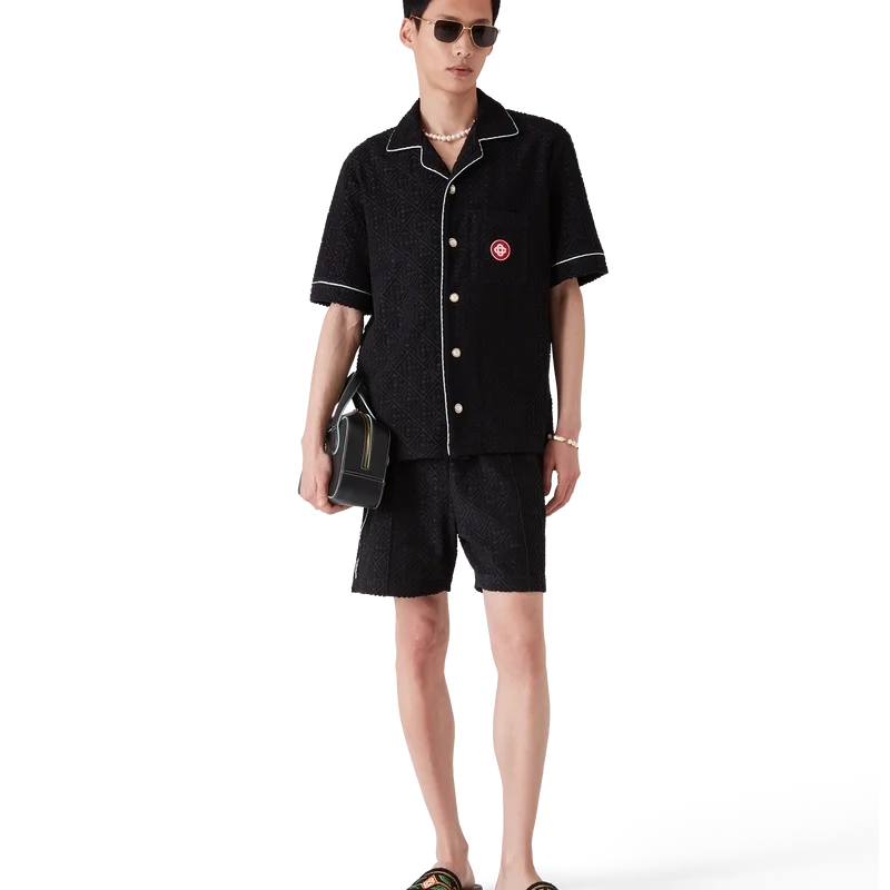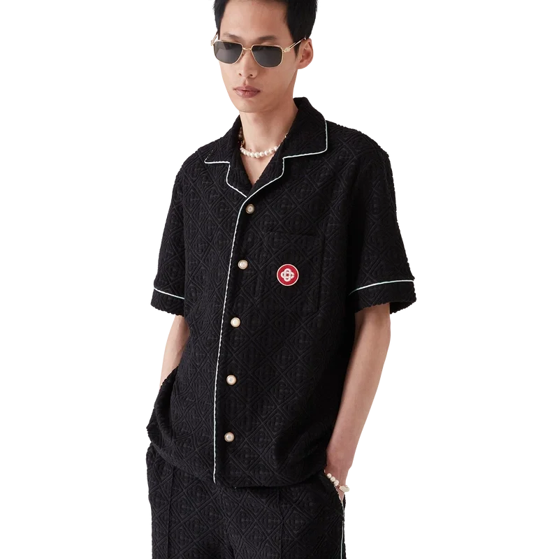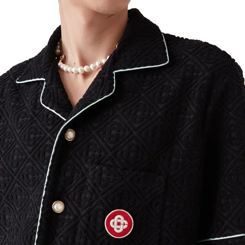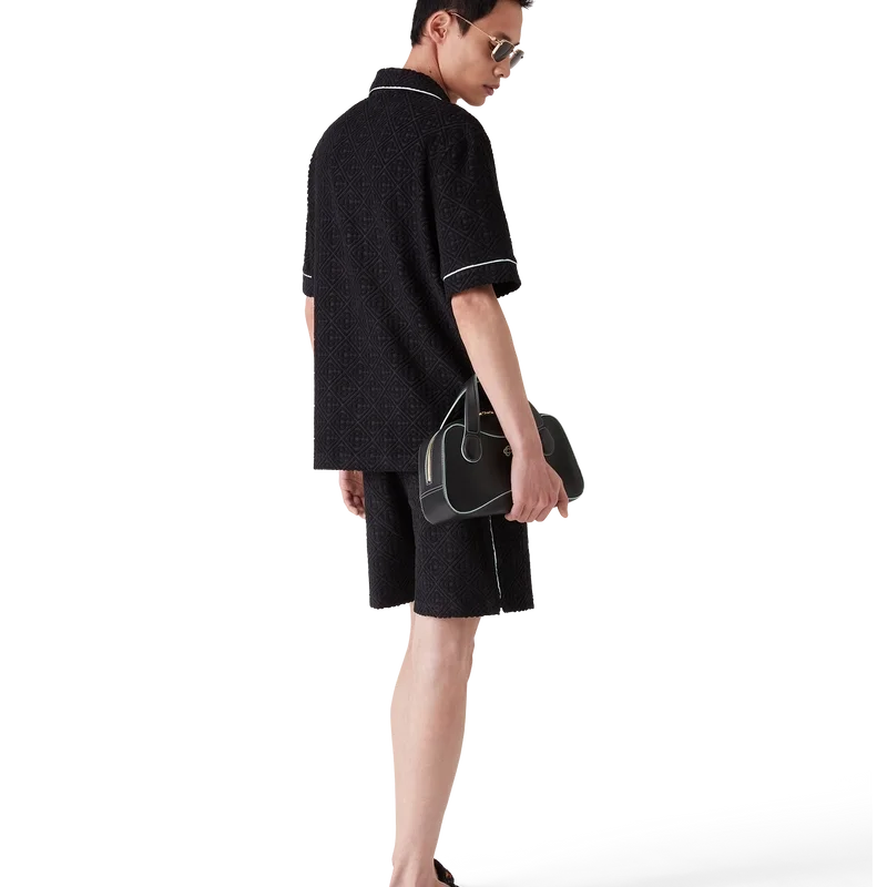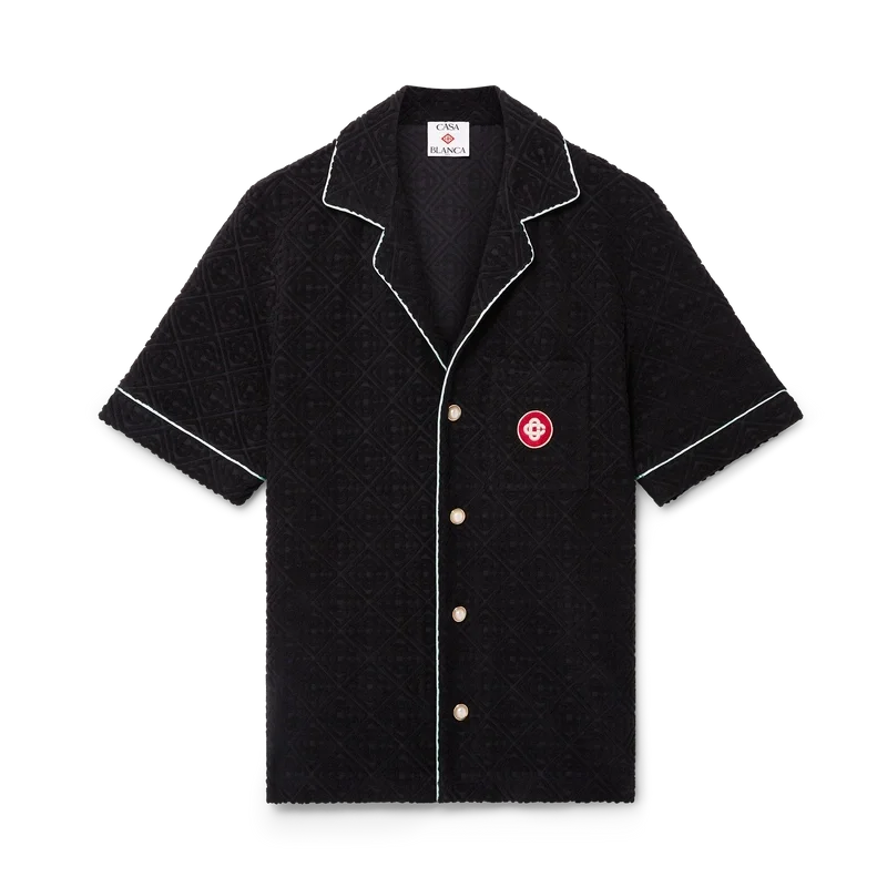 Het Monogram badstof overhemd met korte mouwen is een klassiek ontwerp, vervaardigd uit badstof met monogram. Afgewerkt met een knoopsluiting, kenmerkende gouden parelknopen, een borstzak en biezen op de kraag, de knoopsluiting, de manchetten en de borstzak.