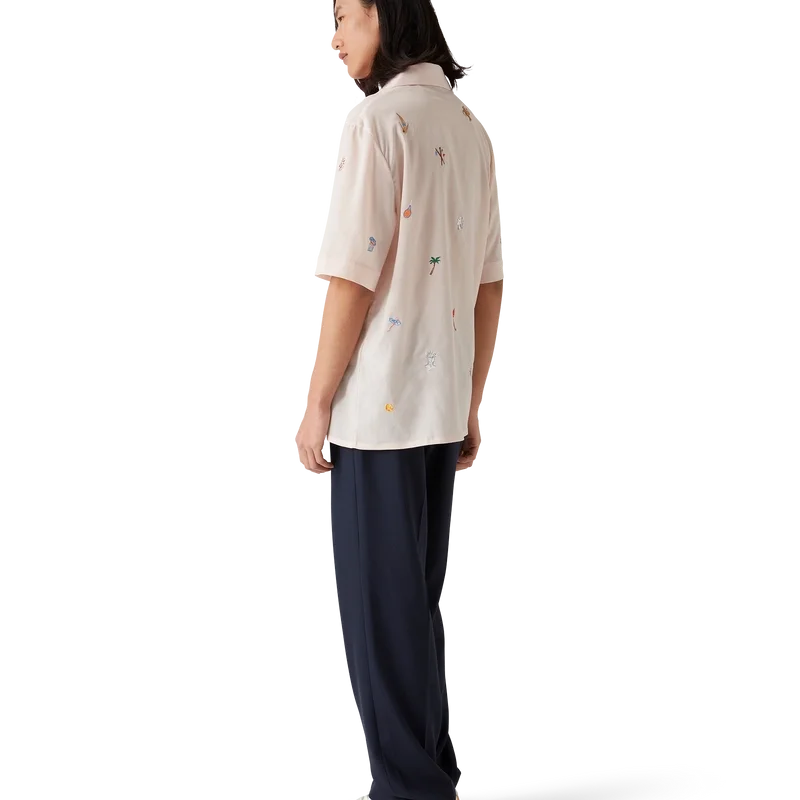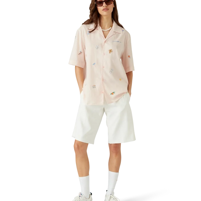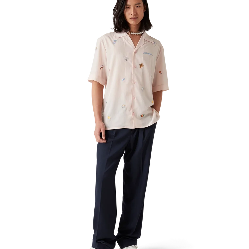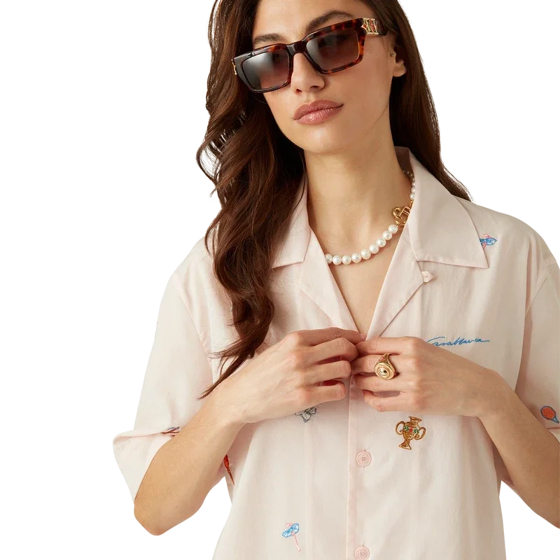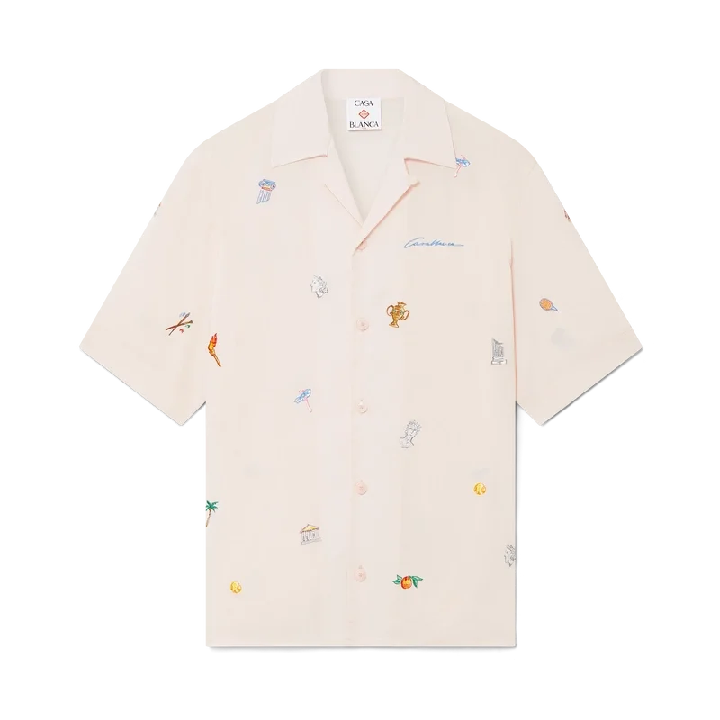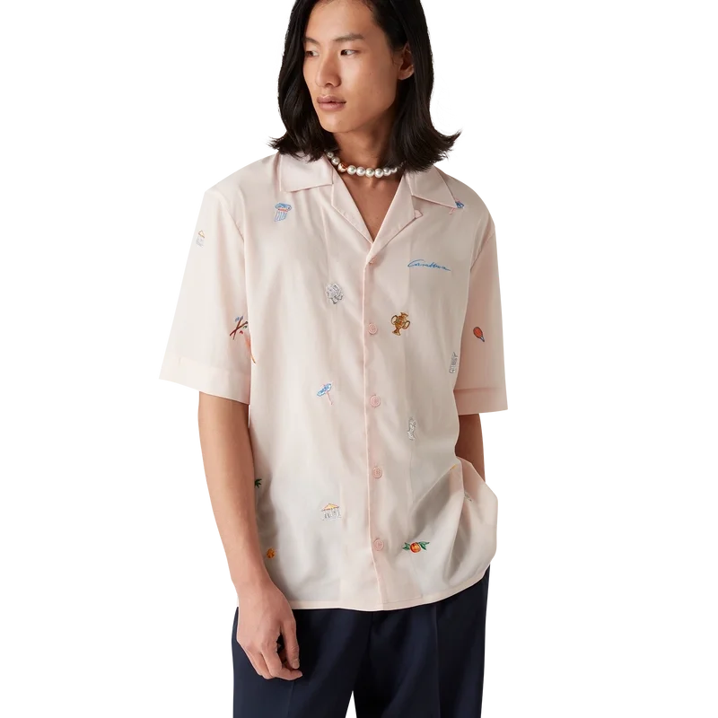 Het overhemd met geborduurd motief is een ontwerp met korte mouwen, vervaardigd uit een geborduurde stof met geborduurde kunstwerken die de symboliek van het huis met de natuur, tennis en architectuur weergeven. Afgewerkt met knoopsluiting, in elkaar grijpende CC-logo-knopen van corozo en een Cubaanse kraag.