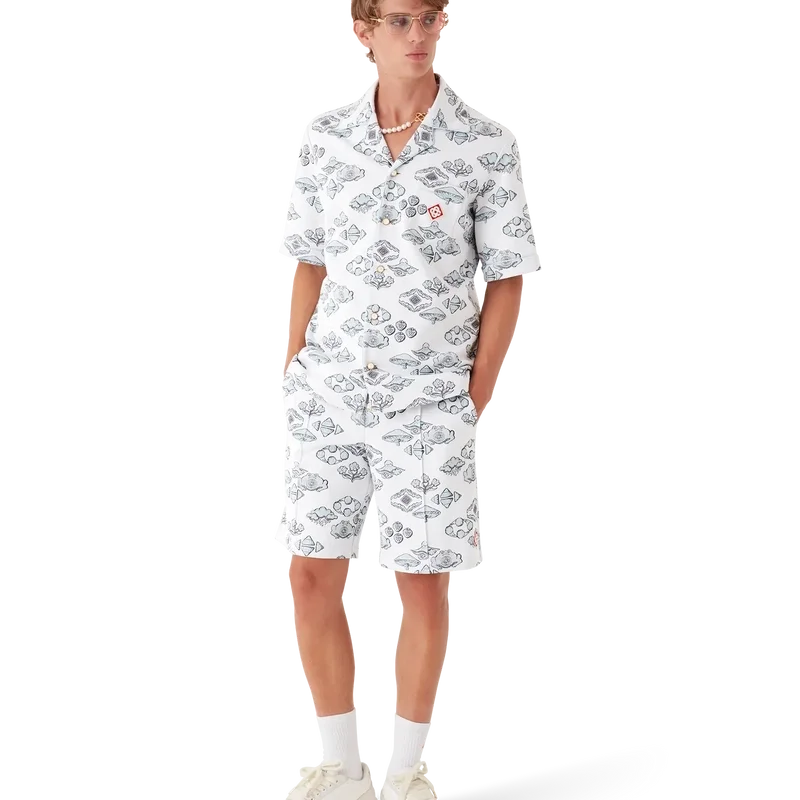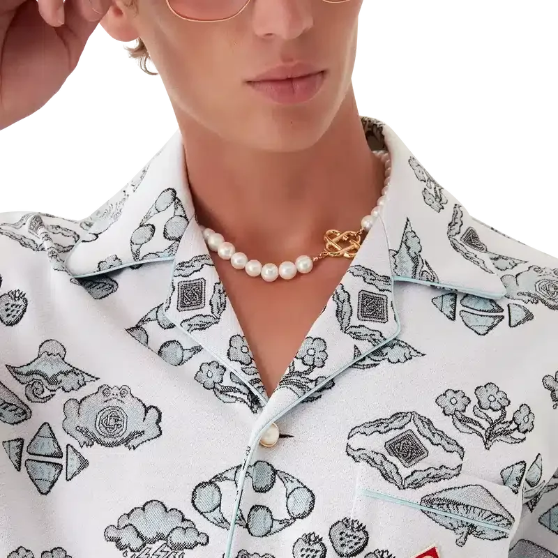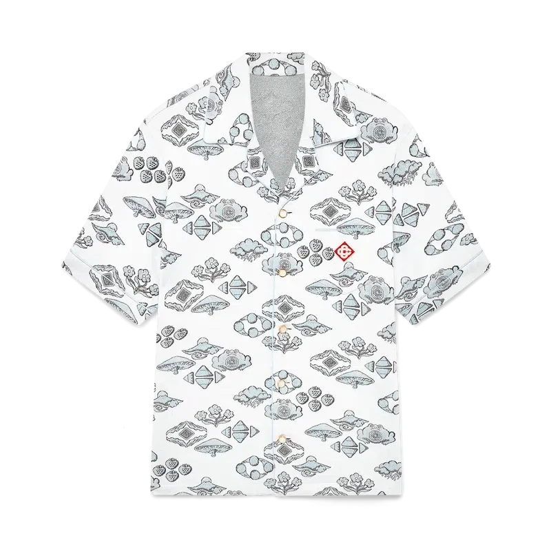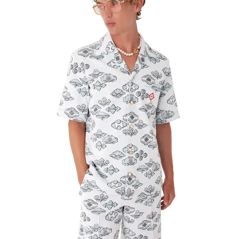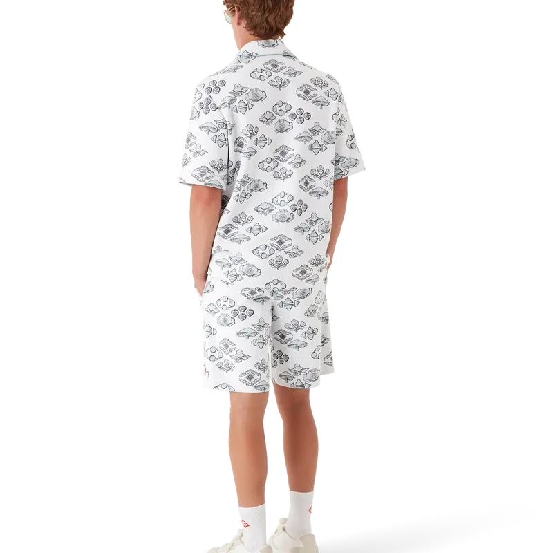 Het overhemd met korte mouwen en jacquardmotief is een klassiek ontwerp met het kenmerkende diamantlogo van het huis en kunstwerken geïnspireerd op de natuur en tennis in een ruitpatroon. Afgewerkt met een Cubaanse kraag, knoopsluiting, kenmerkende parelknopen met gouden rand, een borstzakje en biezen op de kraag, manchetten, knoopsluiting en borstzakje.