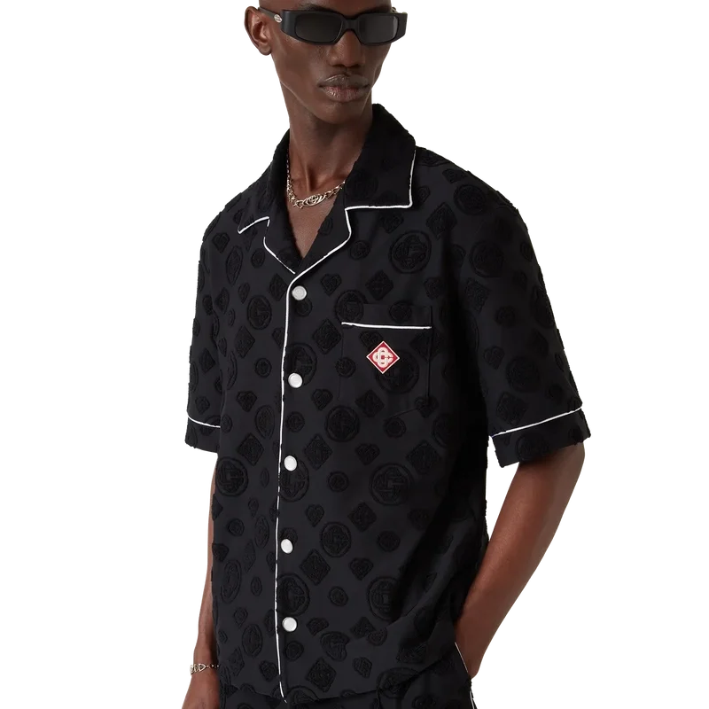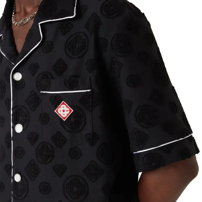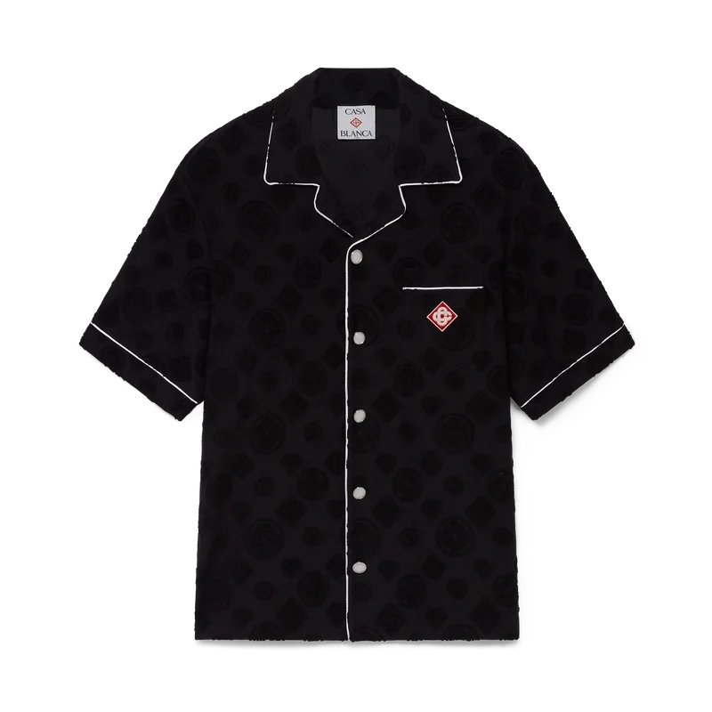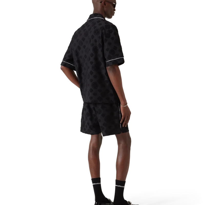 Het Monogram-overhemd met korte mouwen van badstof is een ontwerp met de kenmerkende Diamond Monogram-print van het huis. Afgewerkt met een borstzak, contrasterende biezen, kenmerkende gouden parelknopen en een Cubaanse kraag.