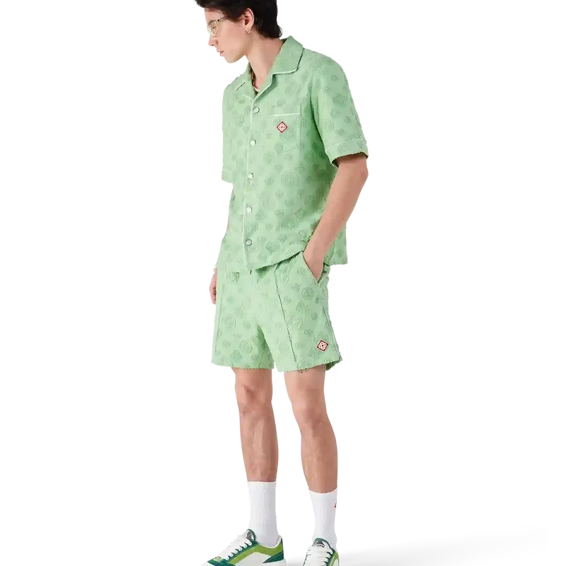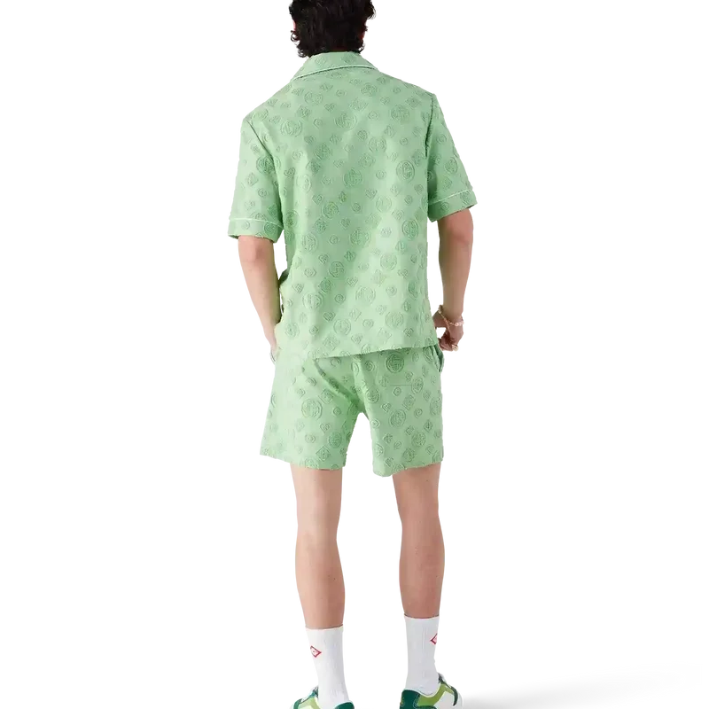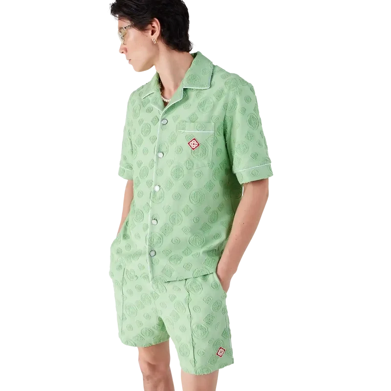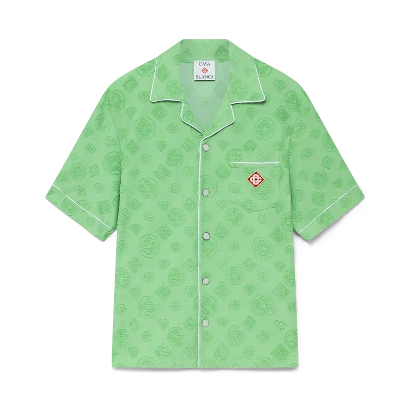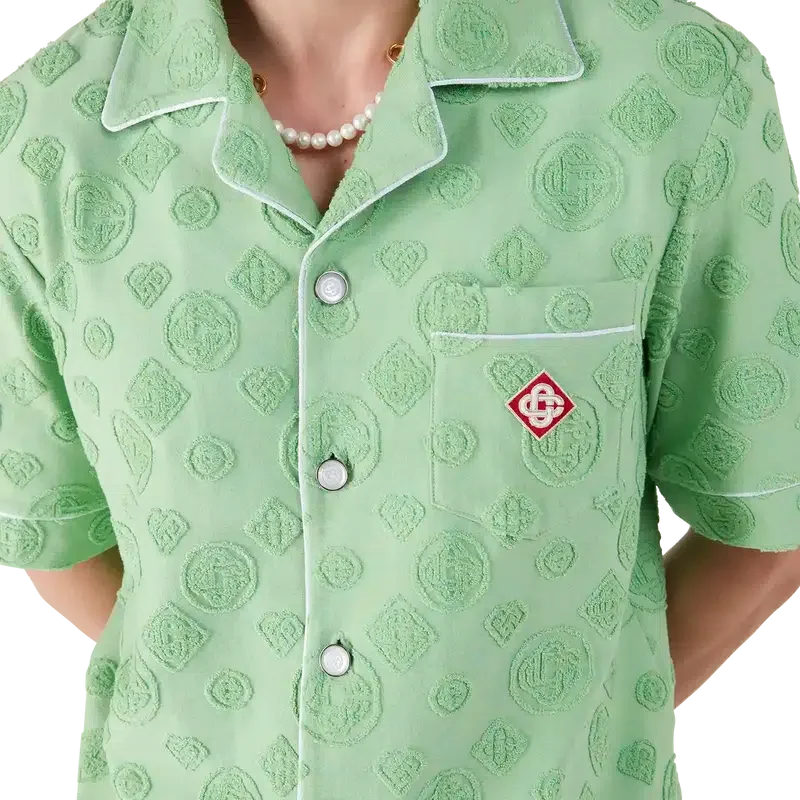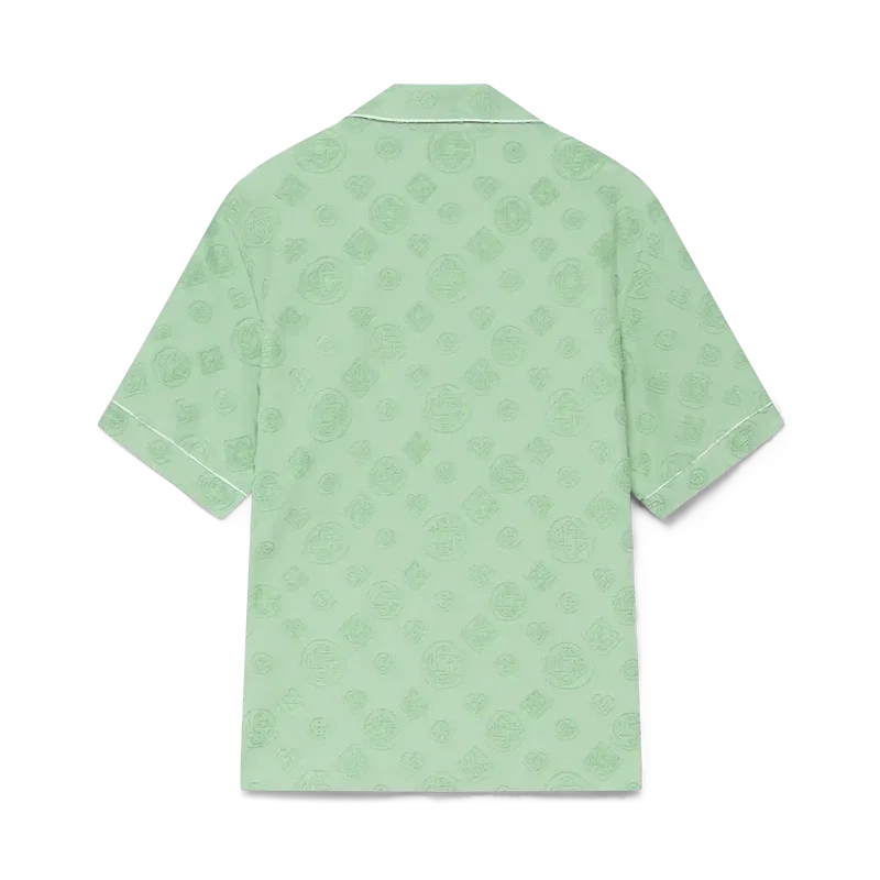 Het T-shirt met korte mouwen van badstof met monogram is een ontwerp met de kenmerkende Diamond Monogram-print van het huis. Afgewerkt met een borstzak, contrasterende biezen, kenmerkende gouden parelknopen en een Cubaanse kraag.