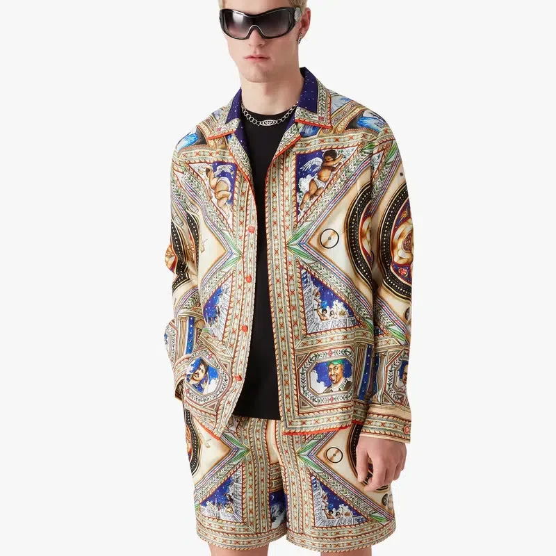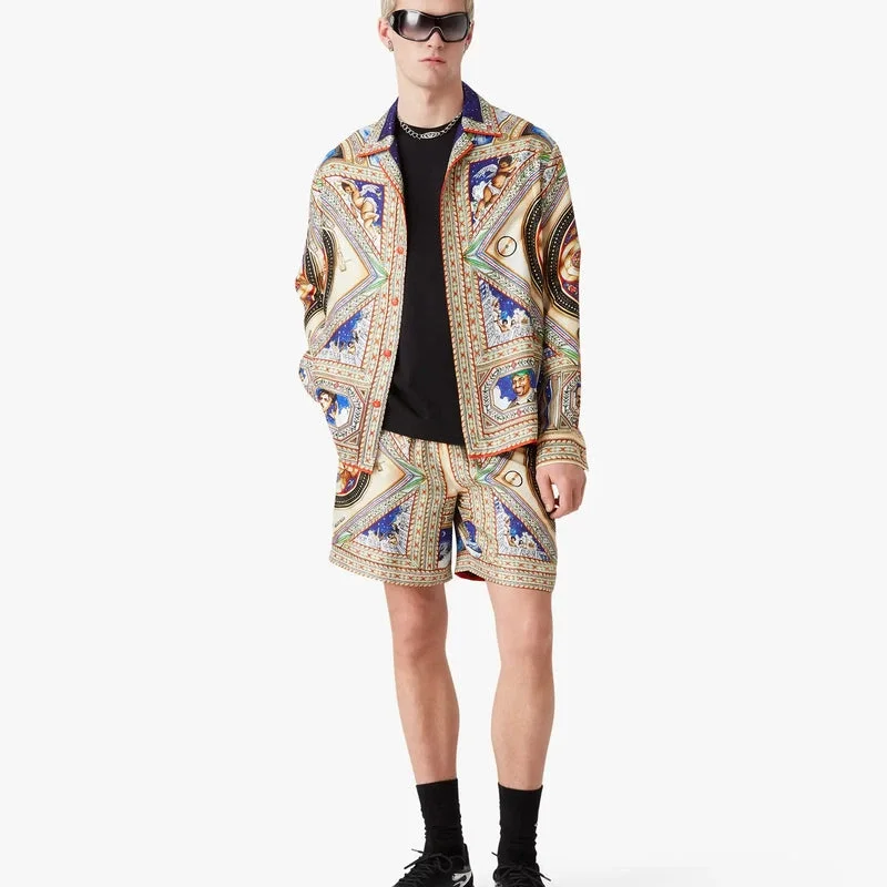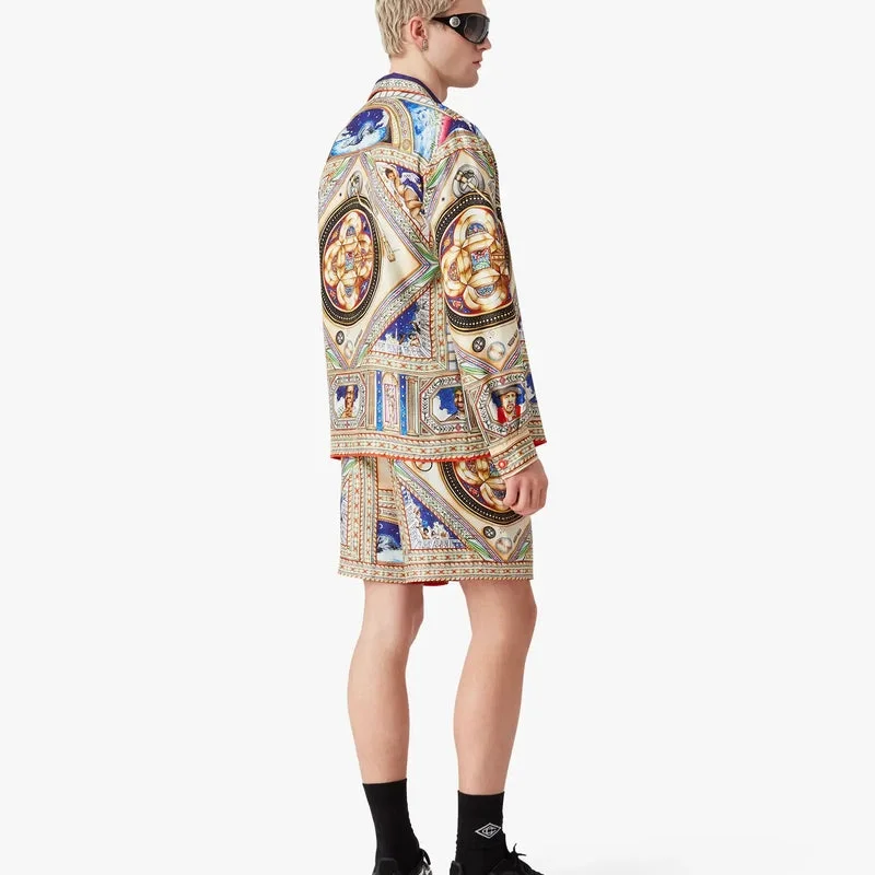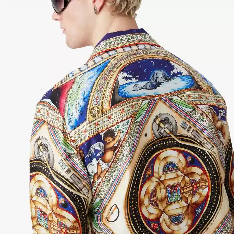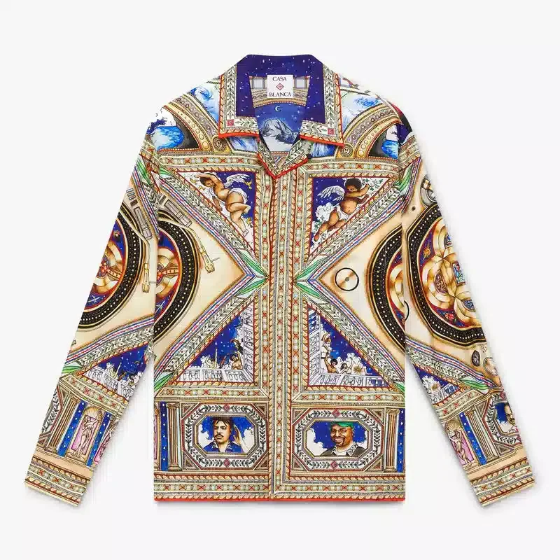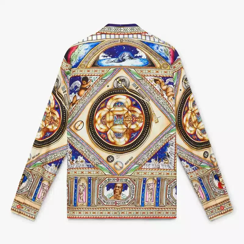 Het Plafond Orne De Musique zijden overhemd met lange mouwen heeft een all-over print met kunstwerken geïnspireerd op de gedetailleerde en ingewikkelde beschilderde renaissanceplafonds die de tijdloze thema’s van muziek en dans uitbeelden. Afgewerkt met een Cubaanse kraag, knoopsluiting, in elkaar grijpende Cc-logo Corozo-knopen, een borstzak, de gouden geëmailleerde knopen van het huis op de manchetten, en details op de kraag, de knoopsluiting en de zoom.