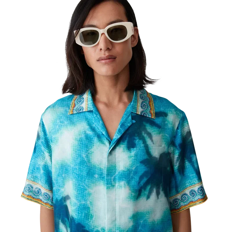 Het Poolside Emblem zijden overhemd heeft een all-over print met handgeschilderde scènes die speciaal voor de collectie zijn ontworpen en is vervaardigd van zijden twill. Afgewerkt met een knoopsluiting aan de voorkant, in elkaar grijpende Cc-logo knopen van corozo, een borstzak, een Cubaanse kraag en op Grieks mozaïek geïnspireerde randdetails op de kraag, manchetten en zoom.