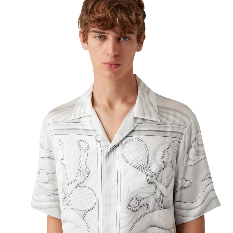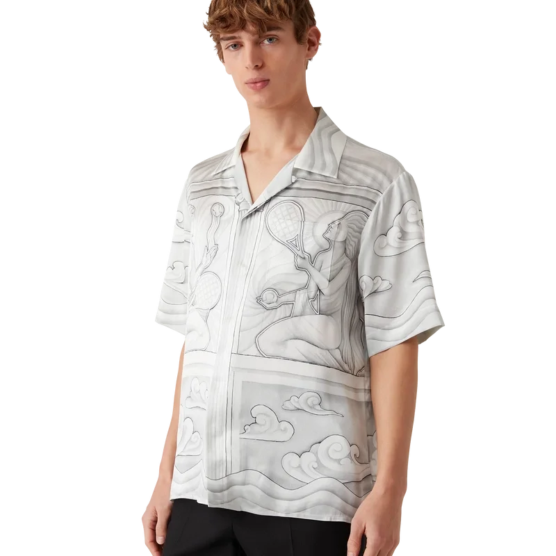 Het Sacred Stone zijden overhemd is een ontwerp met korte mouwen en een all-over print, vervaardigd uit zijden satijn, met het seizoensgebonden kunstwerk van het huis, geïnspireerd op het steeneffect van trompe-l’oeil met lichte tekeningen.