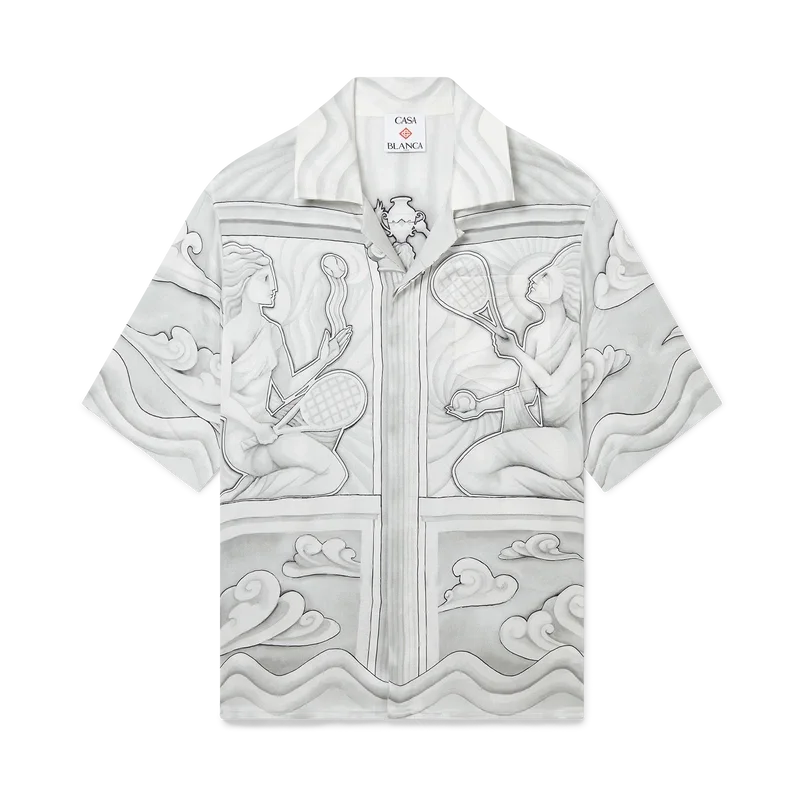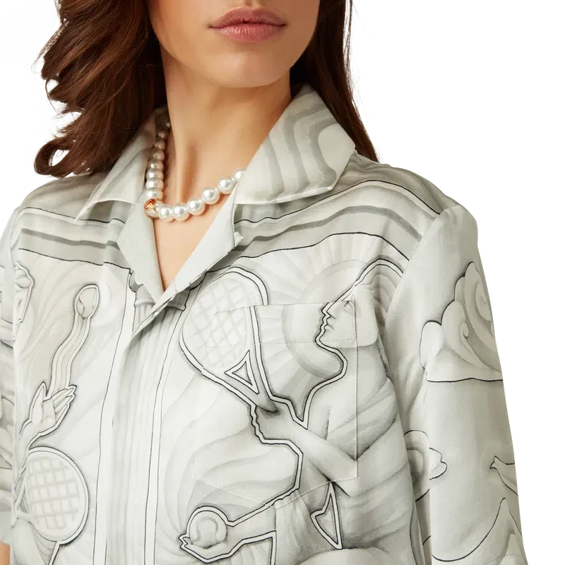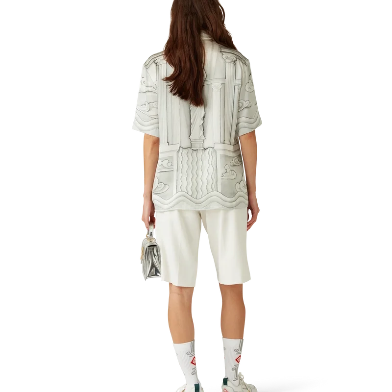 Het Sacred Stone zijden overhemd is een ontwerp met korte mouwen en een all-over print, vervaardigd uit zijden satijn, met het seizoensgebonden kunstwerk van het huis, geïnspireerd op het steeneffect van trompe-l’oeil met lichte tekeningen. Afgewerkt met een Cubaanse kraag, knoopsluiting en in elkaar grijpende CC-logo Corozo-knopen<!–