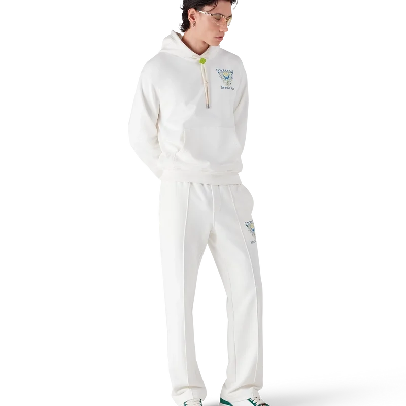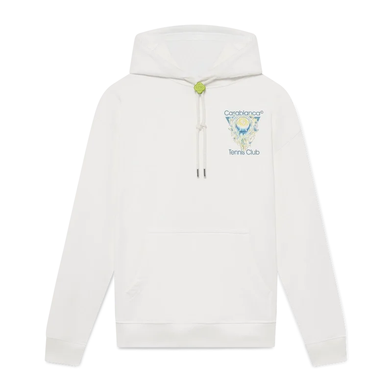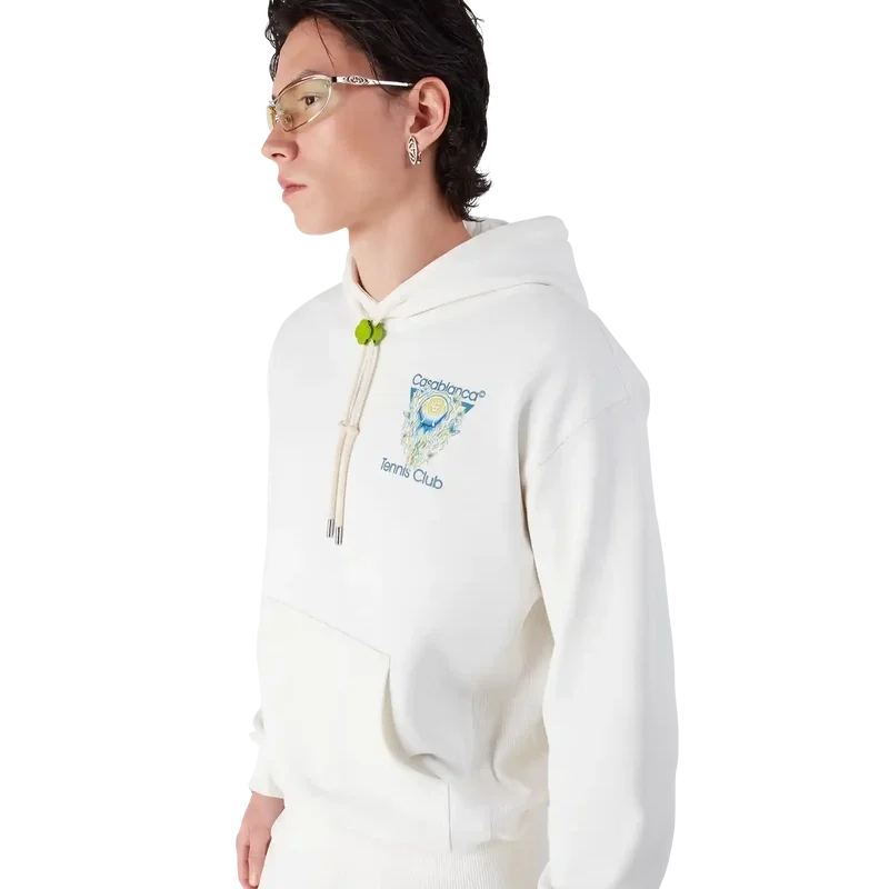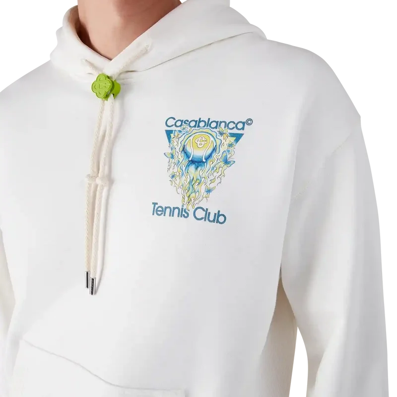 Het Tennis Club Icon-sweatshirt met capuchon is een verfijnd sportkledingontwerp met een afbeelding van het kenmerkende tennisballogo van het huis in vlucht, dat de fundamentele balans tussen kracht, snelheid en controle weerspiegelt. Afgewerkt met een trekkoordsluiting, een capuchon, geribde manchetten en zoom, en een kangoeroezak.