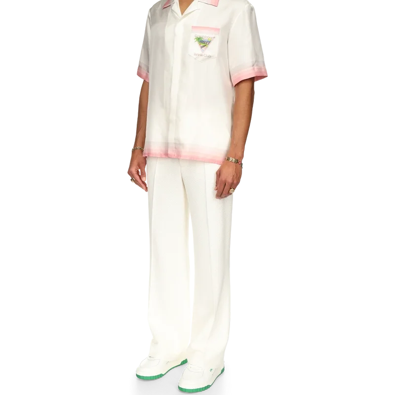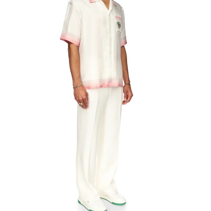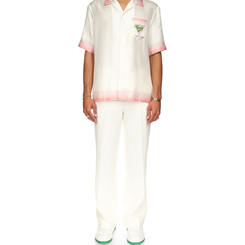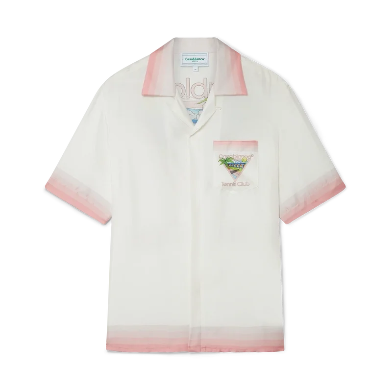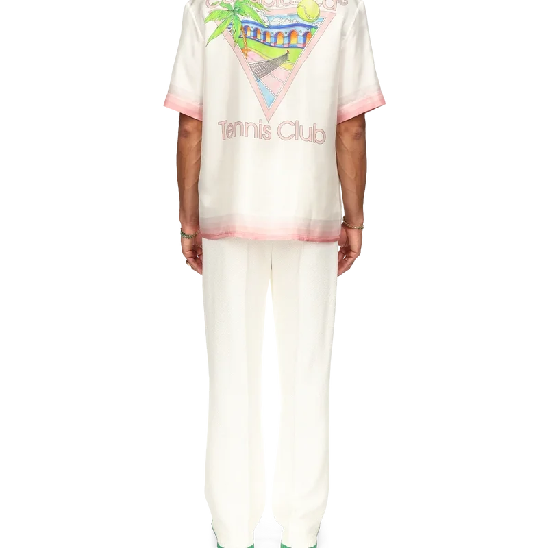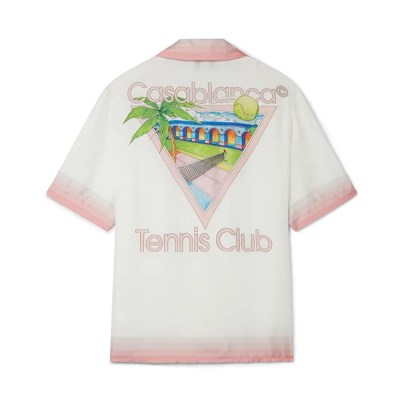 Het Tennis Club Icon zijden overhemd is een bedrukt ontwerp met korte mouwen, voorzien van het kenmerkende artwork van het huis, opnieuw geïnterpreteerd voor dit seizoen met elementen uit tennis, de natuur en architectuur. Dit kledingstuk is vervaardigd uit zijdesatijn en is afgewerkt met details in de vorm van strepen met kleurverloop op de kraag, manchetten, zoom en borstzak, een knoopsluiting en een Casablanca-merklabel – Ontworpen voor een relaxte pasvorm.