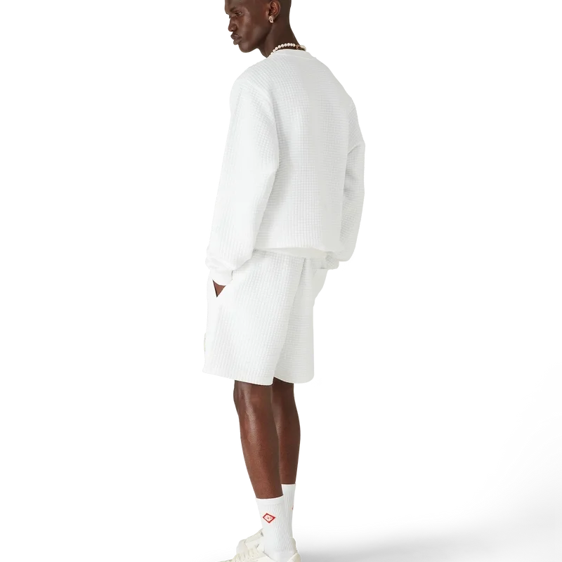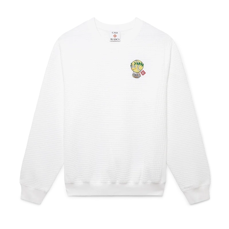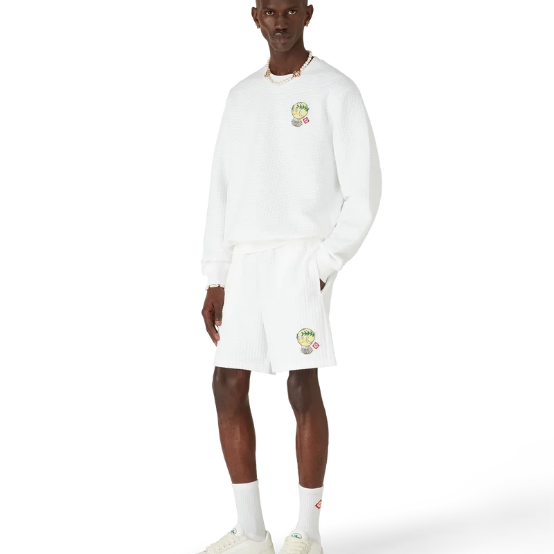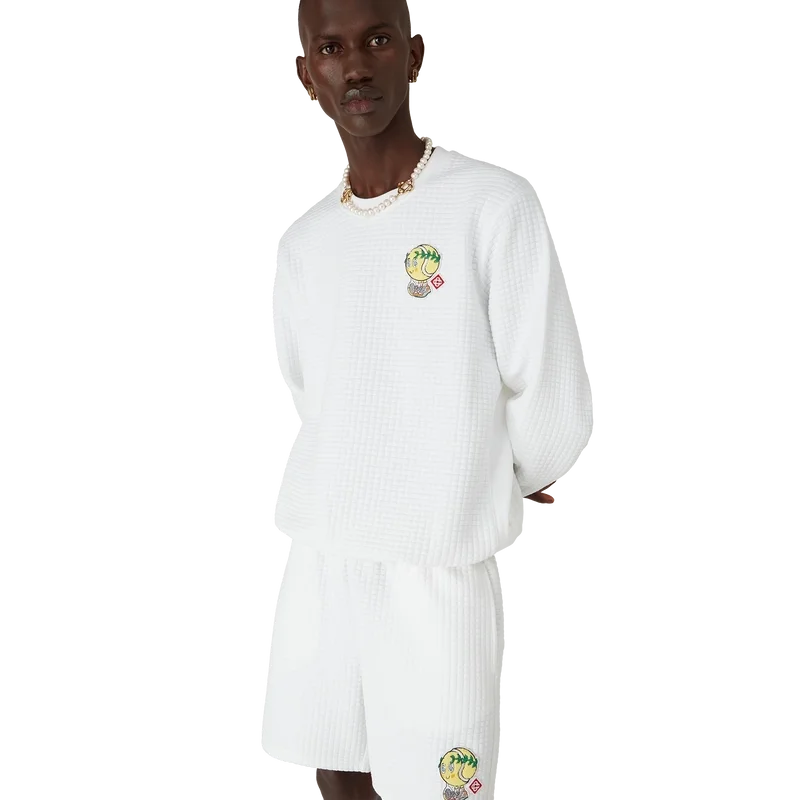 Het Tennis Mascot gewatteerde sweatshirt is een geborduurd ontwerp met lange mouwen, vervaardigd van een gewatteerde stof met rasterpatroon en voorzien van seizoensgebonden illustraties van de Kawaii-tennisbal – dit personage is een belangrijk onderdeel van ons universum. Het bevat elementen zoals het laurierblad, de Atlantis-sneaker, het racket en de Kawaii-ogen. We hebben ervoor gekozen om dit personage centraal te stellen in alle herenmodellen van de collectie. Afgewerkt met een klassieke ronde hals.<!–