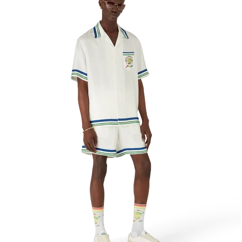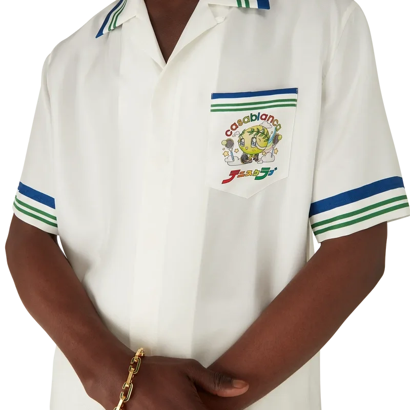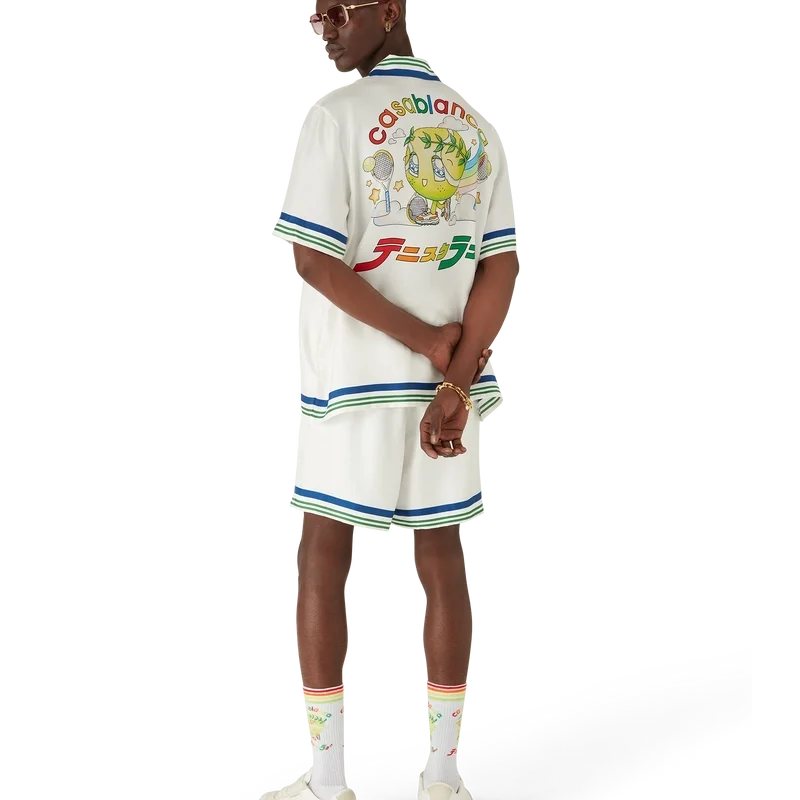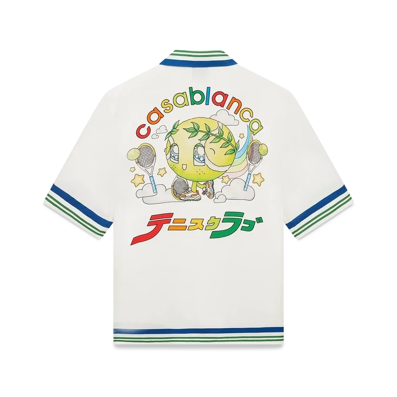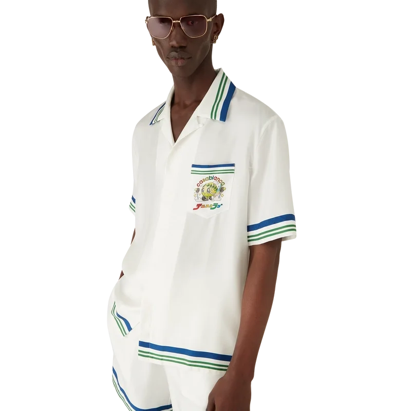 Het Tennis Mascot zijden twill Short-sleeve shirt heeft een print met seizoensgebonden illustraties van de Kawaii-tennisbal – dit personage is een belangrijk onderdeel van ons universum. Het bevat elementen zoals het laurierblad, de Atlantis-sneaker, het racket en de Kawaii-ogen. We hebben ervoor gekozen om dit personage centraal te stellen in alle herenmodellen van de collectie. Afgewerkt met een Cubaanse kraag, knoopsluiting, Corozo-knopen met het Cc-logo, een borstzakje en blauw, wit en groen gestreepte randen op de kraag, manchetten, zoom en zak.