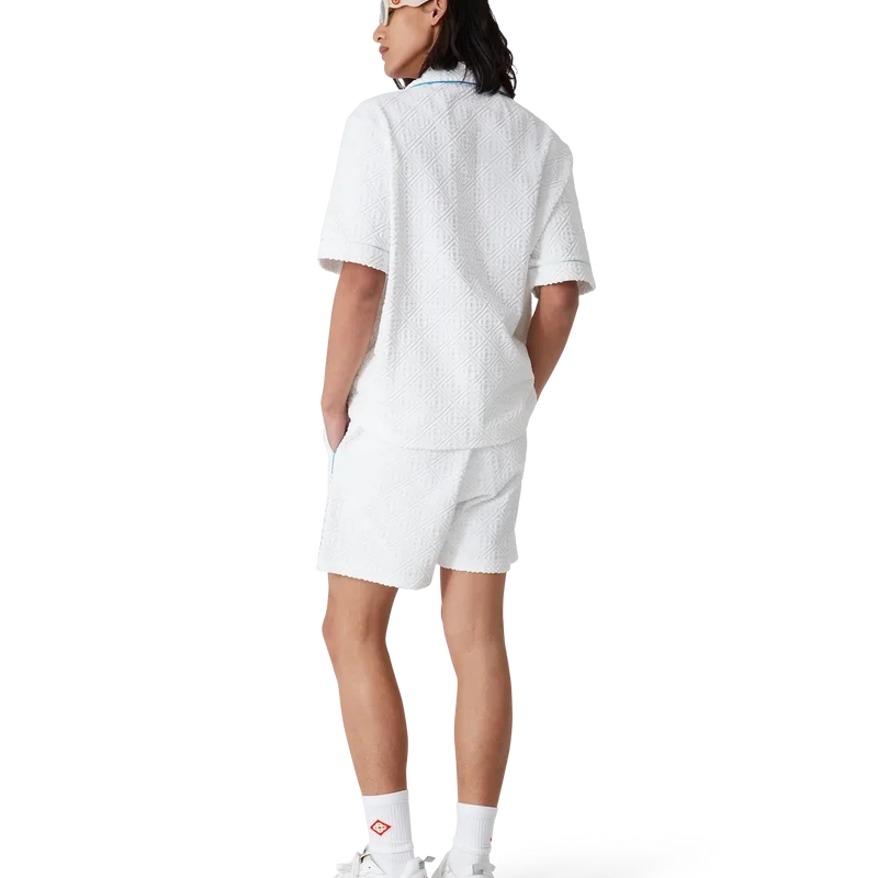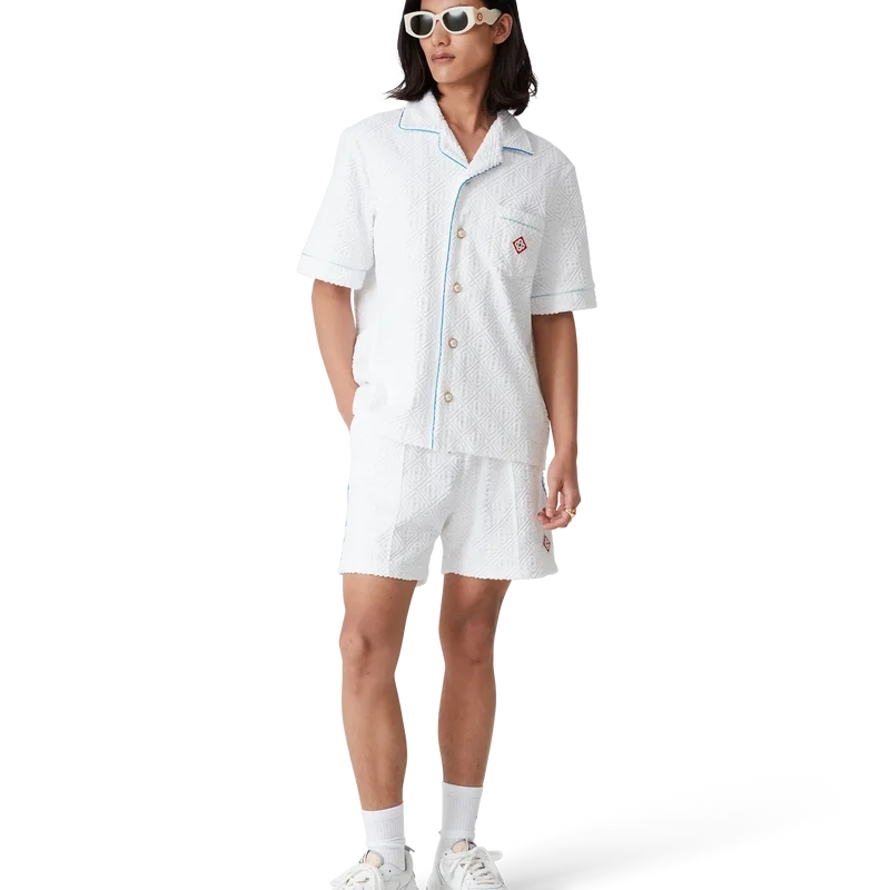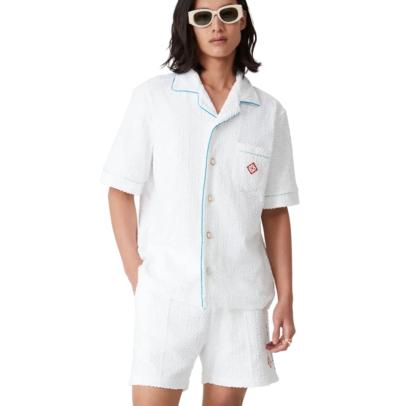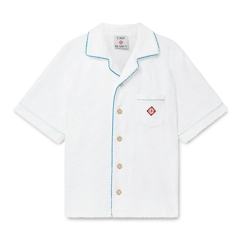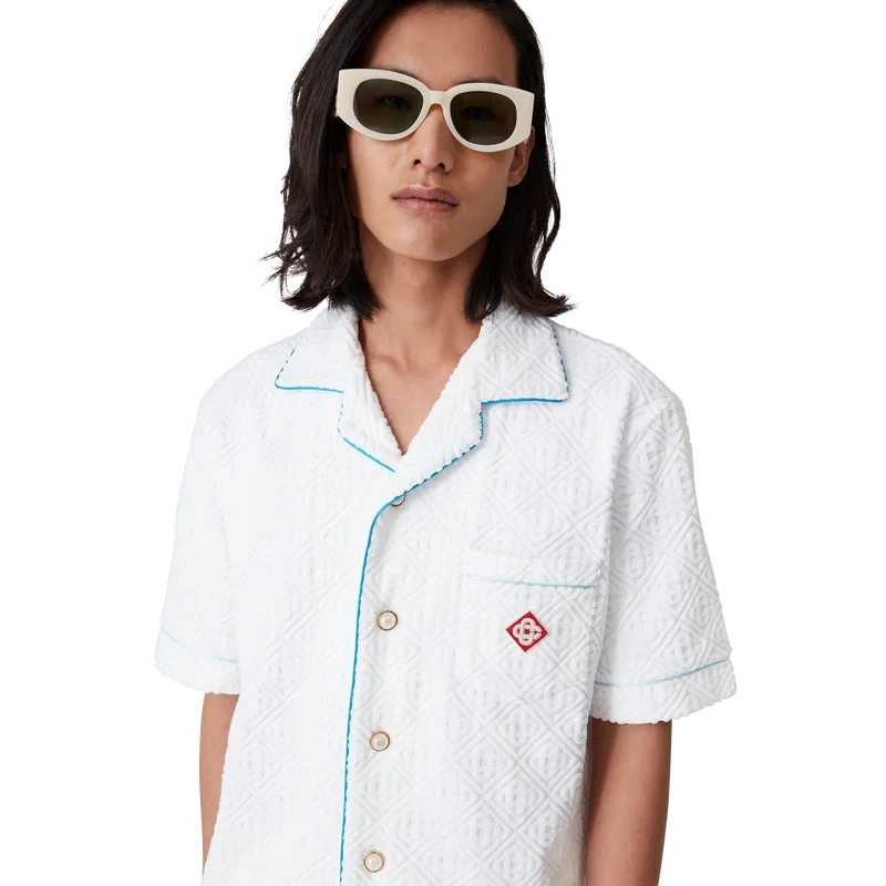 Het badstof overhemd met tennisstripes is een ontwerp met korte mouwen, vervaardigd uit monogram badstof met het diamantlogo van het huis. Afgewerkt met knoopsluiting, de kenmerkende gouden parelknopen met rand van het huis, een borstzak en biezen op de kraag, mouwen, borstzak en knoopsluiting.