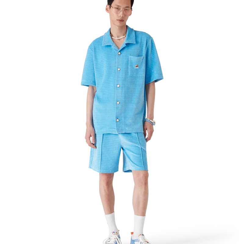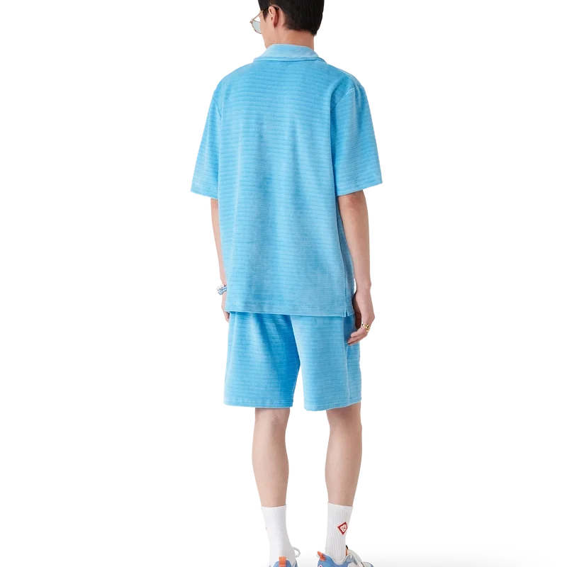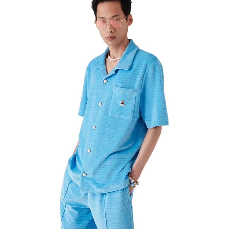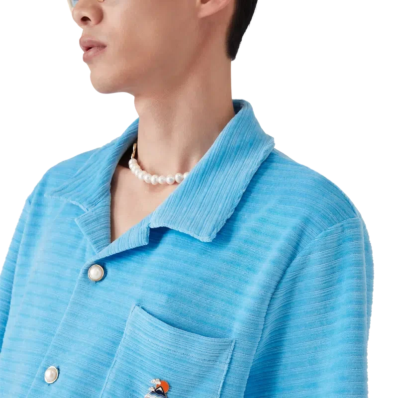 Het gestreepte velours overhemd met korte mouwen is een klassiek ontwerp, vervaardigd van gestreepte veloursstof. Afgewerkt met een Cubaanse kraag, knoopsluiting, kenmerkende parelknopen met gouden rand, een borstzak en zijsplitten.
