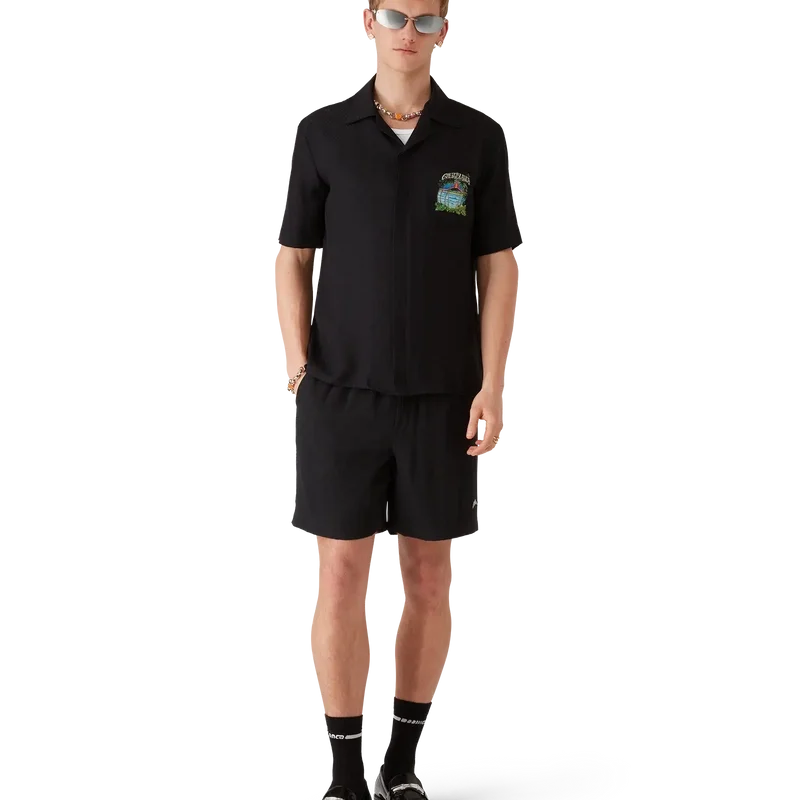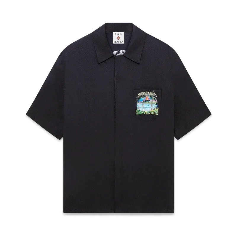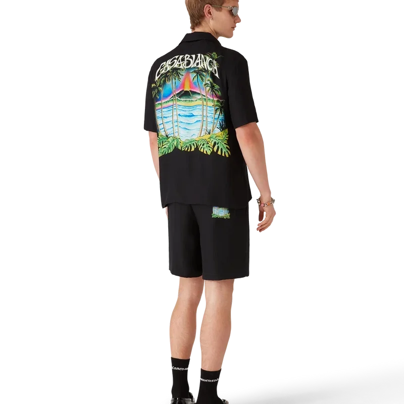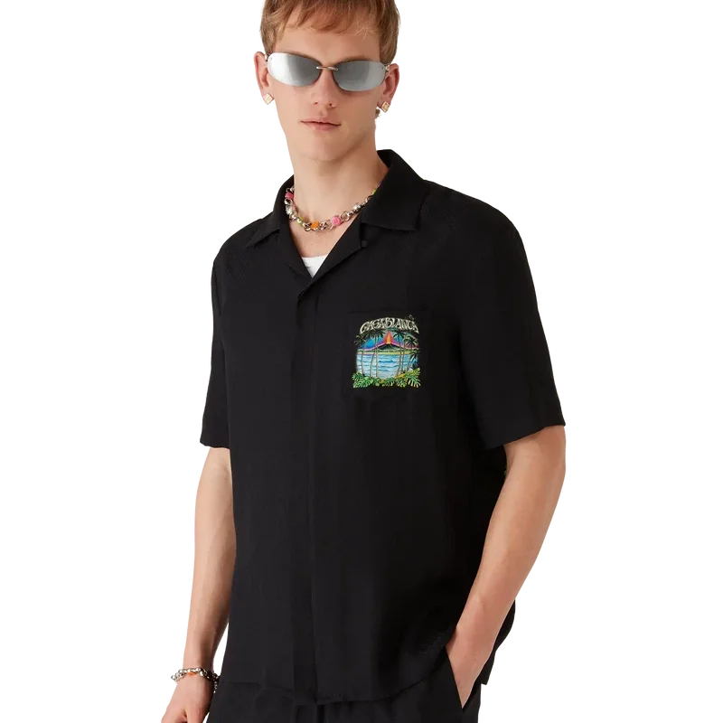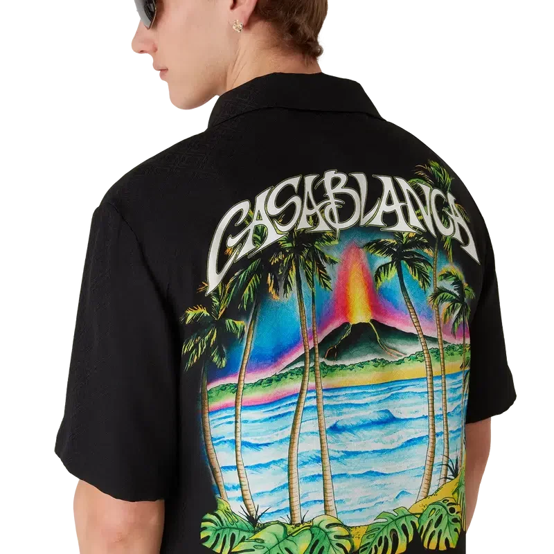 Het Volcano-overhemd met korte mouwen is een zijden ontwerp met een vulkaan die dramatisch opdoemt achter half in silhouet weergegeven palmbomen, midden in een uitbarsting, waarbij de vurige energie scherp contrasteert met het serene, rustige tafereel op de voorgrond. Afgewerkt met een borstzak, knoopsluiting, Corozo-knopen met het CC-logo en kenmerkende details die de verfijnde benadering van luxe overhemden van het merk belichamen.