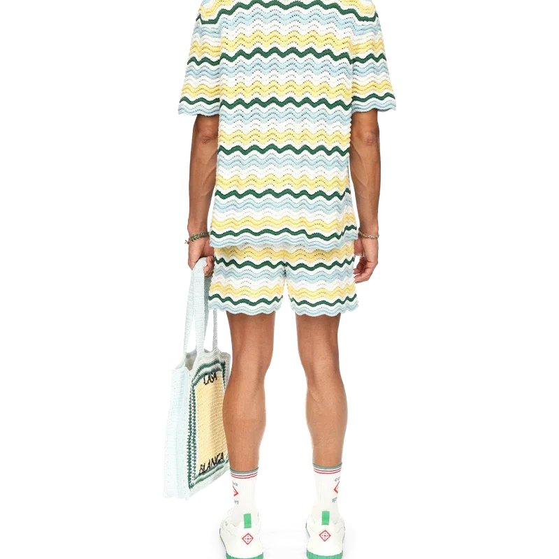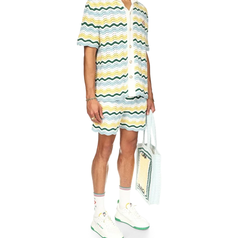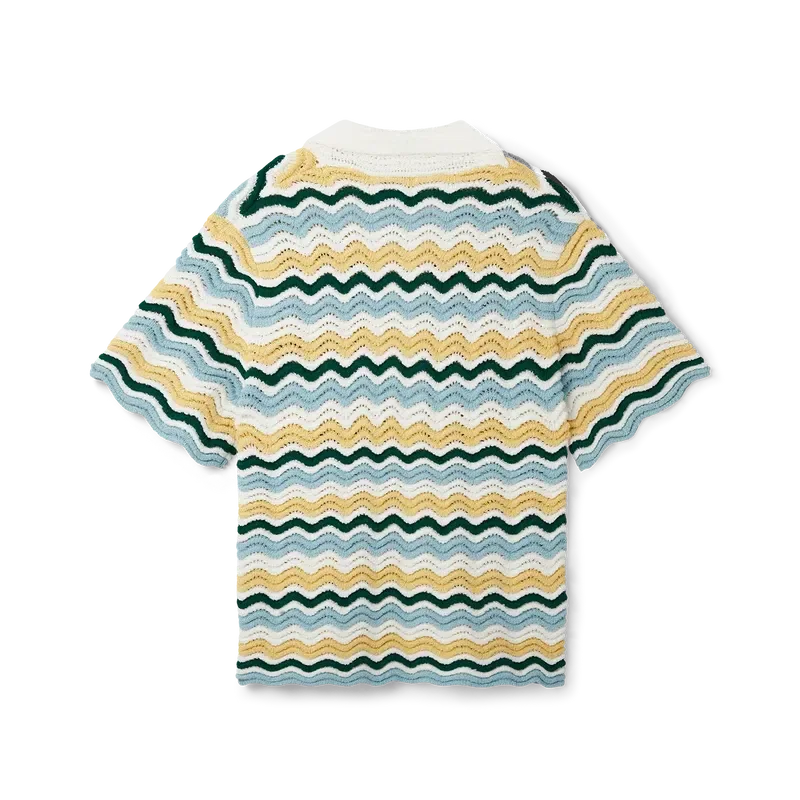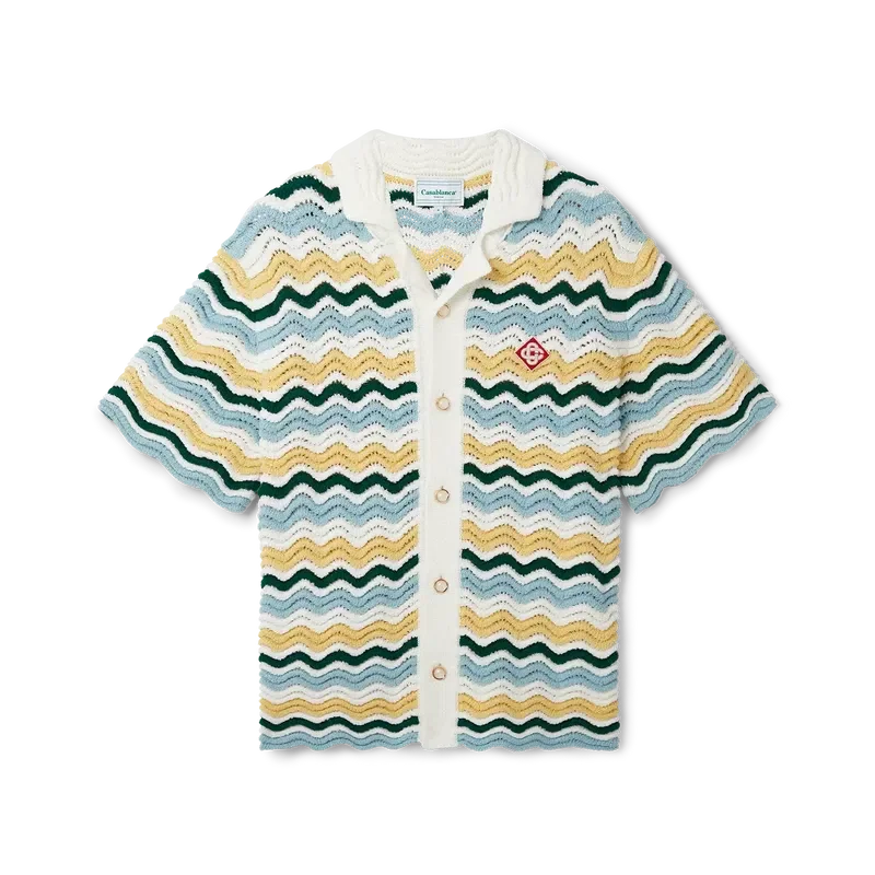 Het Wavy Boucle-overhemd is een kenmerkend Casablanca-model, vervaardigd van een zacht gestructureerde, open geweven haakstof. Afgewerkt met onze kenmerkende gouden parelknopen, open kraag, korte mouwen en het Casablanca Paris-merklabel – ontworpen om te dragen met een klassieke pasvorm.